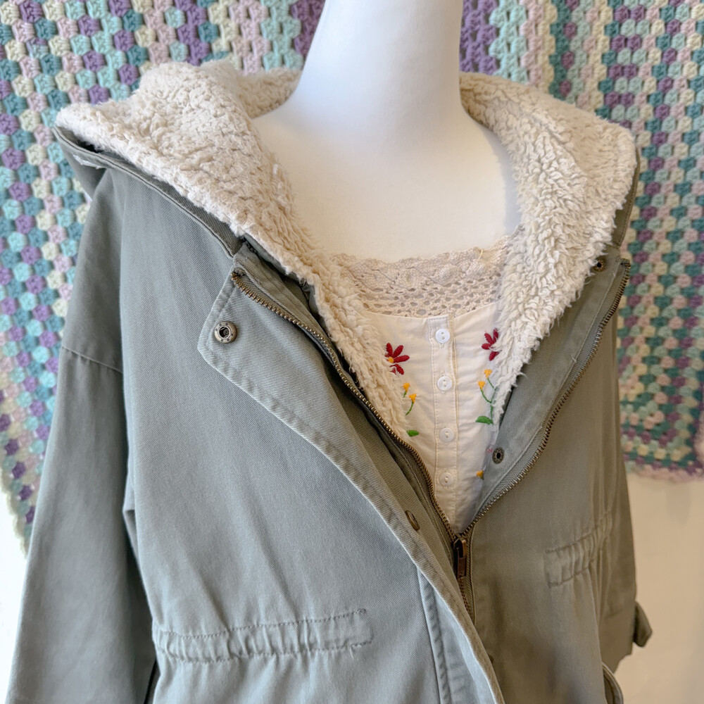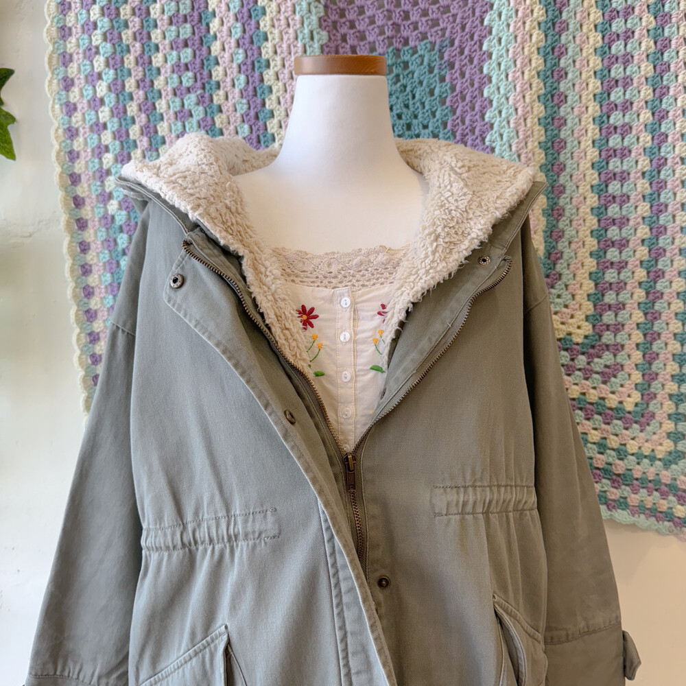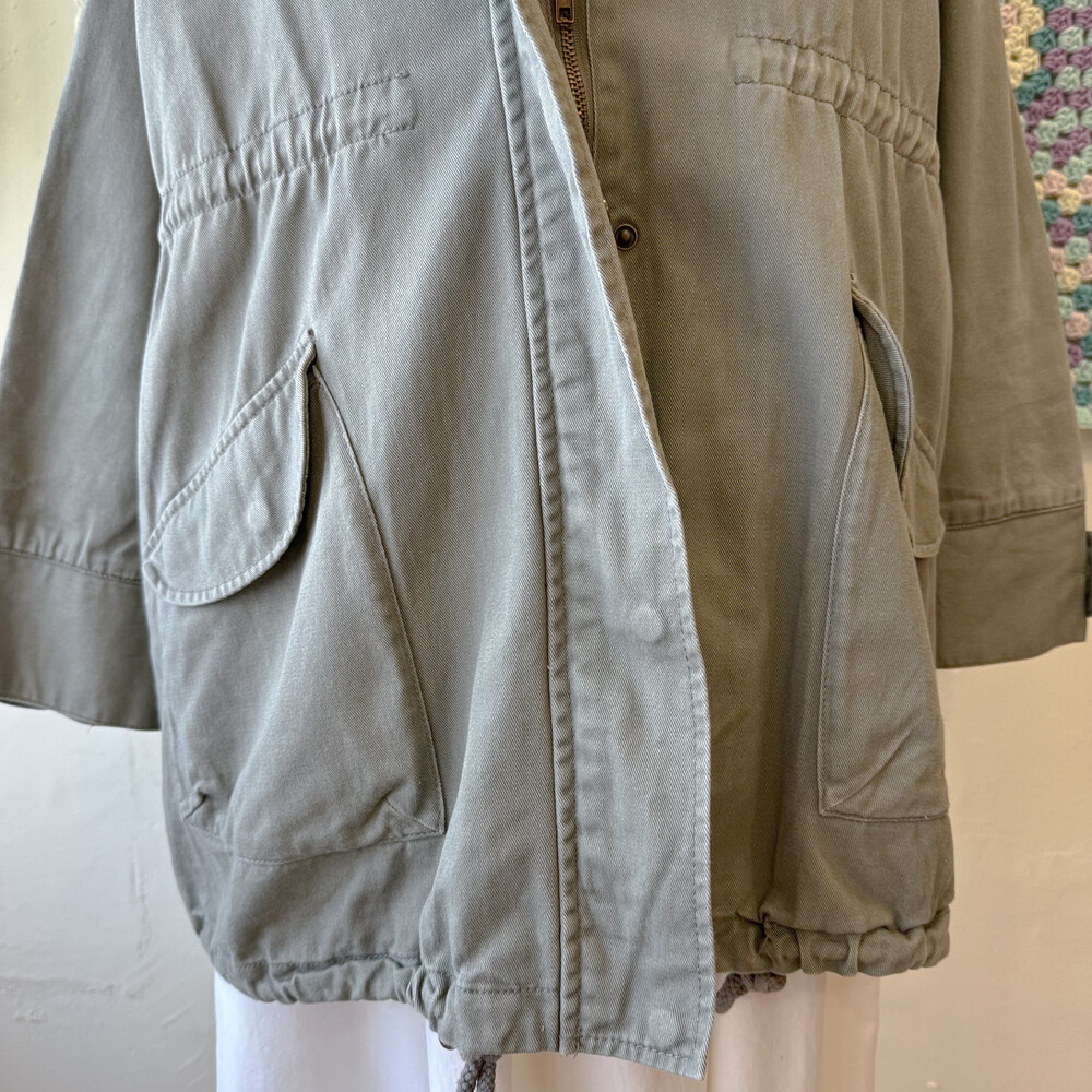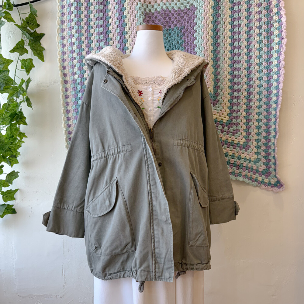 빈티지한 분위기의 연카키 색감 후드 야상이에요