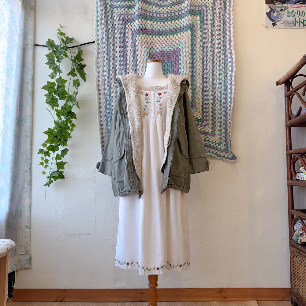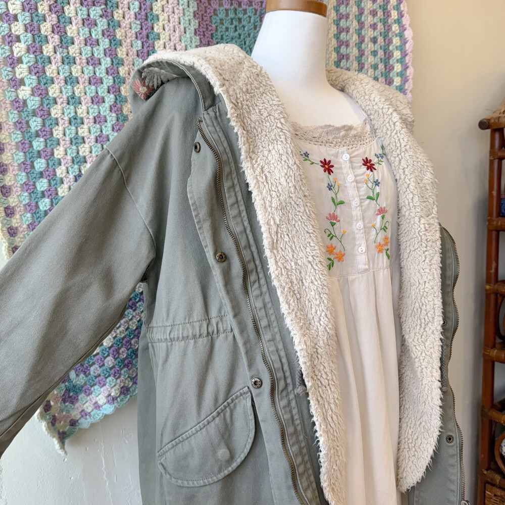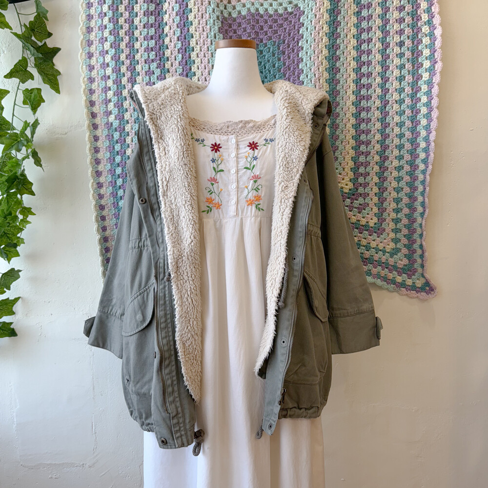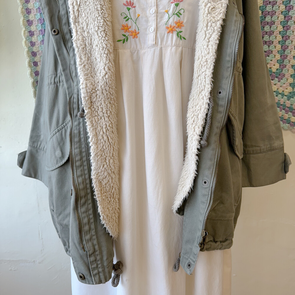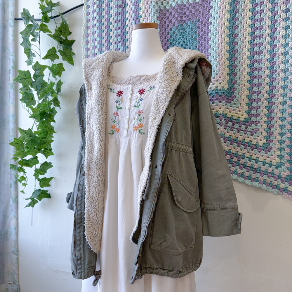 빈티지한 분위기의 연카키 색감 후드 야상이에요