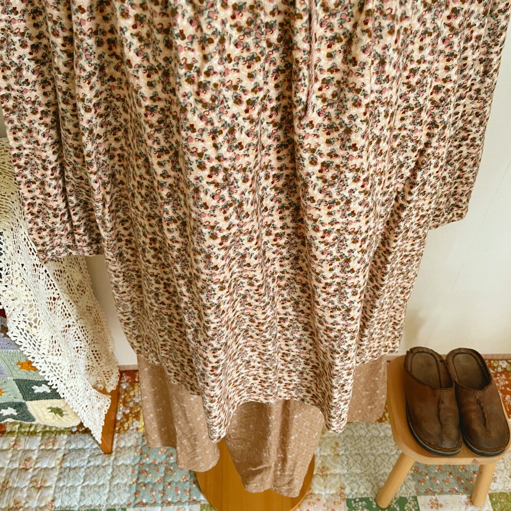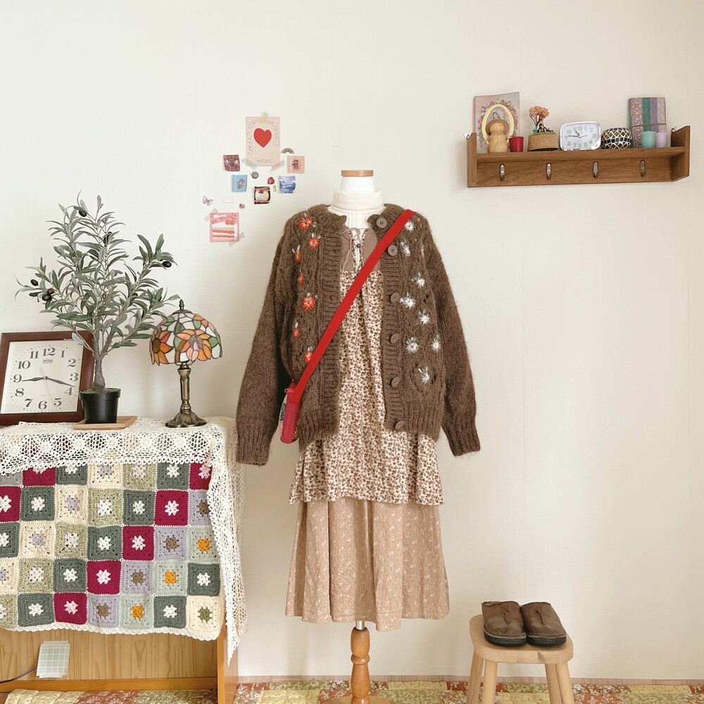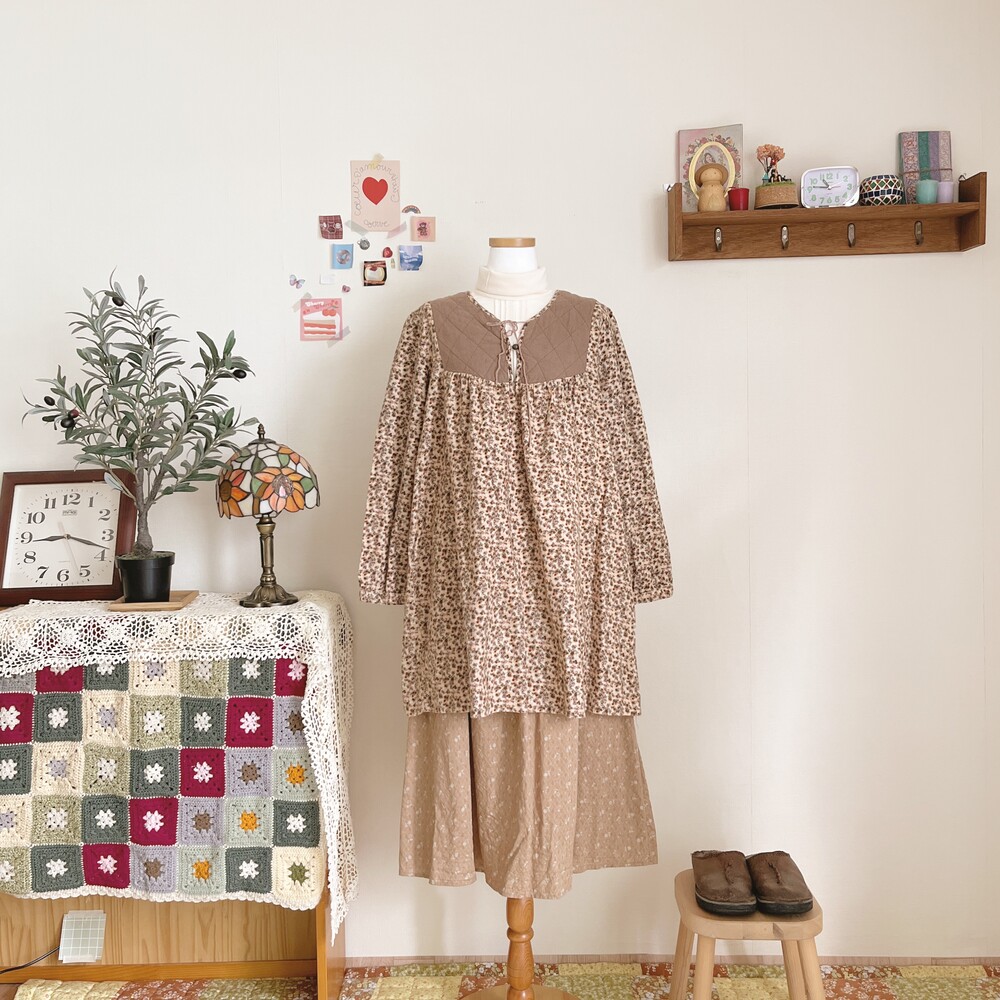 브라운 색감 베이스의 퀼트 포인트 원피스예요