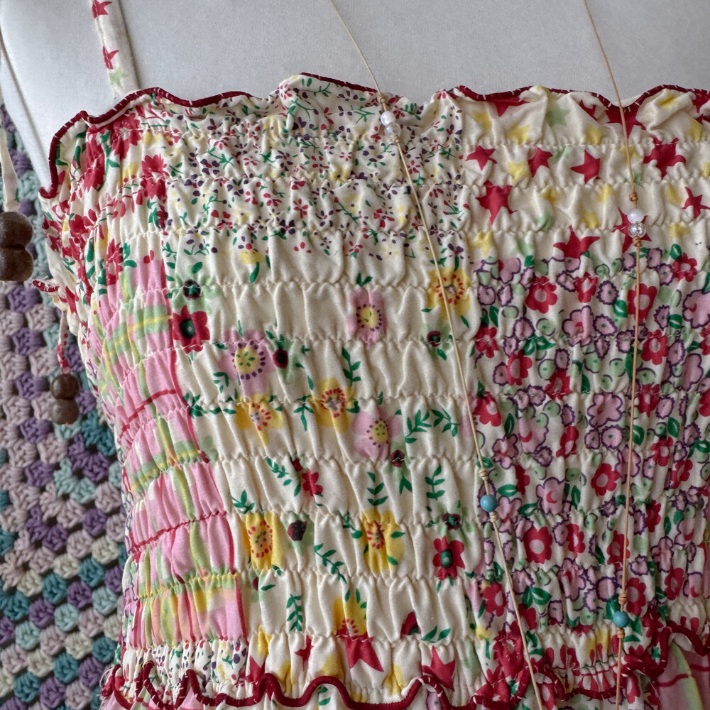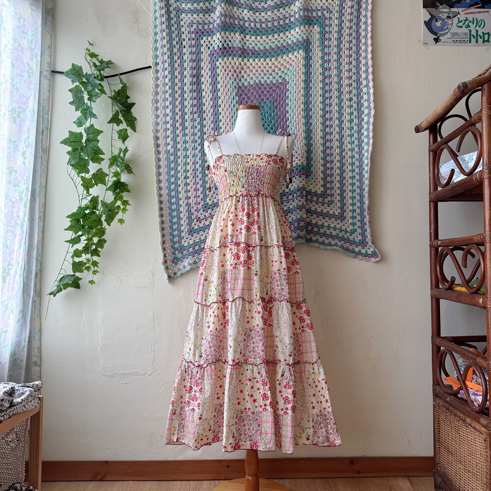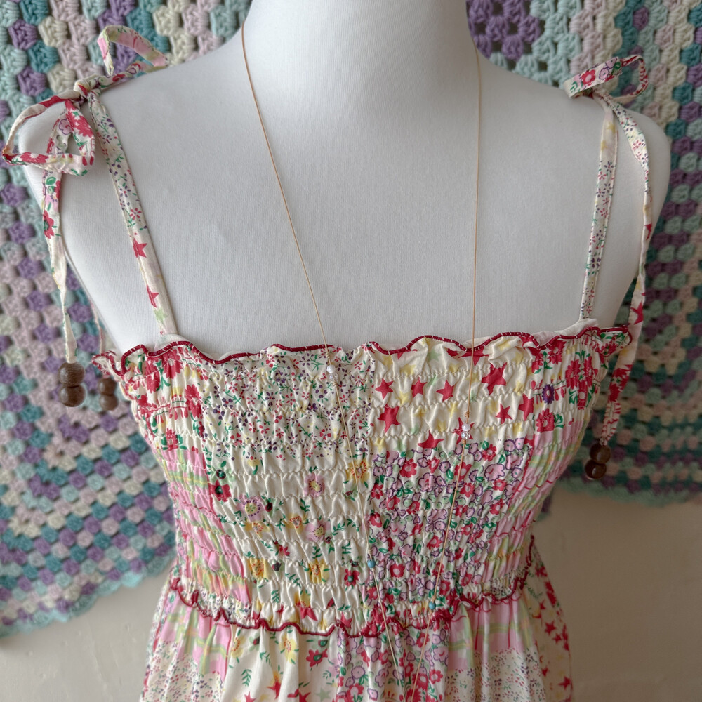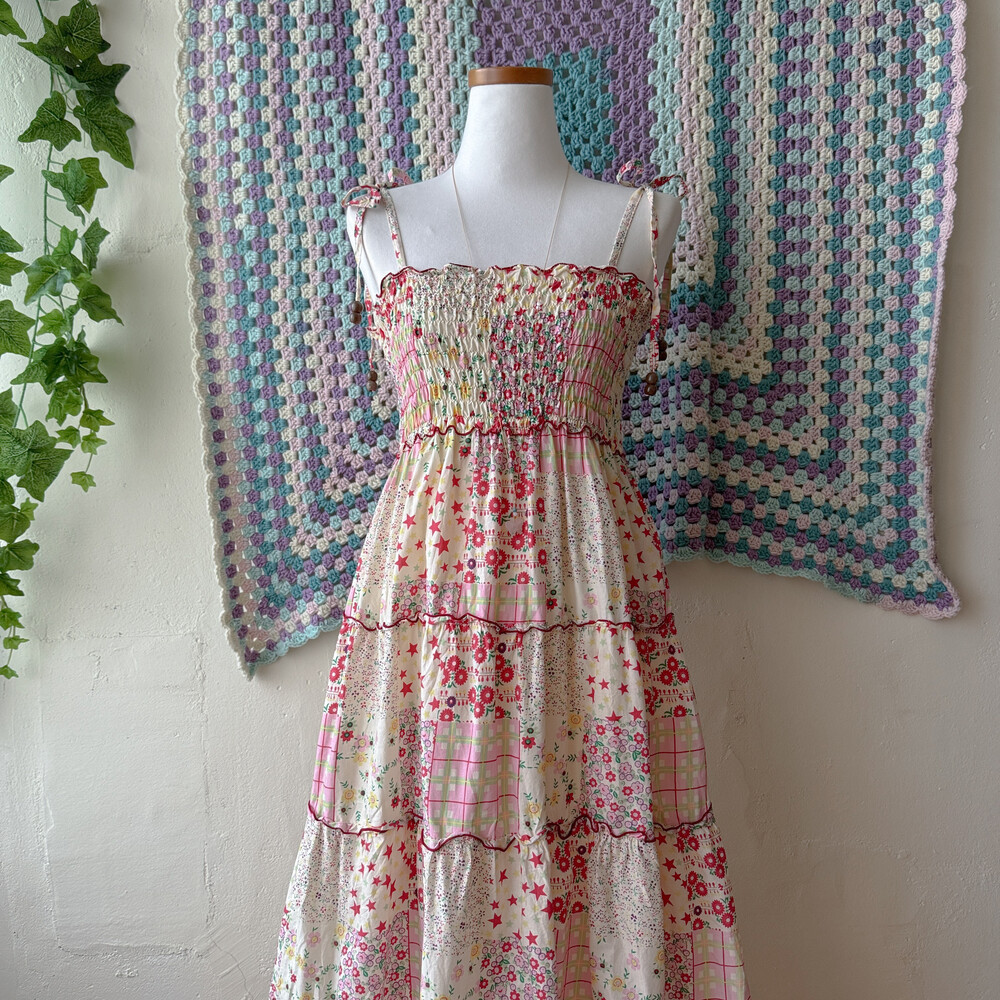 핑크색의 꽃무늬, 별 패턴의 프릴 캉캉 원피스예요