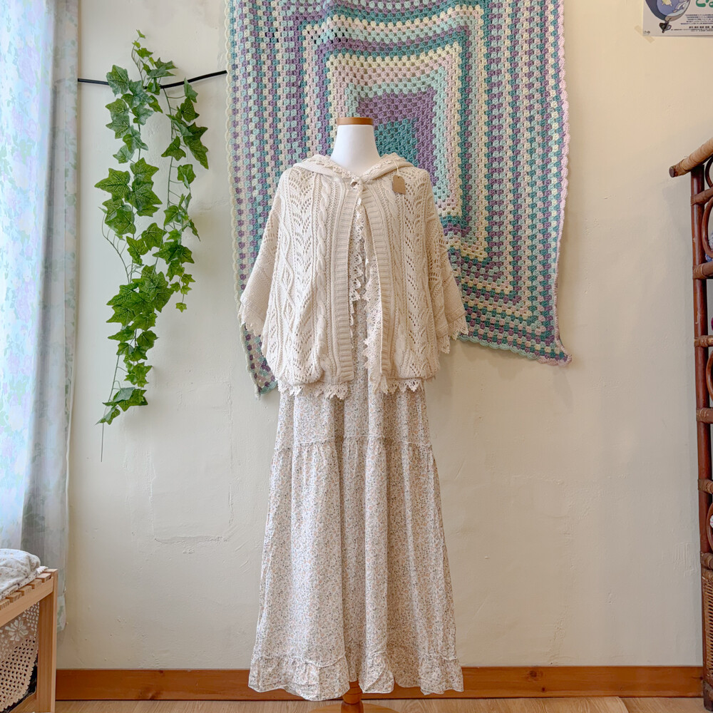 아이보리 색감의 후드 판초(케이프) 가디건이에요