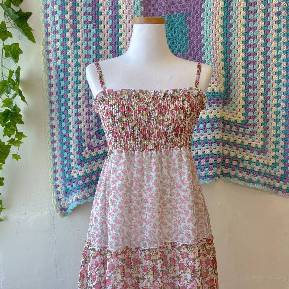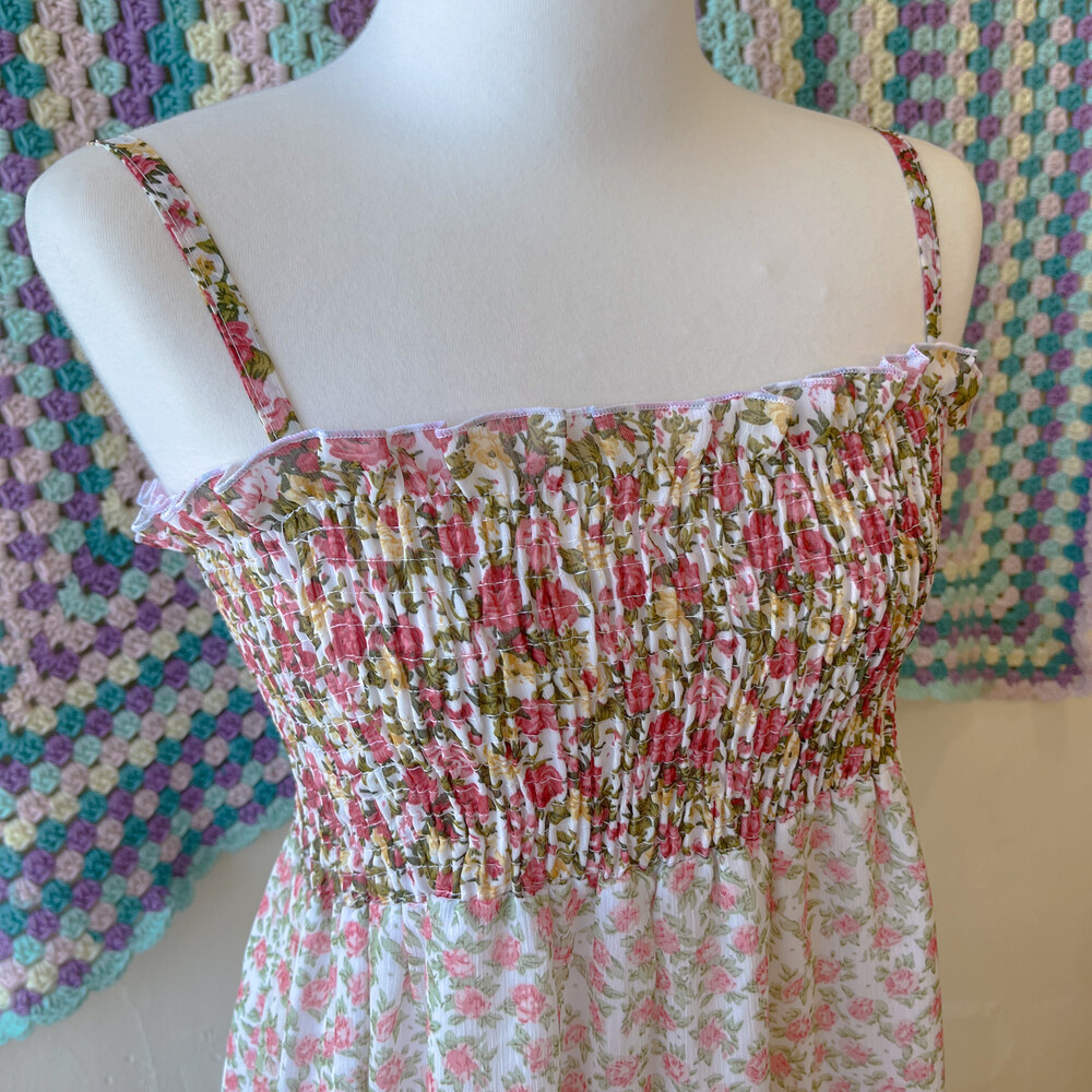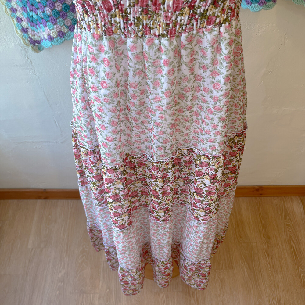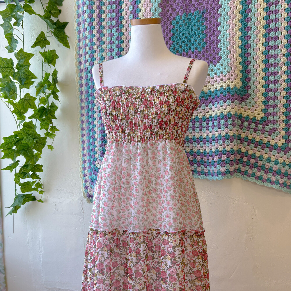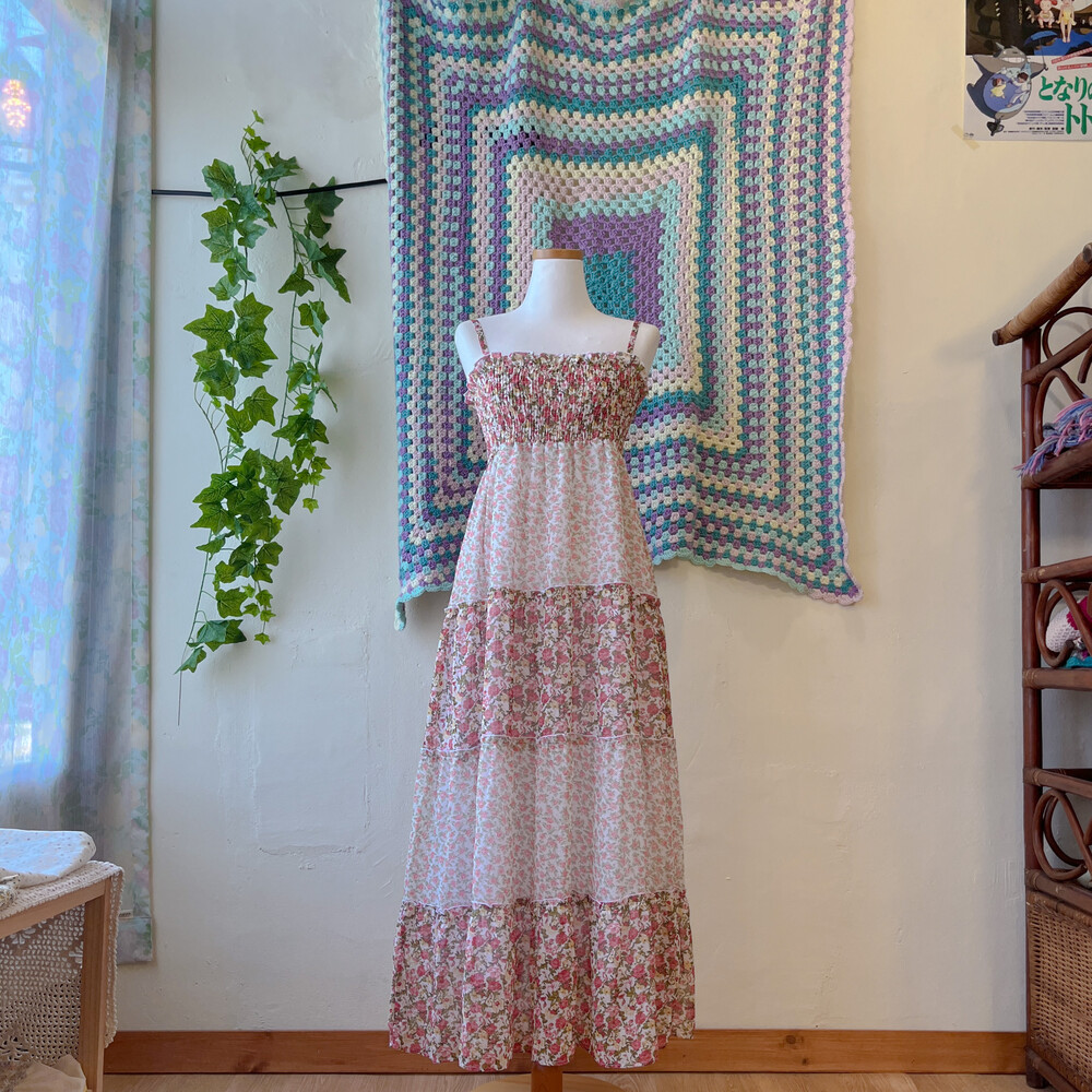 분홍 로즈 패턴의 쉬폰 끈원피스예요