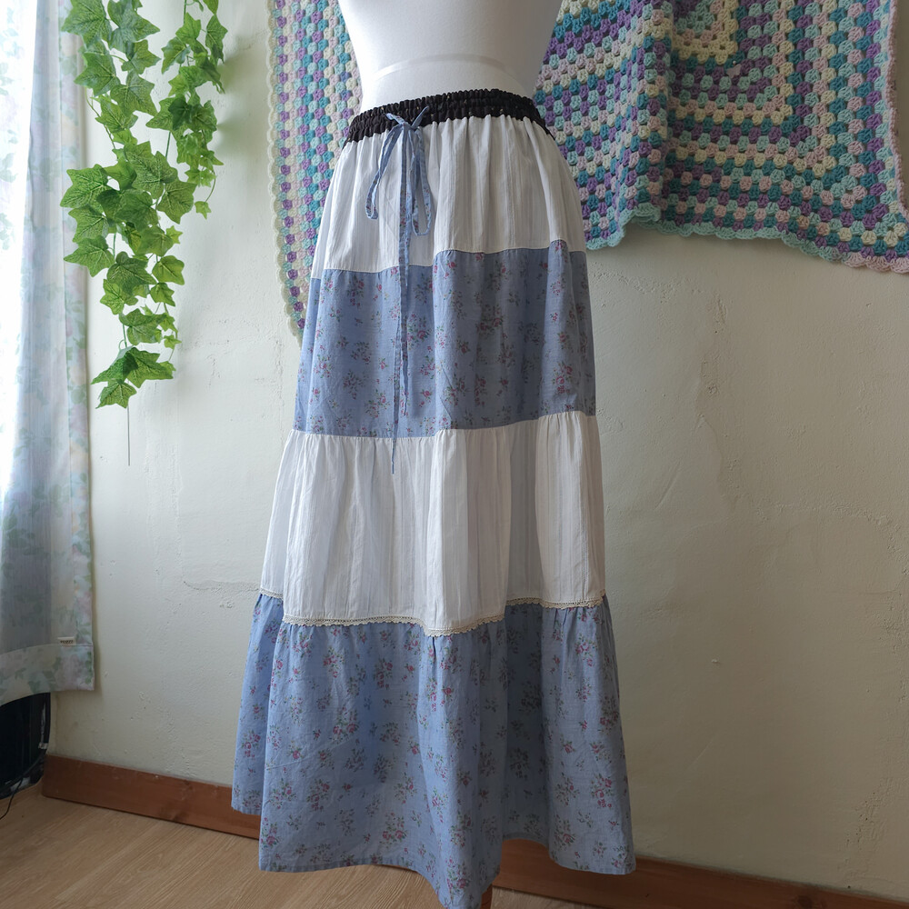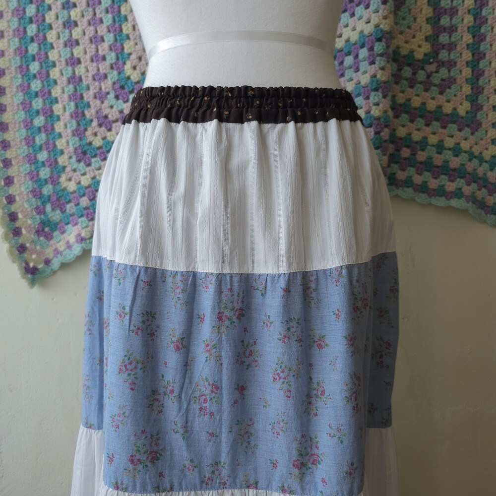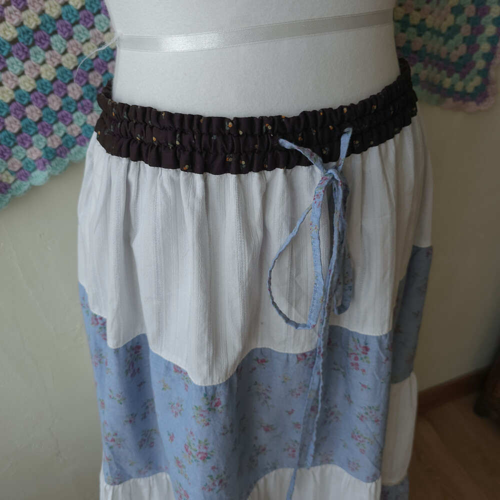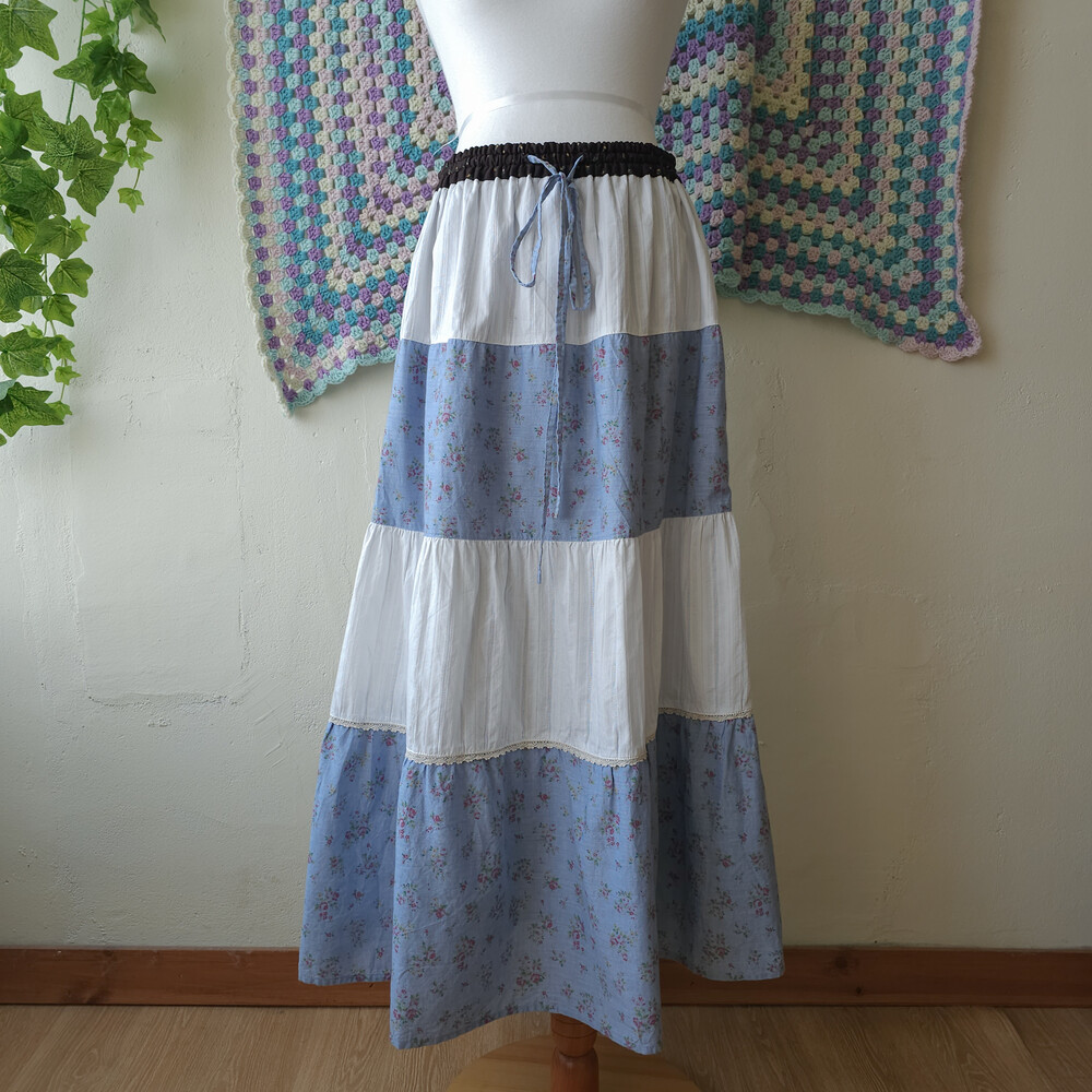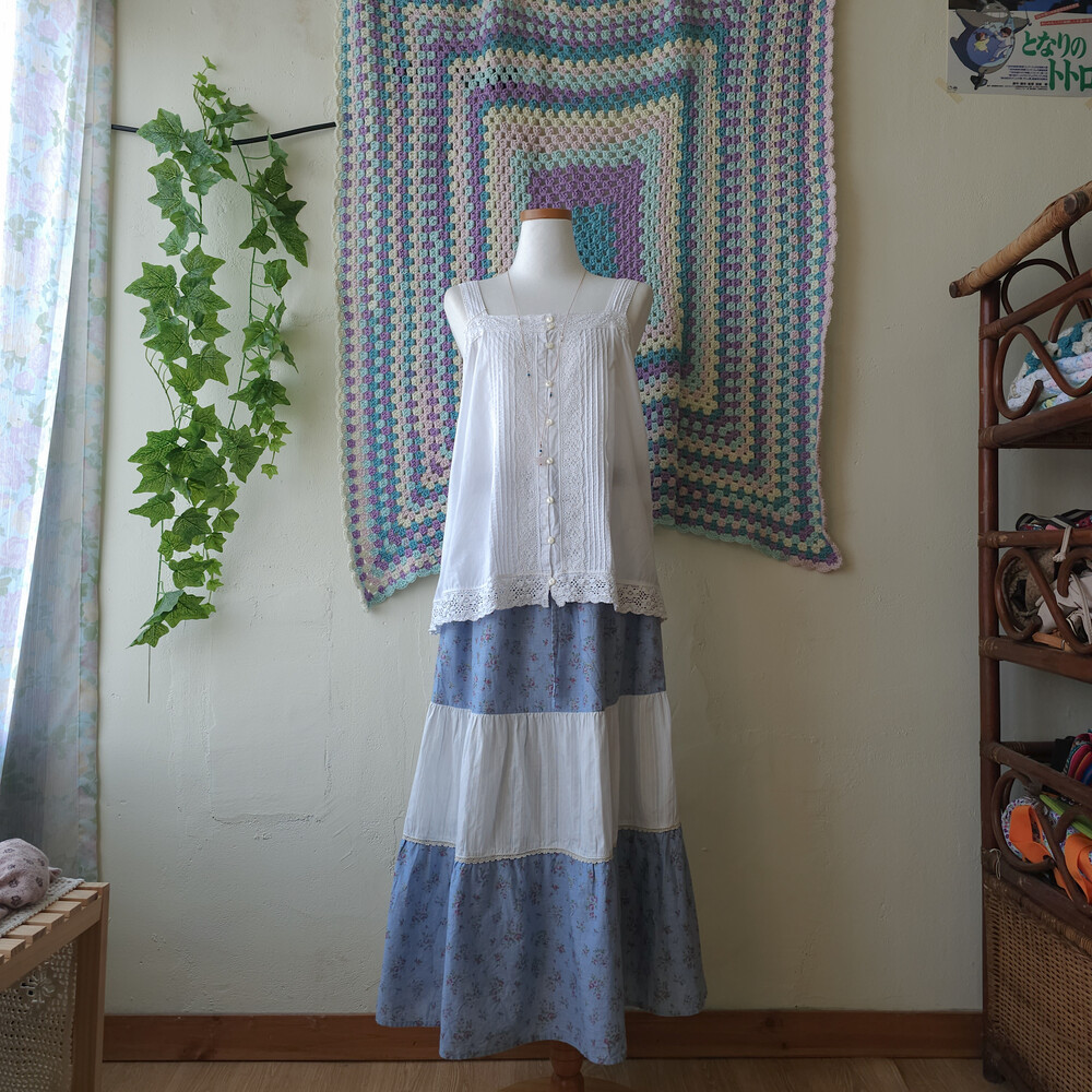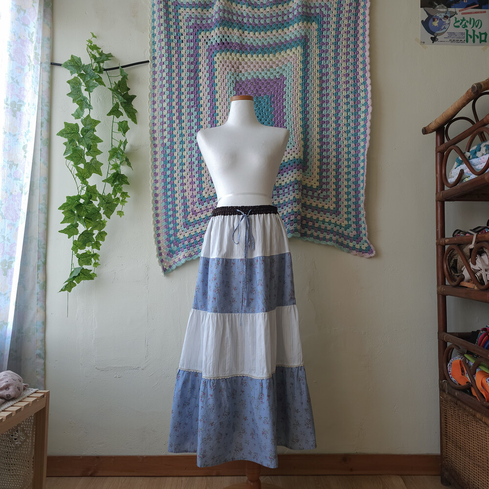 화이트, 블루 색감 조합의 패치워크 스커트예요