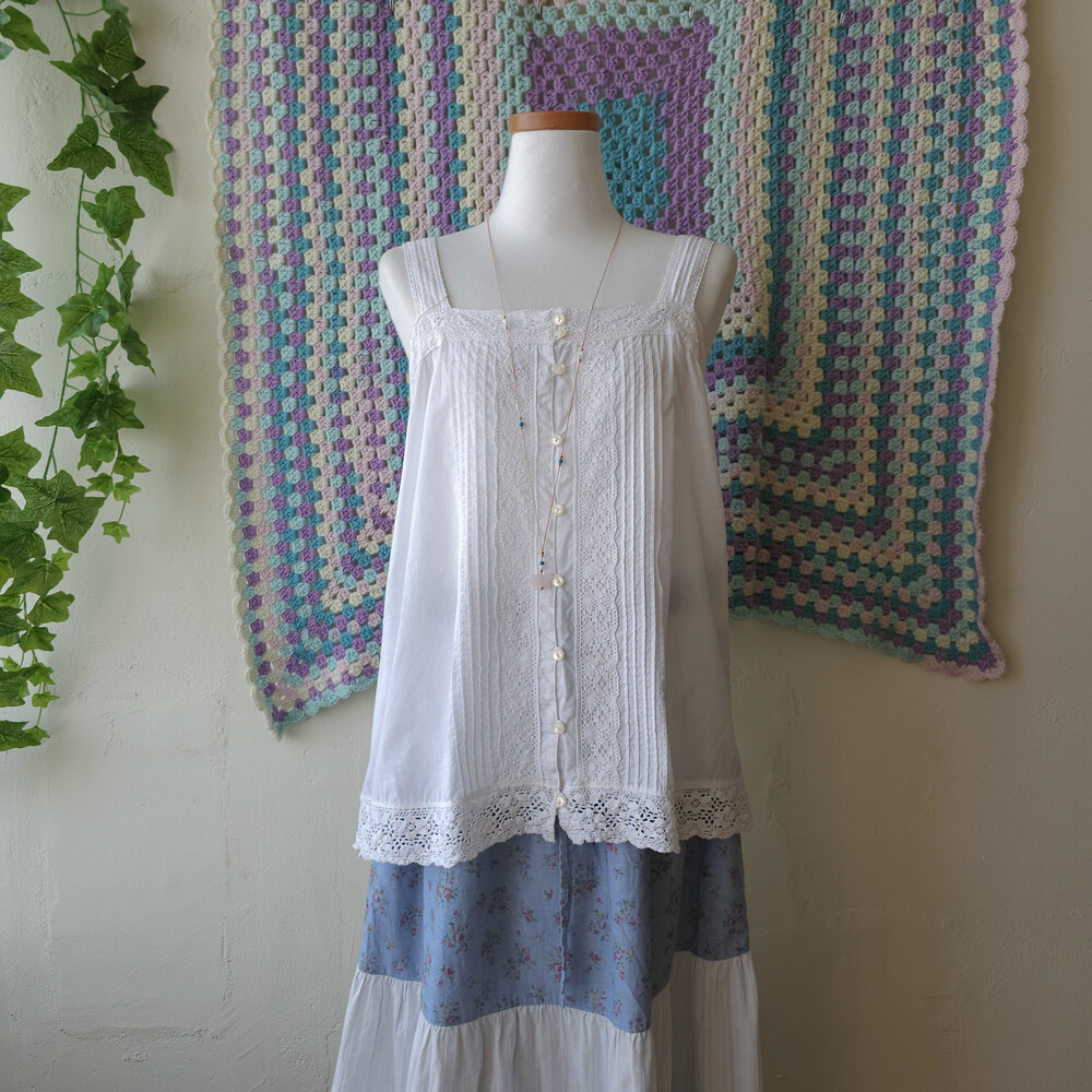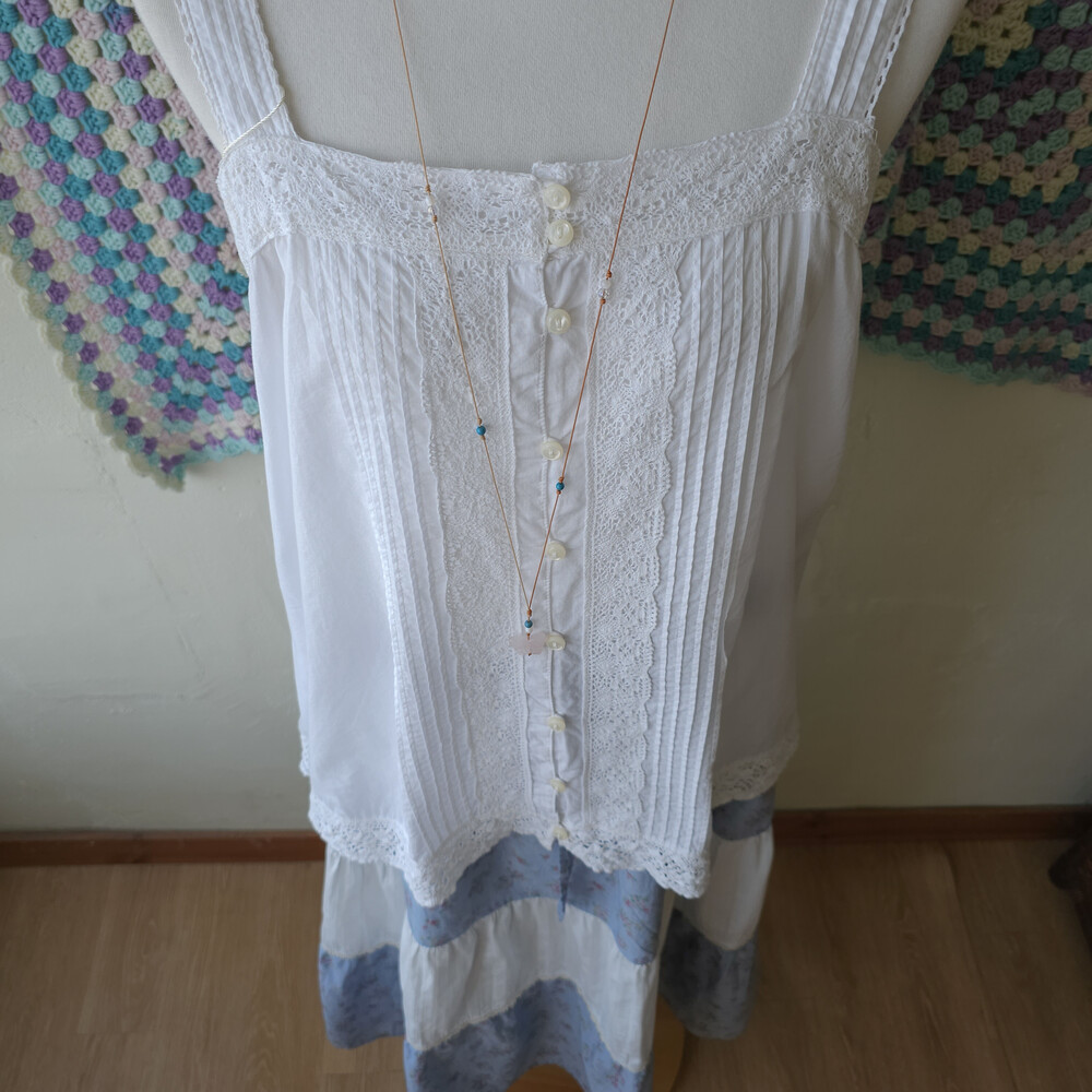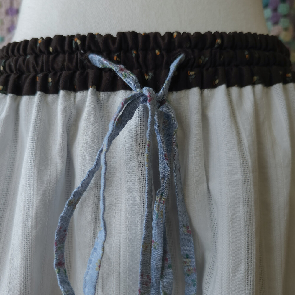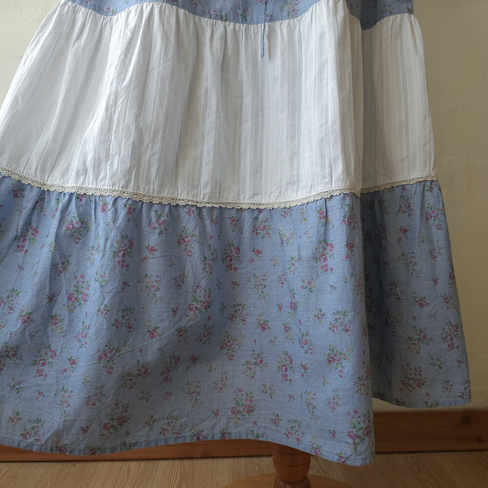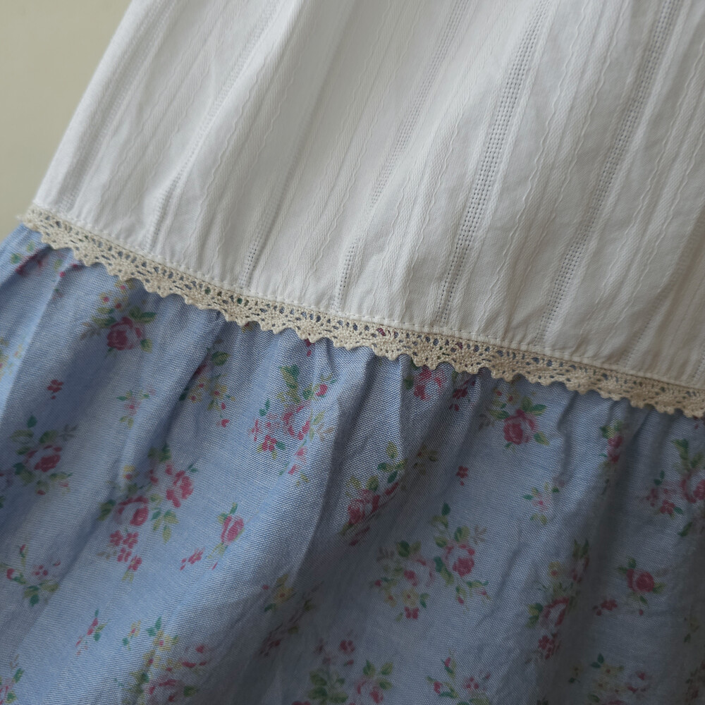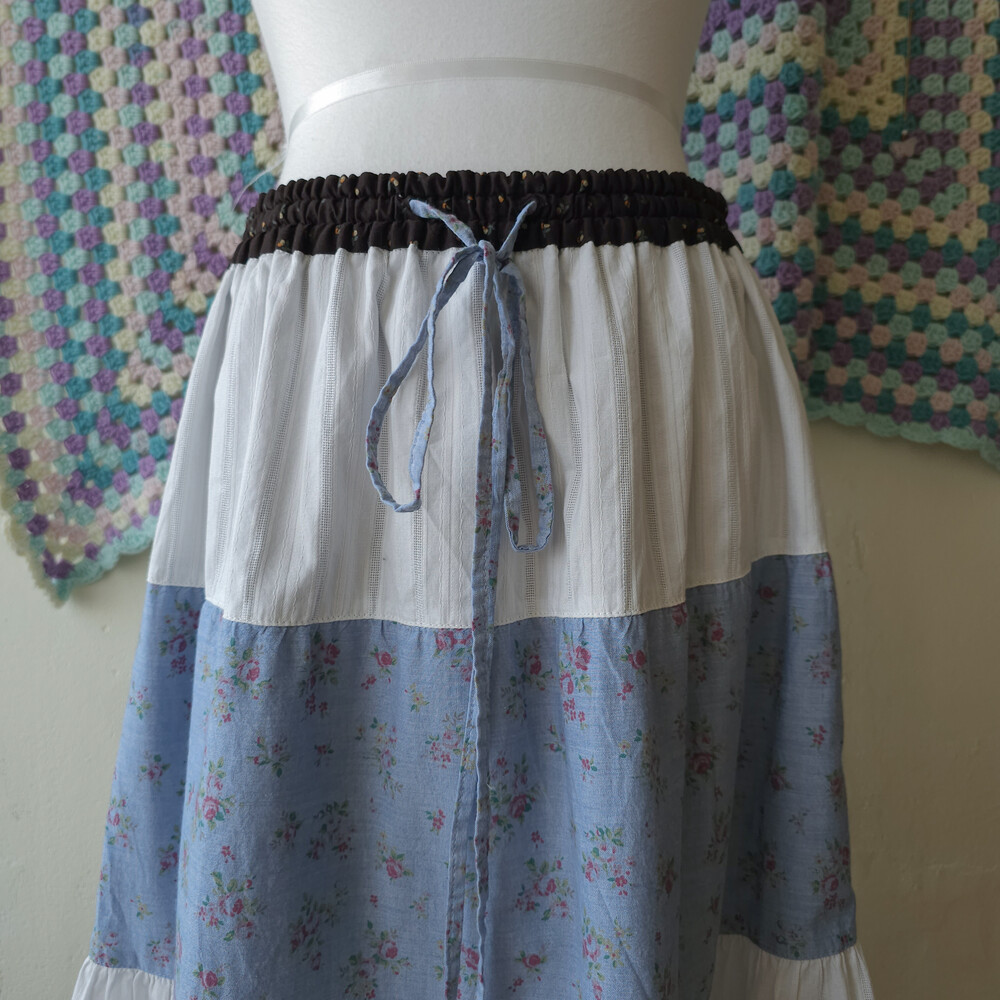 화이트, 블루 색감 조합의 패치워크 스커트예요
