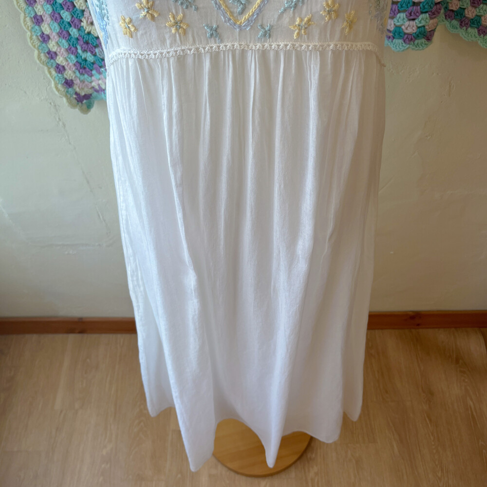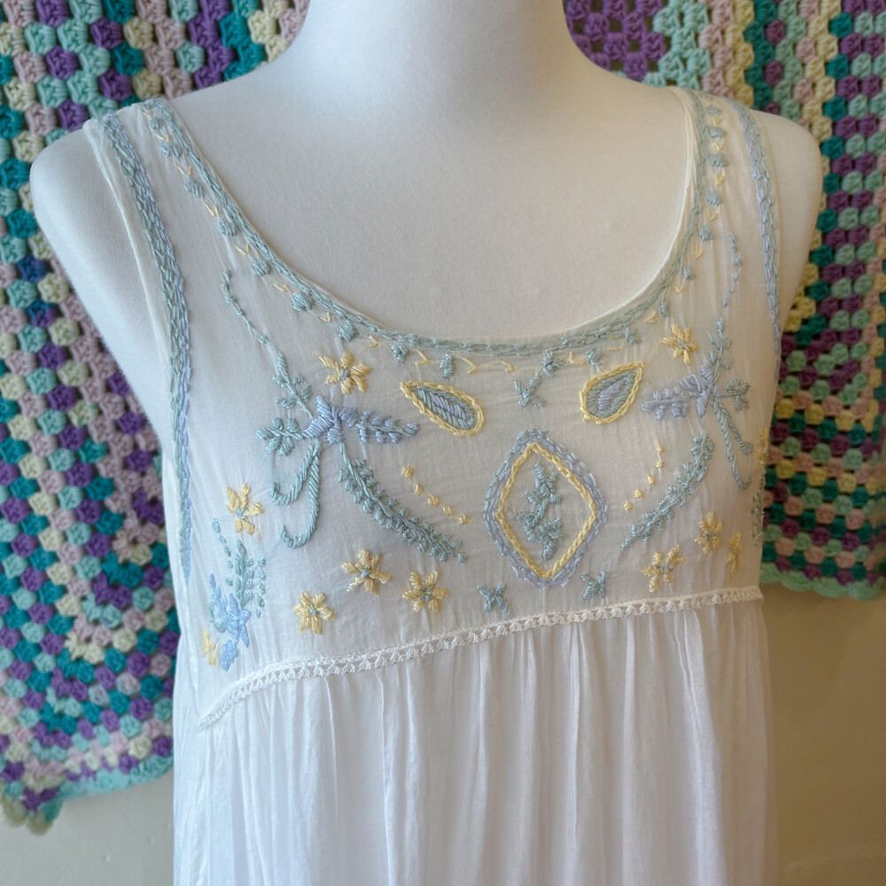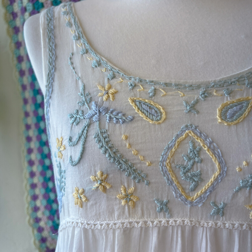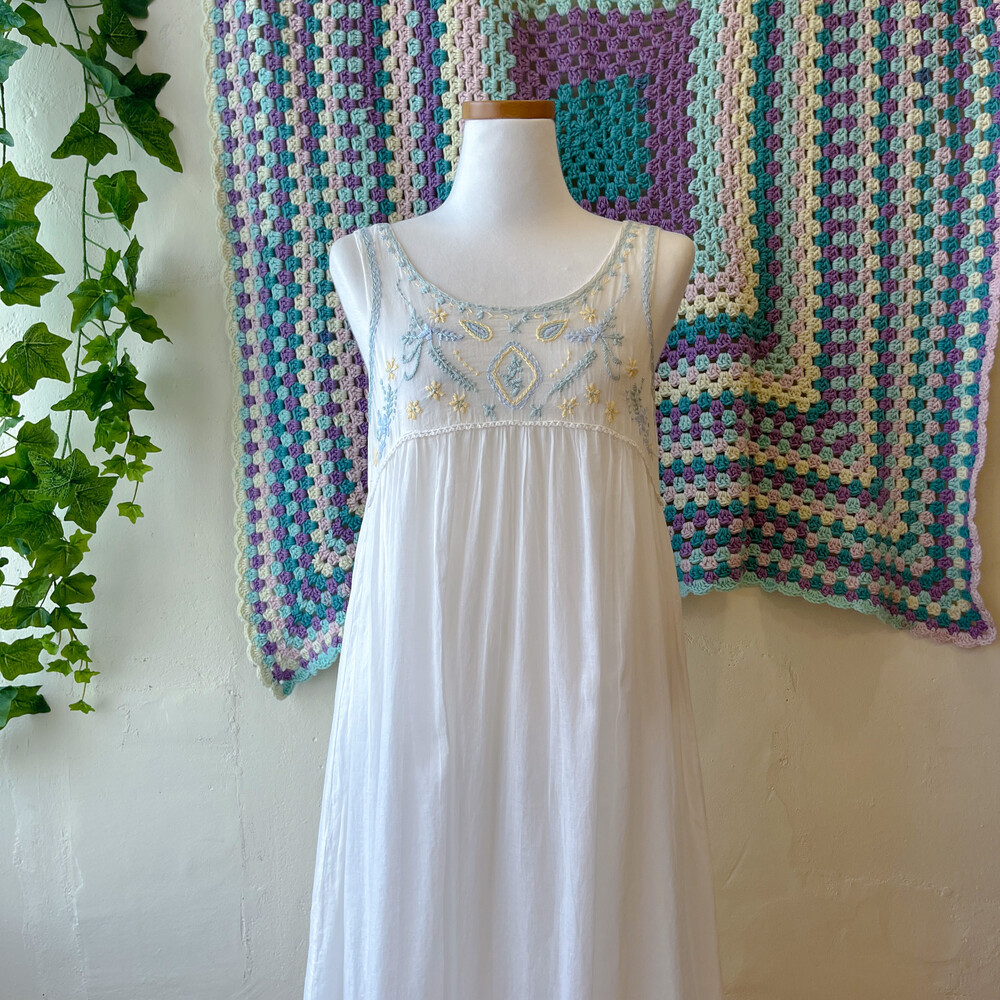 블루, 그린, 레몬 색감 자수 포인트의 코튼 민소매 롱원피스예요