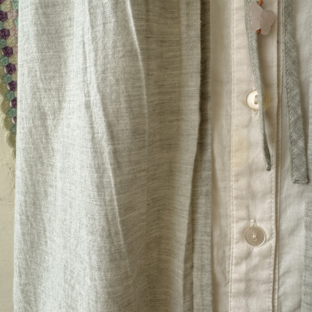 맨 아랫쪽 밑단에 오염 스팟, 다섯 번째 단추 아래에 오염 스팟