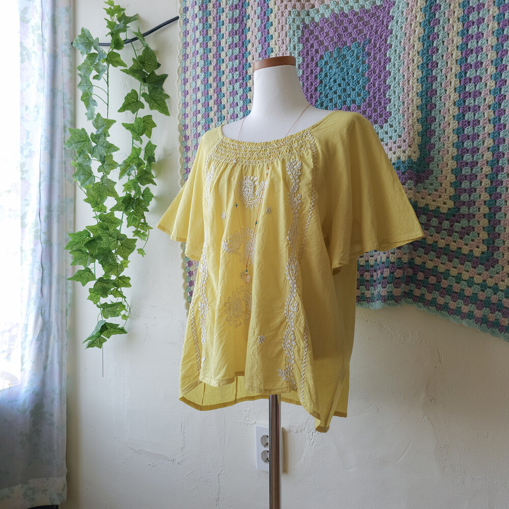 머스타드 색감의 자수 블라우스예요