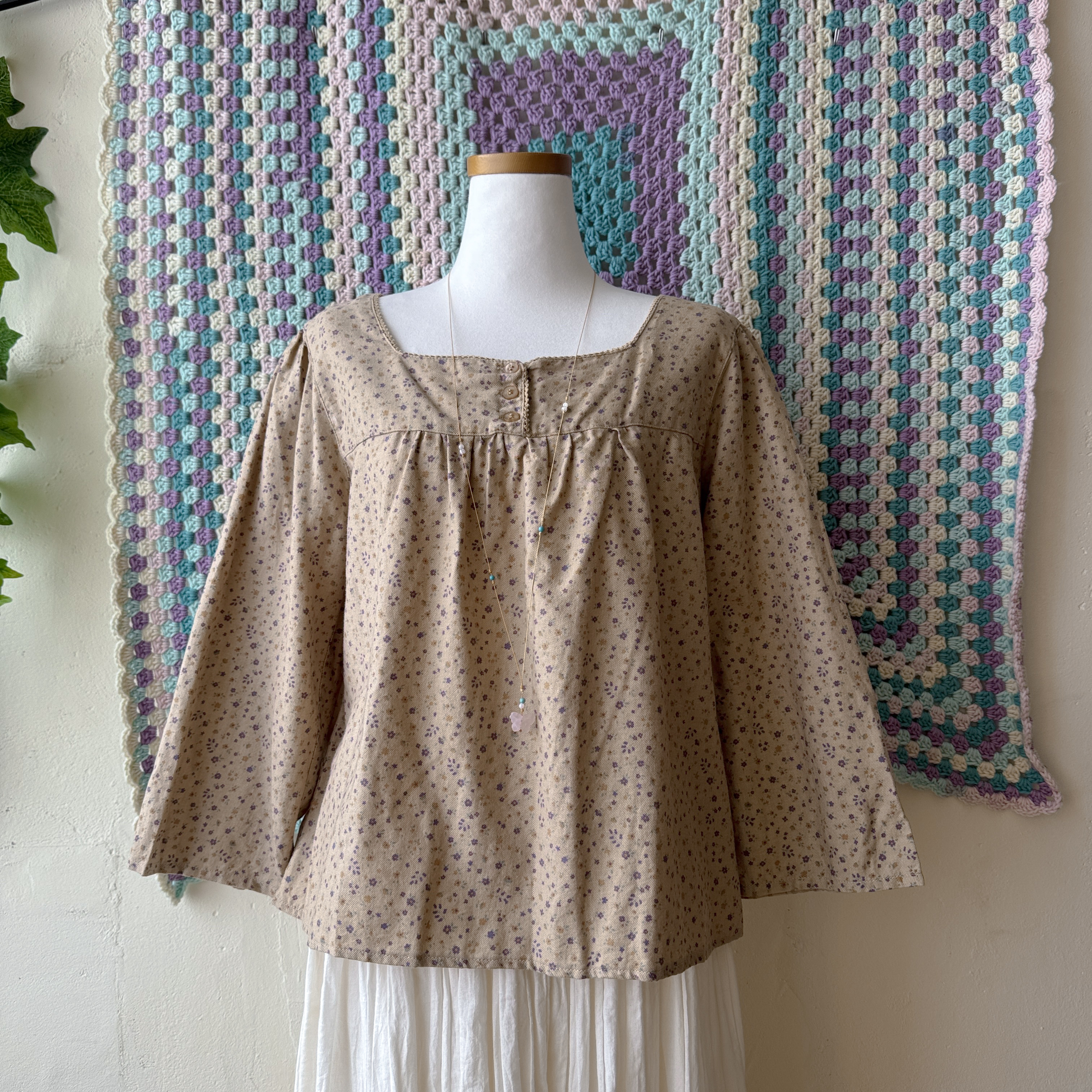 브라운 색감의 잔꽃 스퀘어넥 블라우스예요