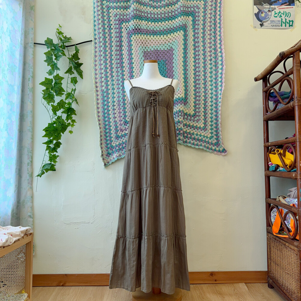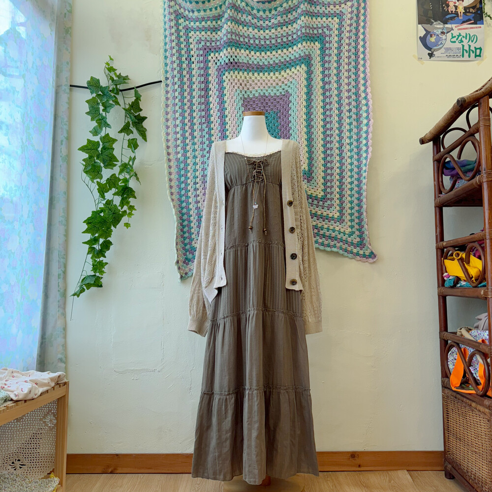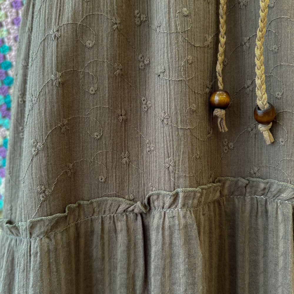 다크 카키 색감의 아일렛 코튼 끈원피스예요