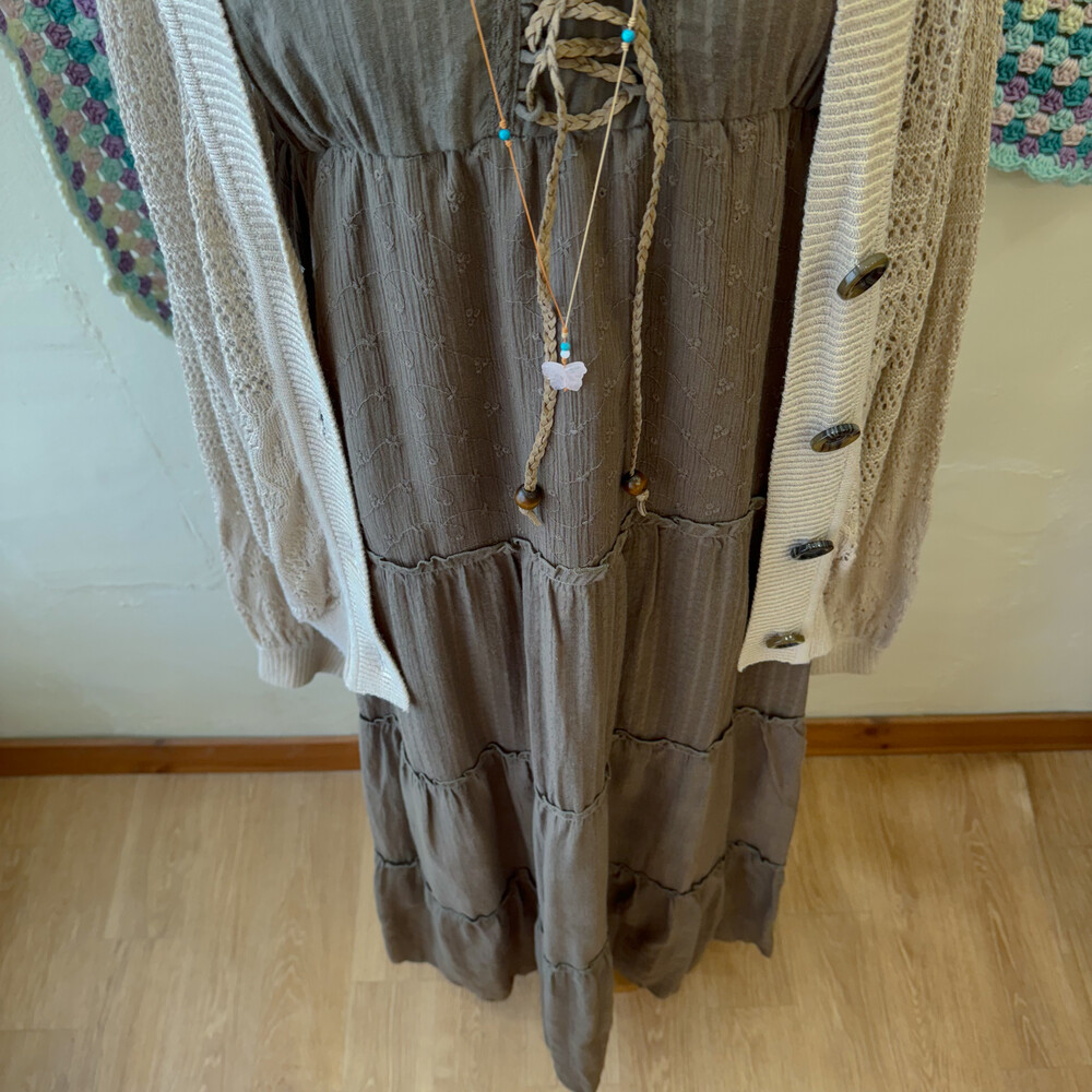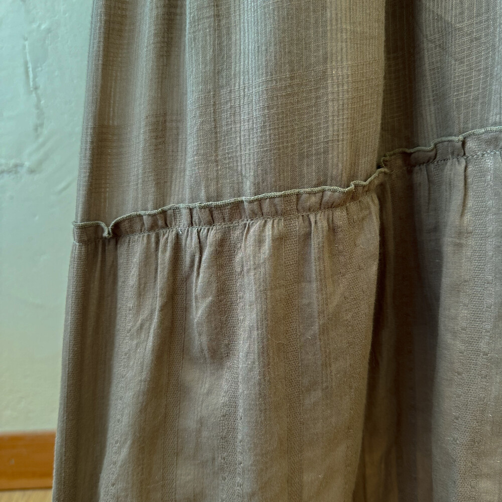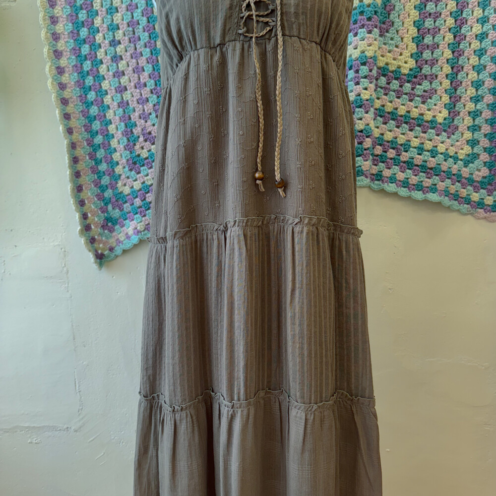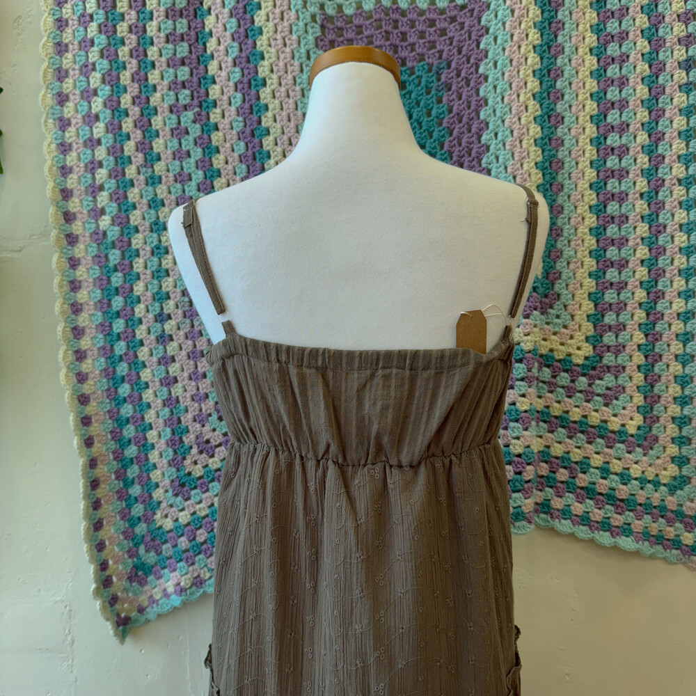 다크 카키 색감의 아일렛 코튼 끈원피스예요