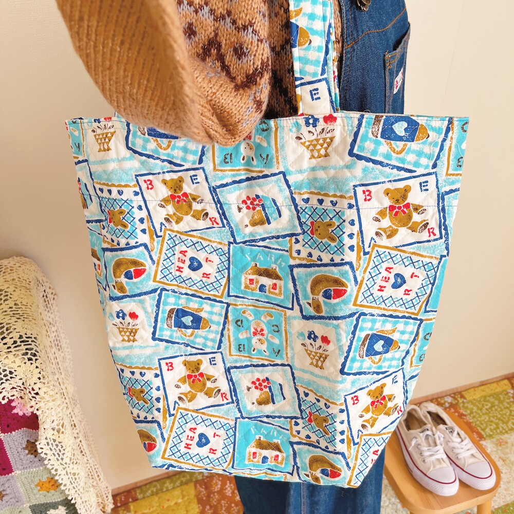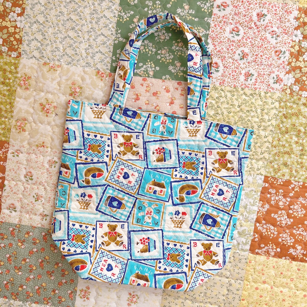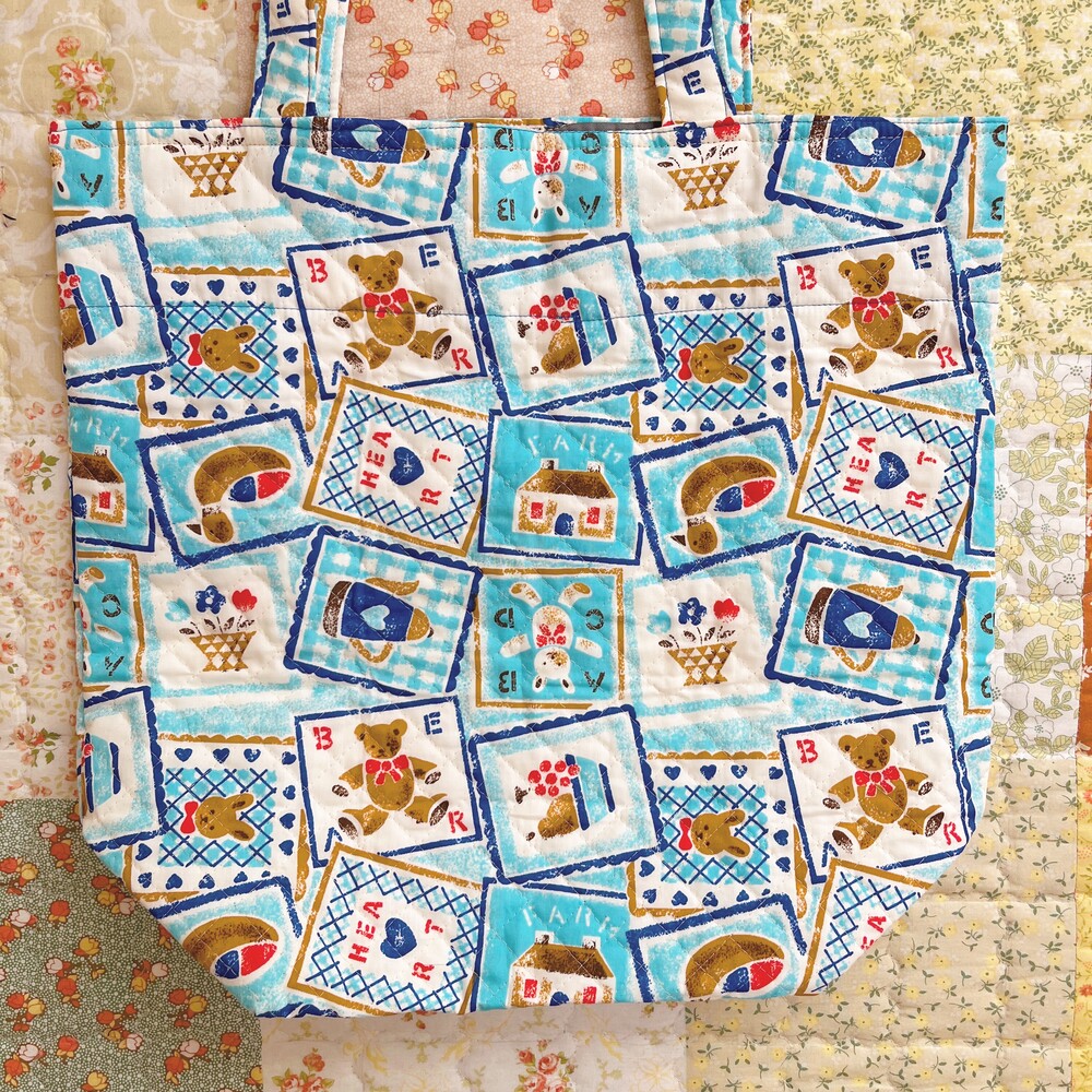 곰돌이, 토끼 등 패턴이 가득한 퀼트 숄더백이에요