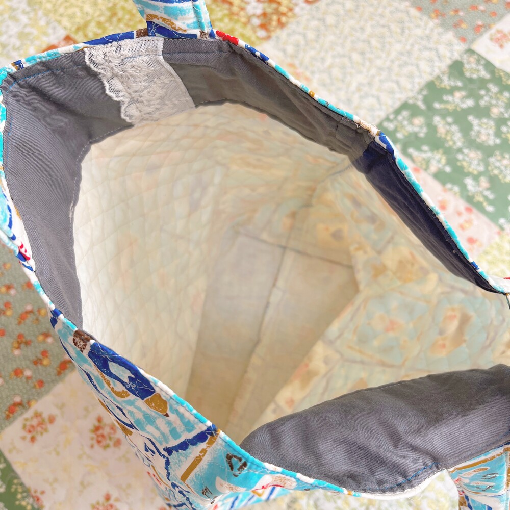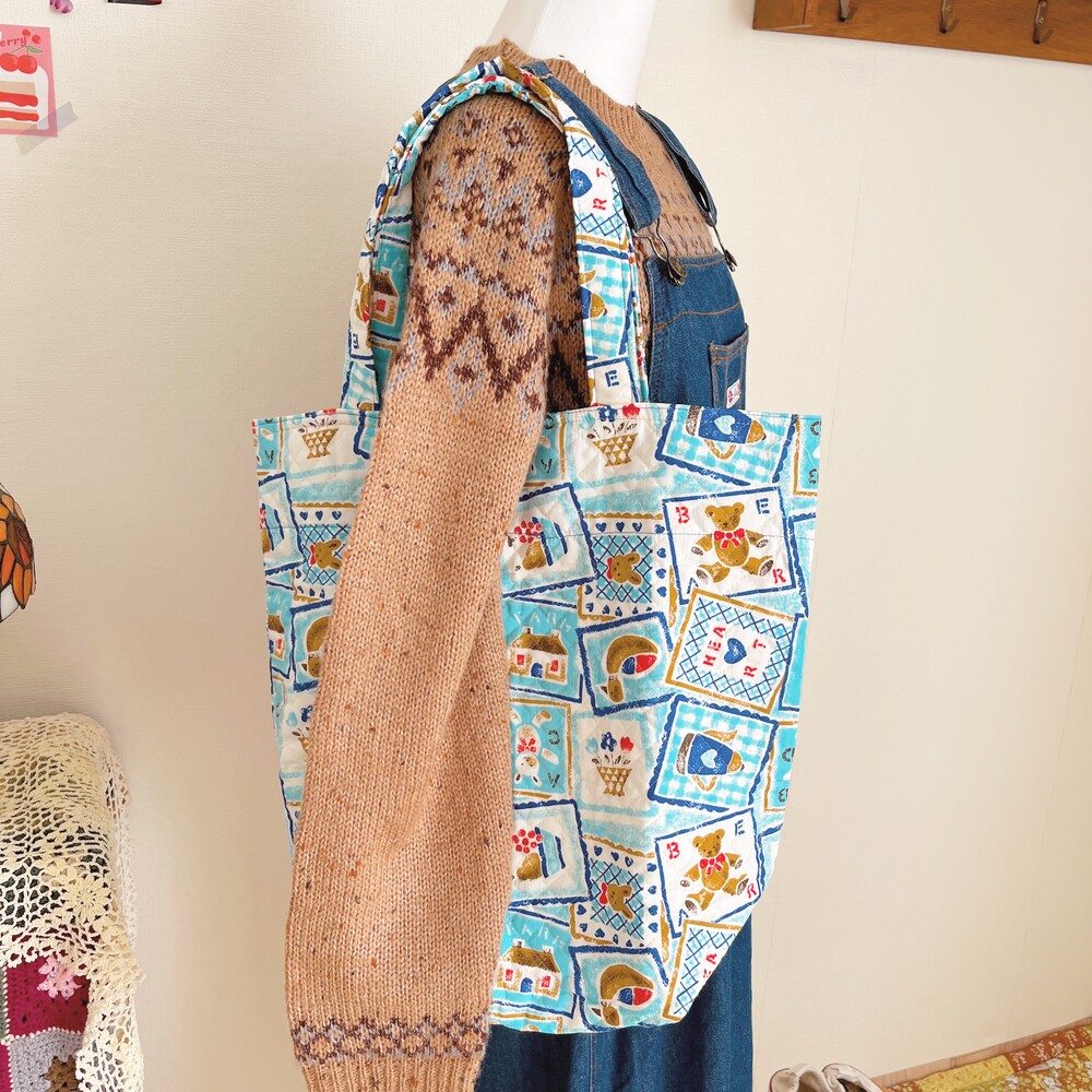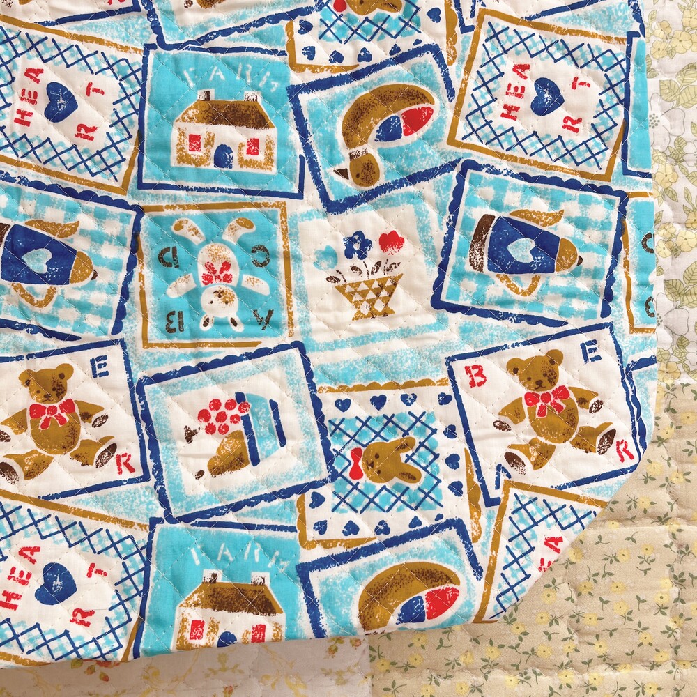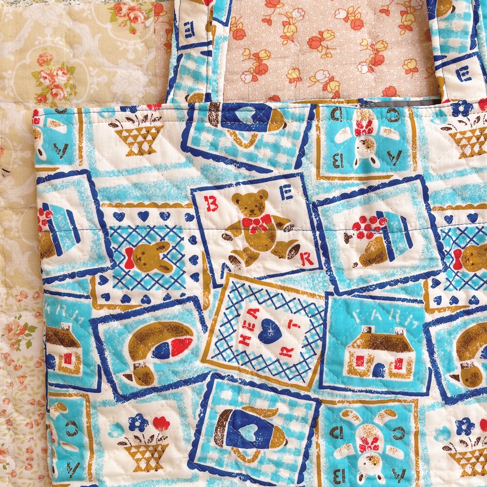 곰돌이, 토끼 등 패턴이 가득한 퀼트 숄더백이에요