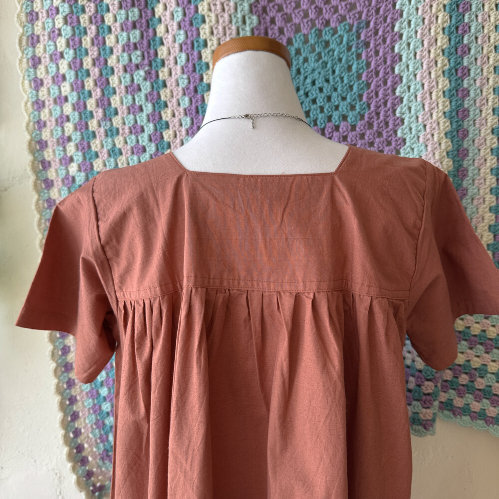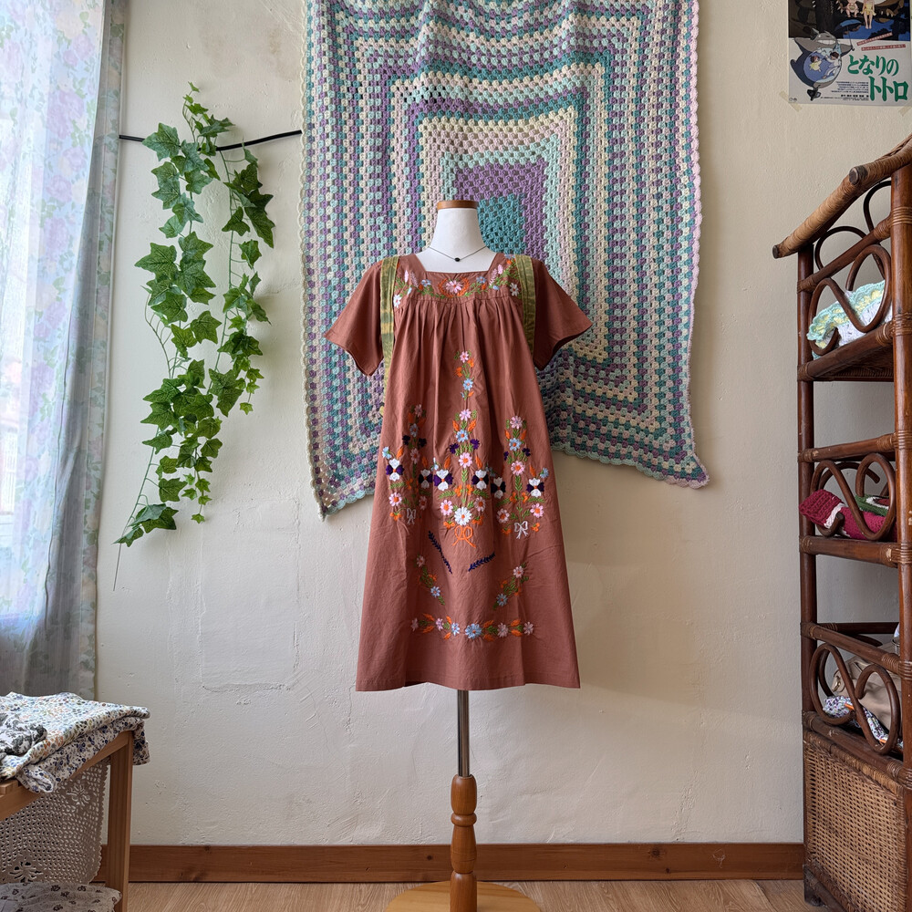 브라운 색감의 스퀘어넥 자수 원피스예요