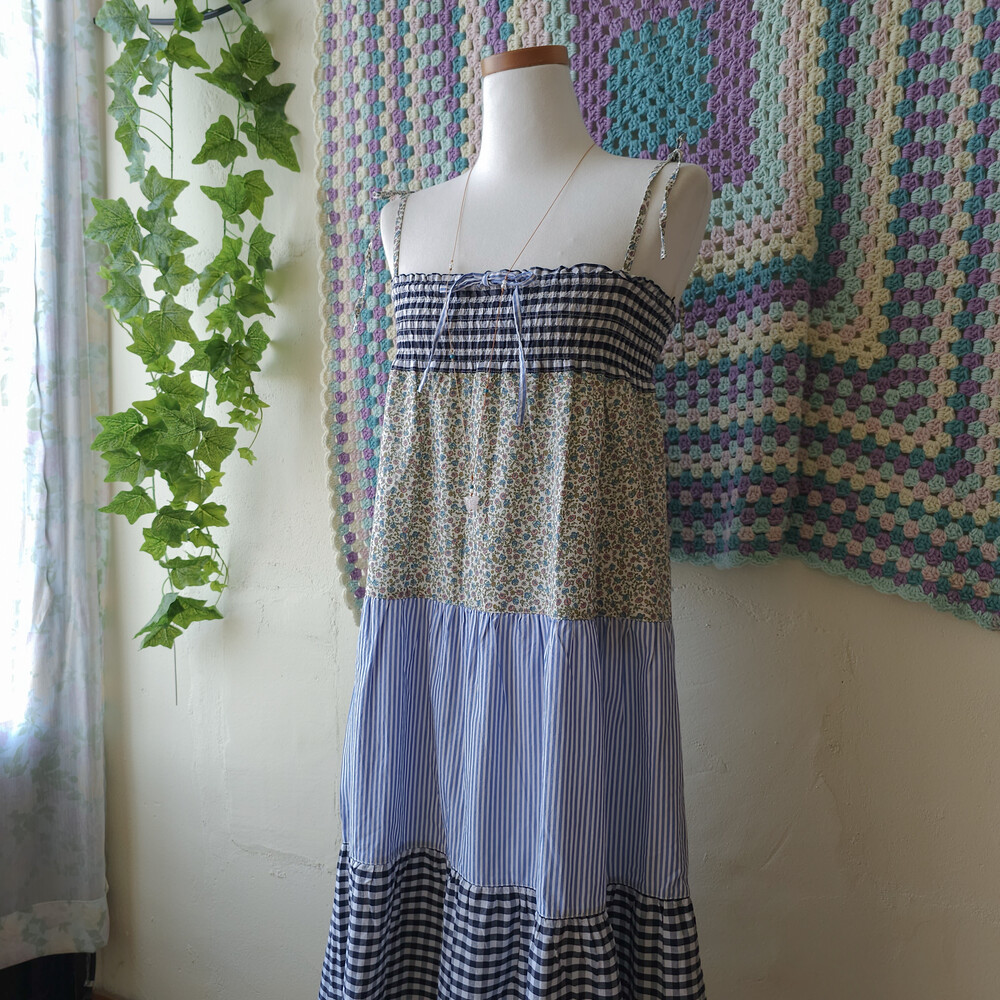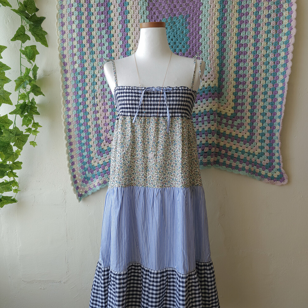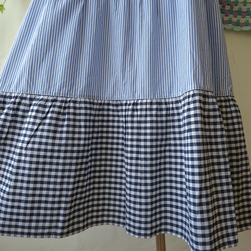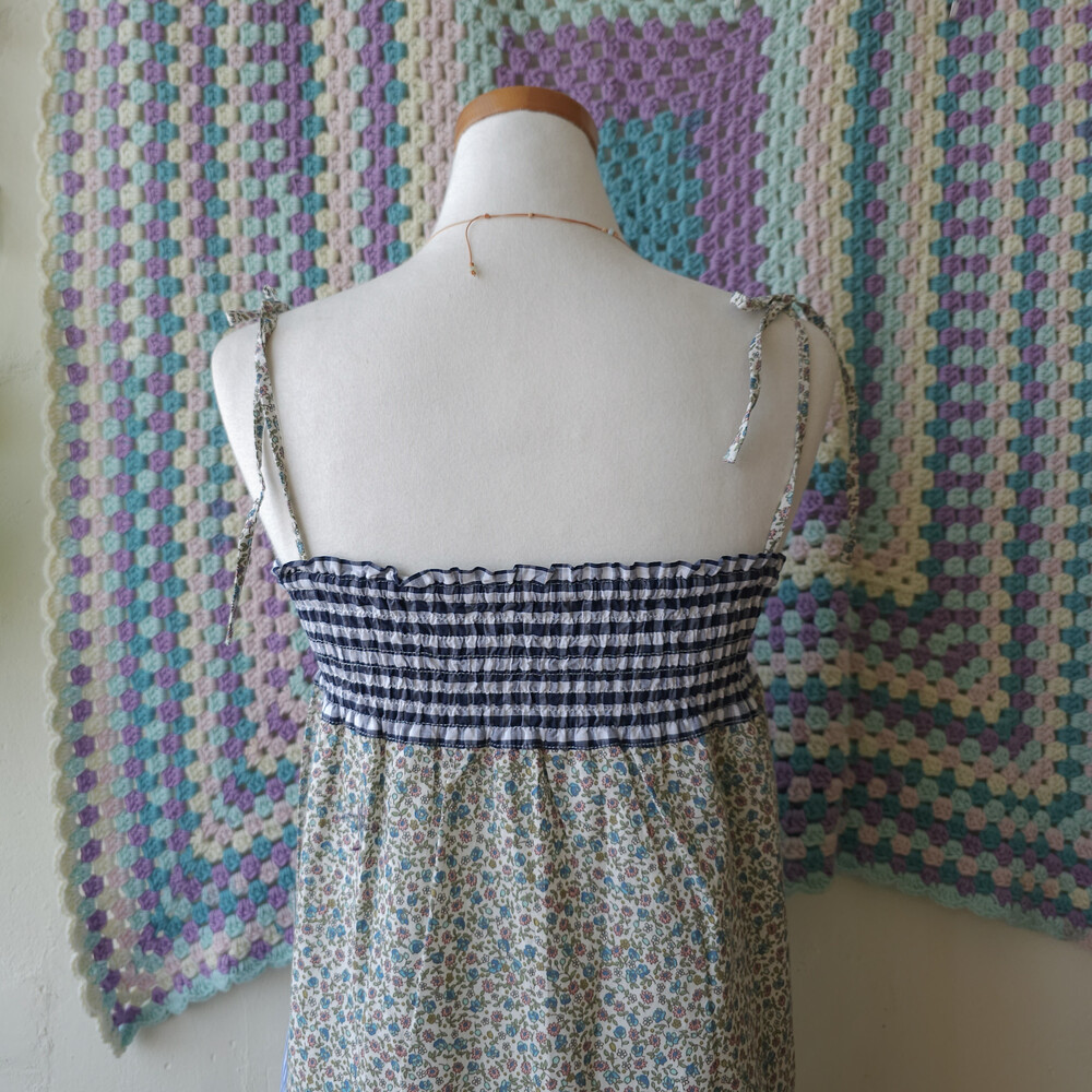블랙 체크, 스트라이프, 플라워 패턴의 패치 끈원피스예요