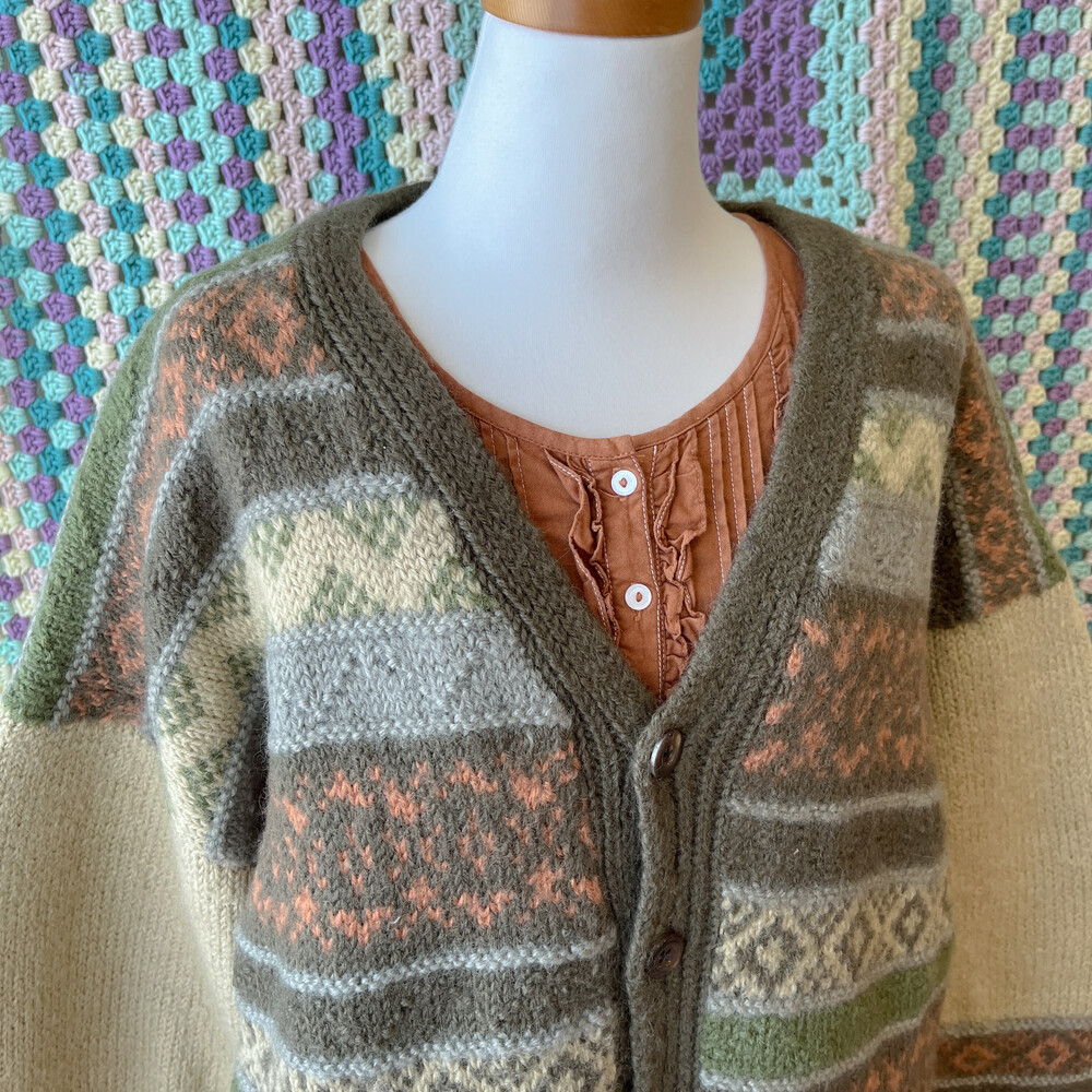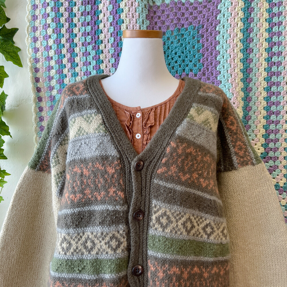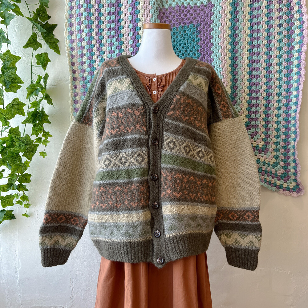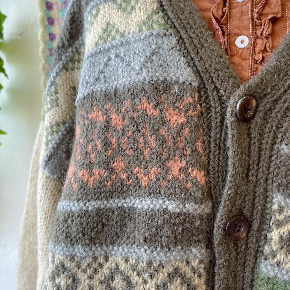 카키 색감 베이스의 패턴 울 가디건이에요