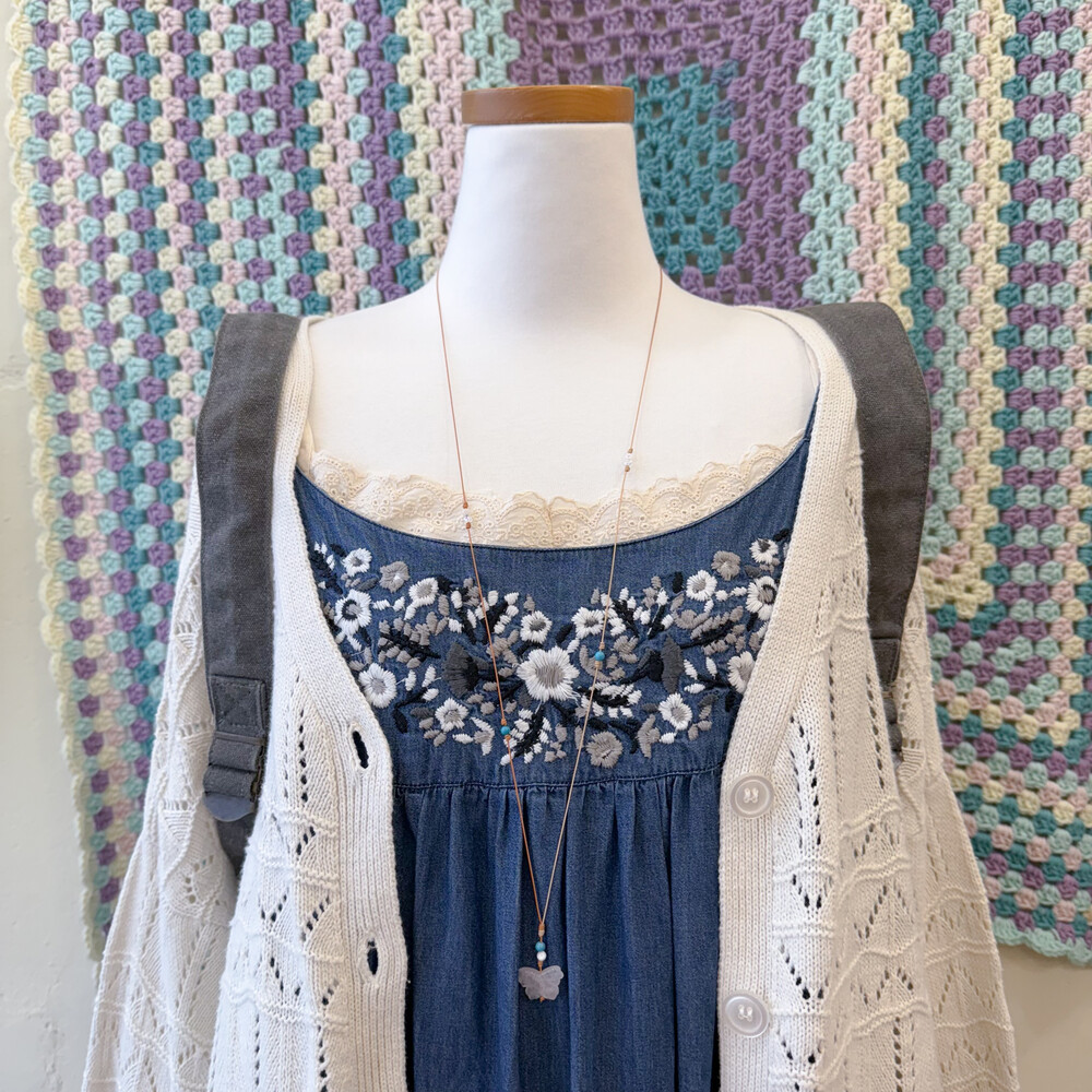 진청 색감의 자수 끈원피스예요