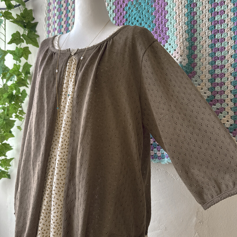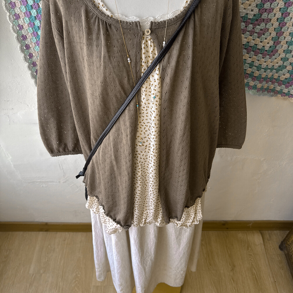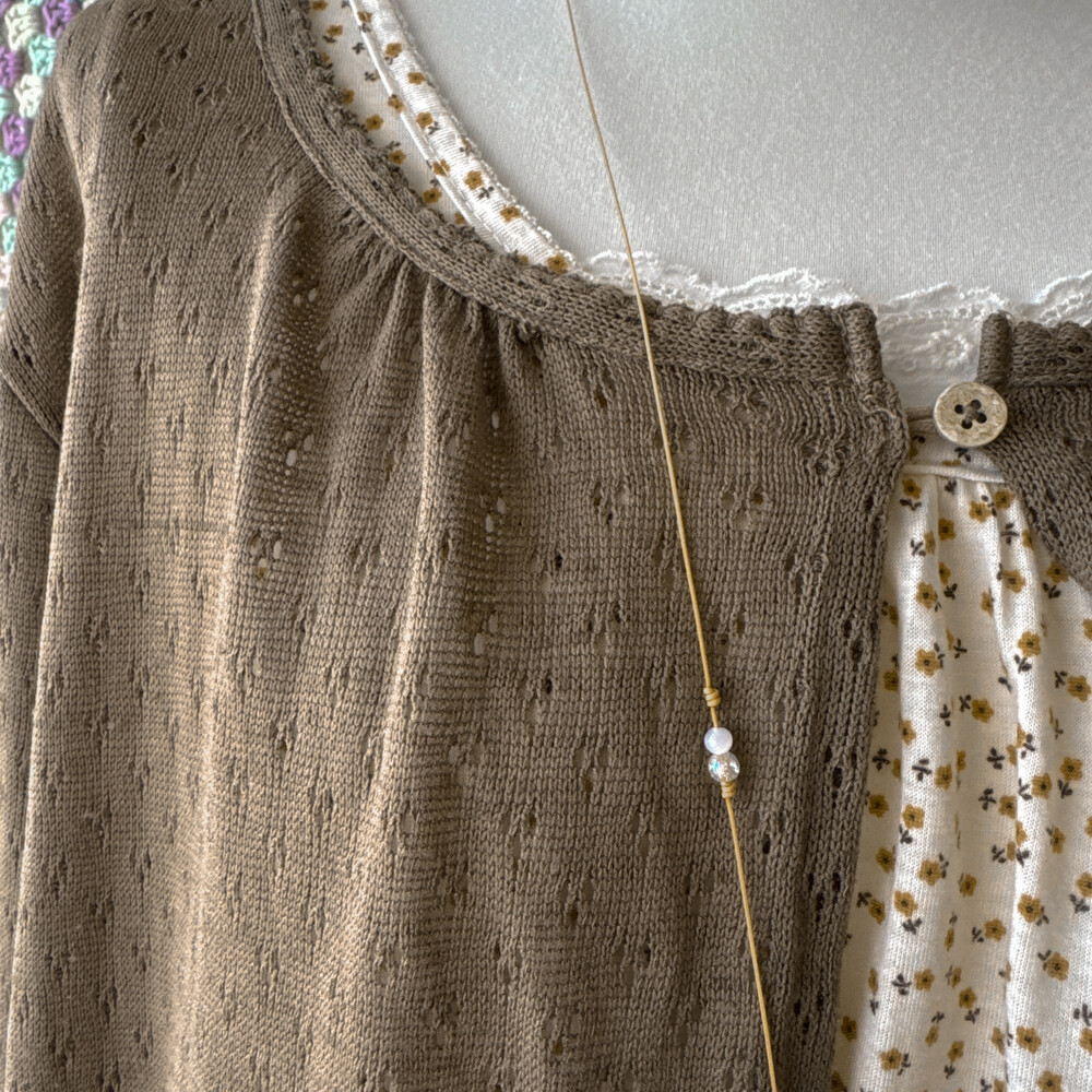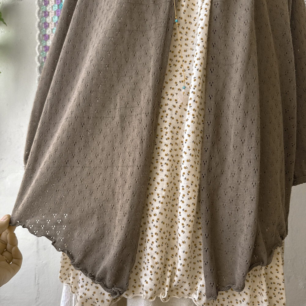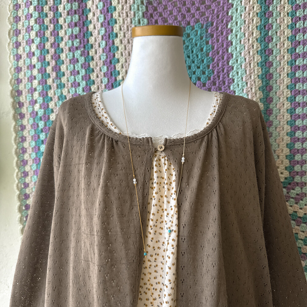 브라운 색감의 우드 버튼 펀칭 가디건이에요
