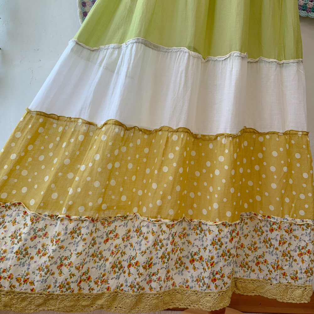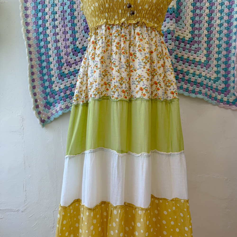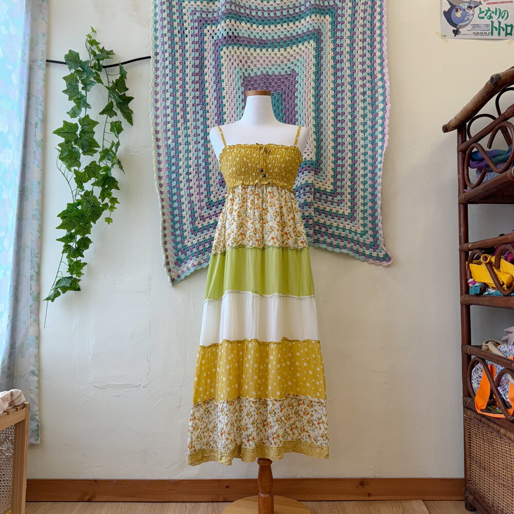 머스타드 색감 베이스의 패치워크 끈원피스예요