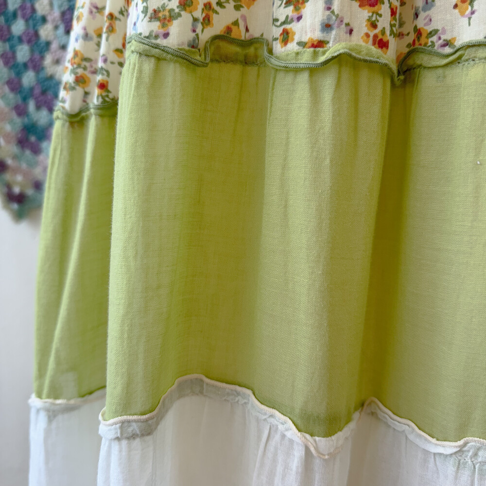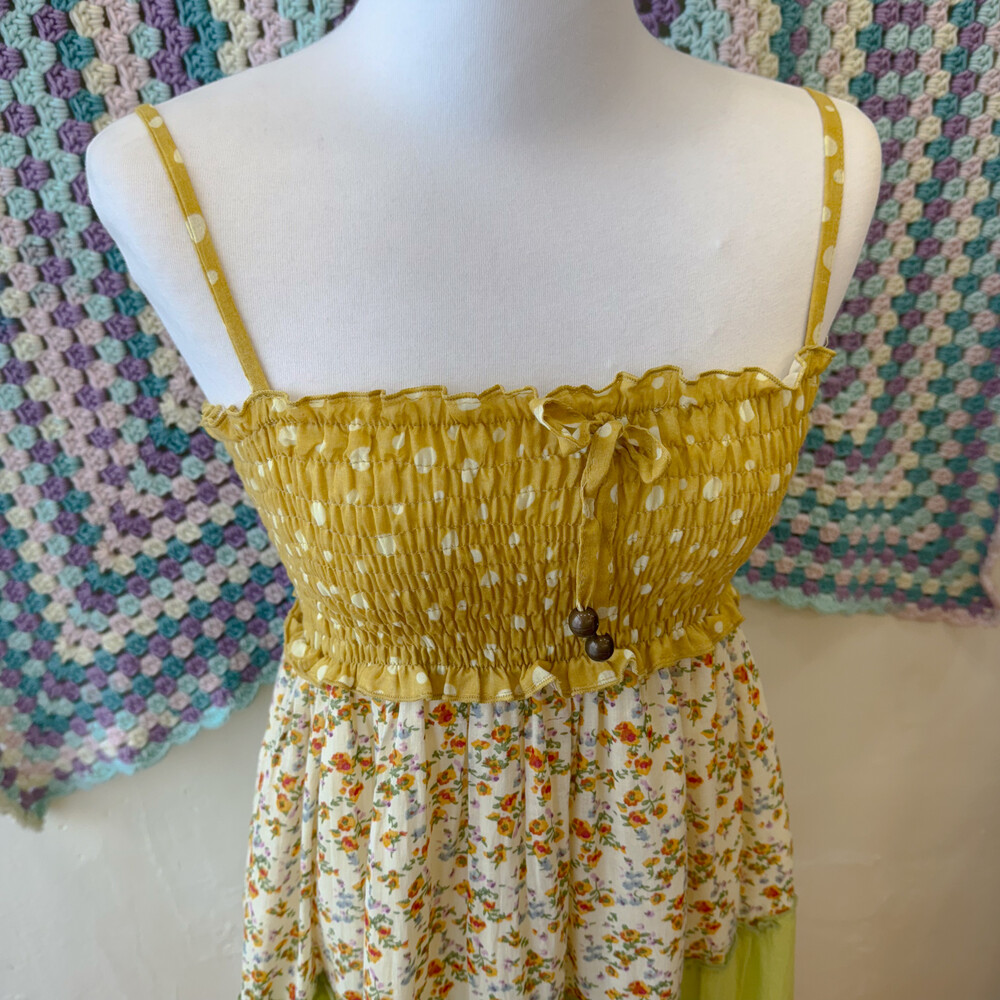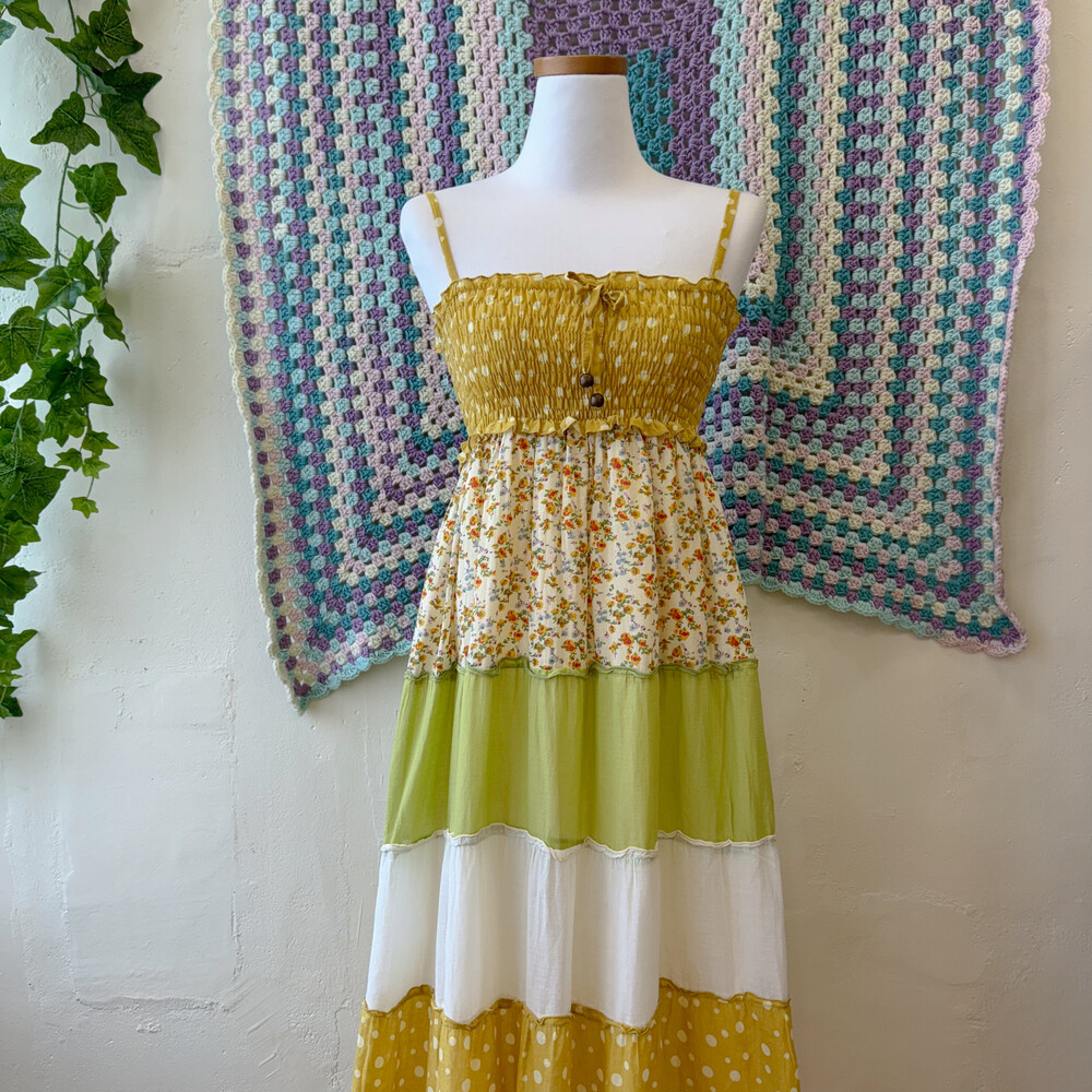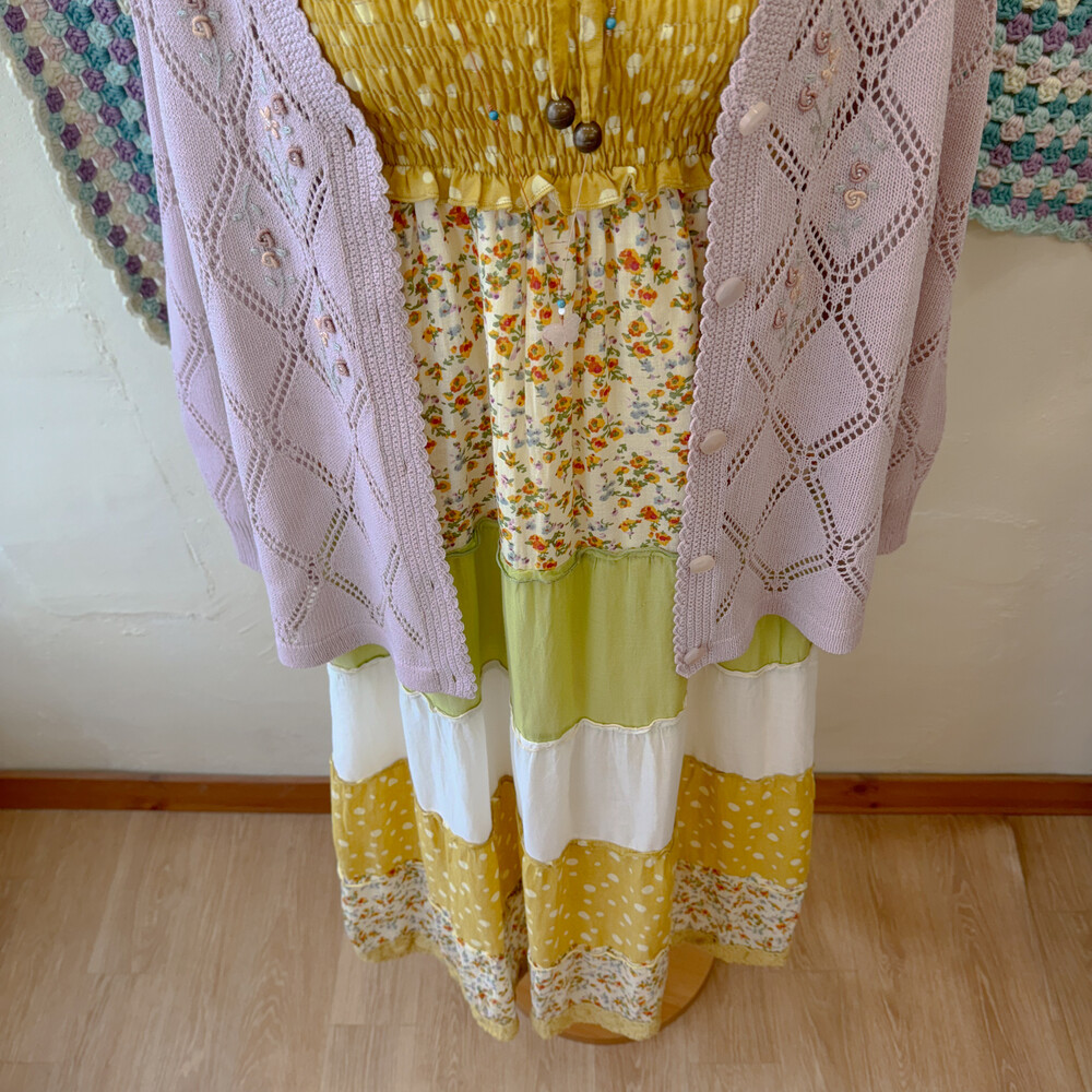 머스타드 색감 베이스의 패치워크 끈원피스예요