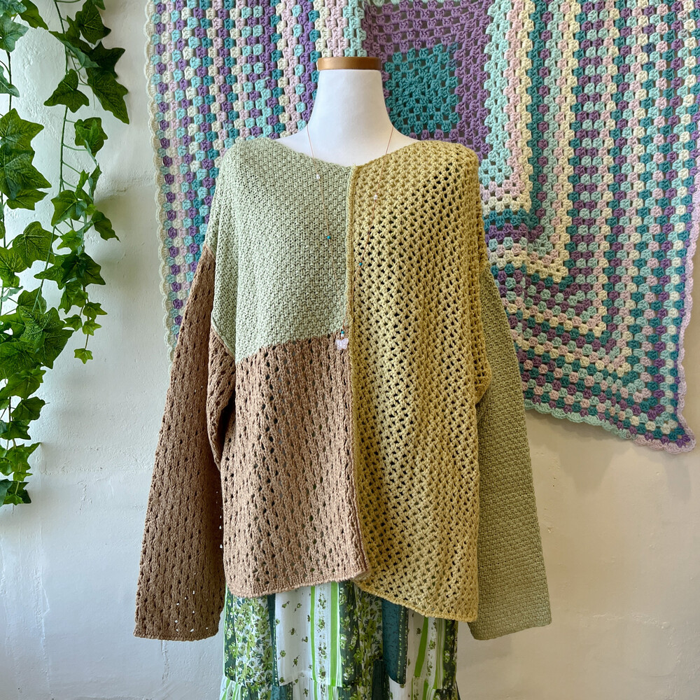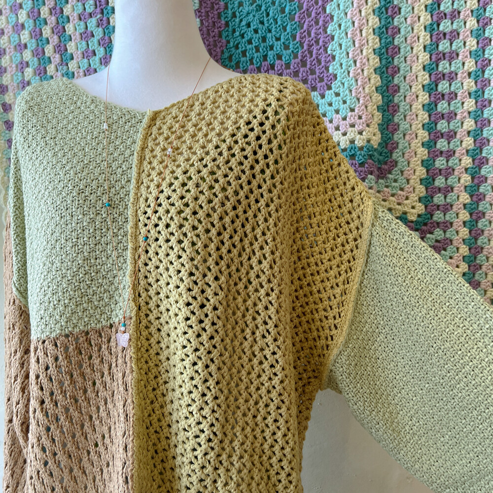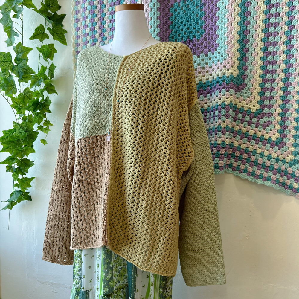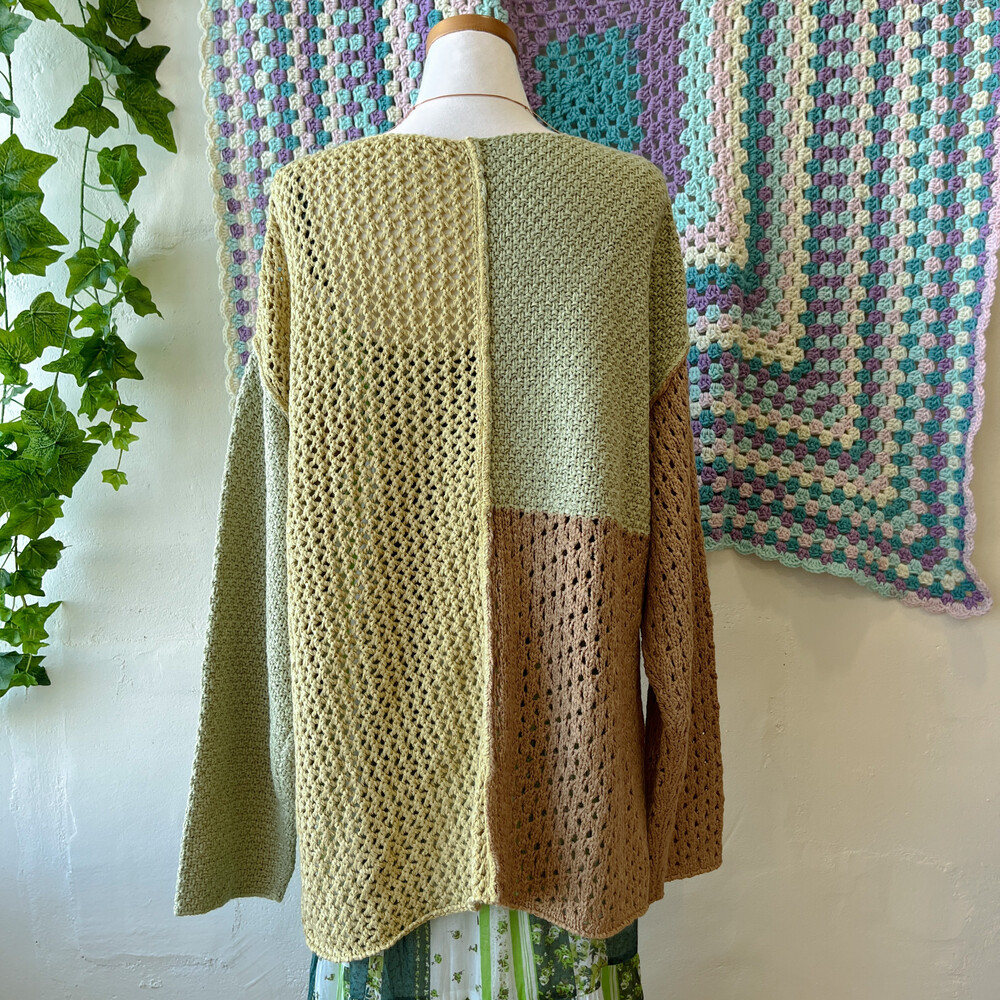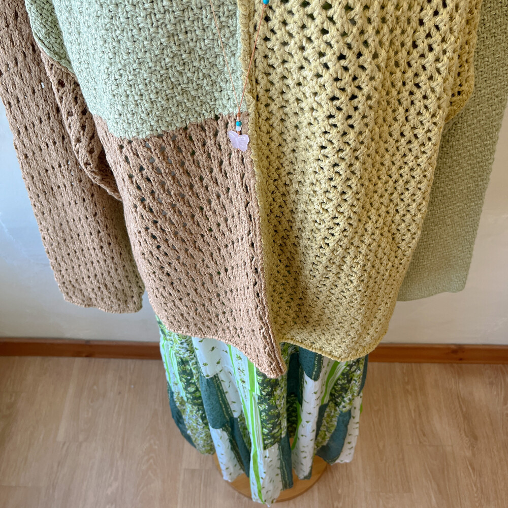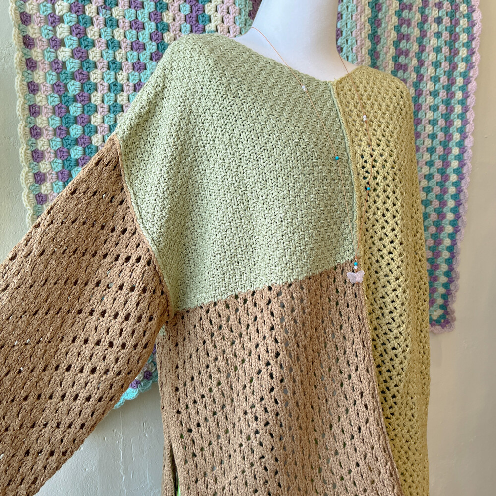 웜한 그린, 진베이지, 겨자색 조합의 패치워크 와플 니트예요