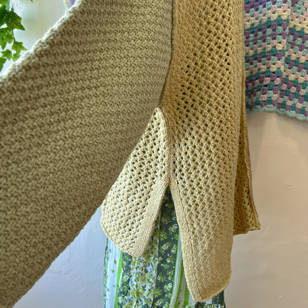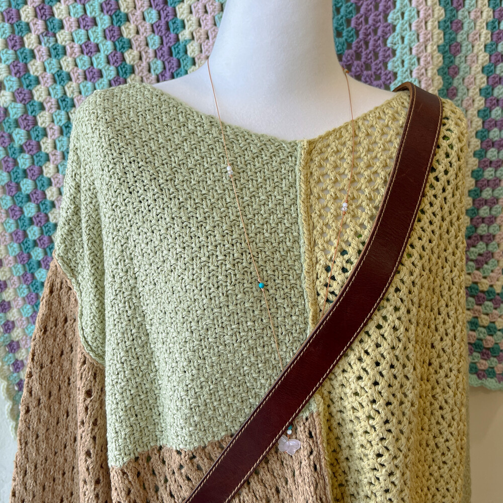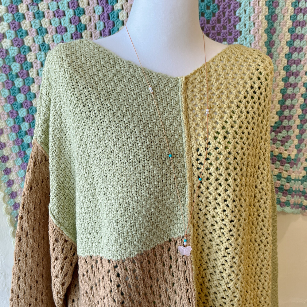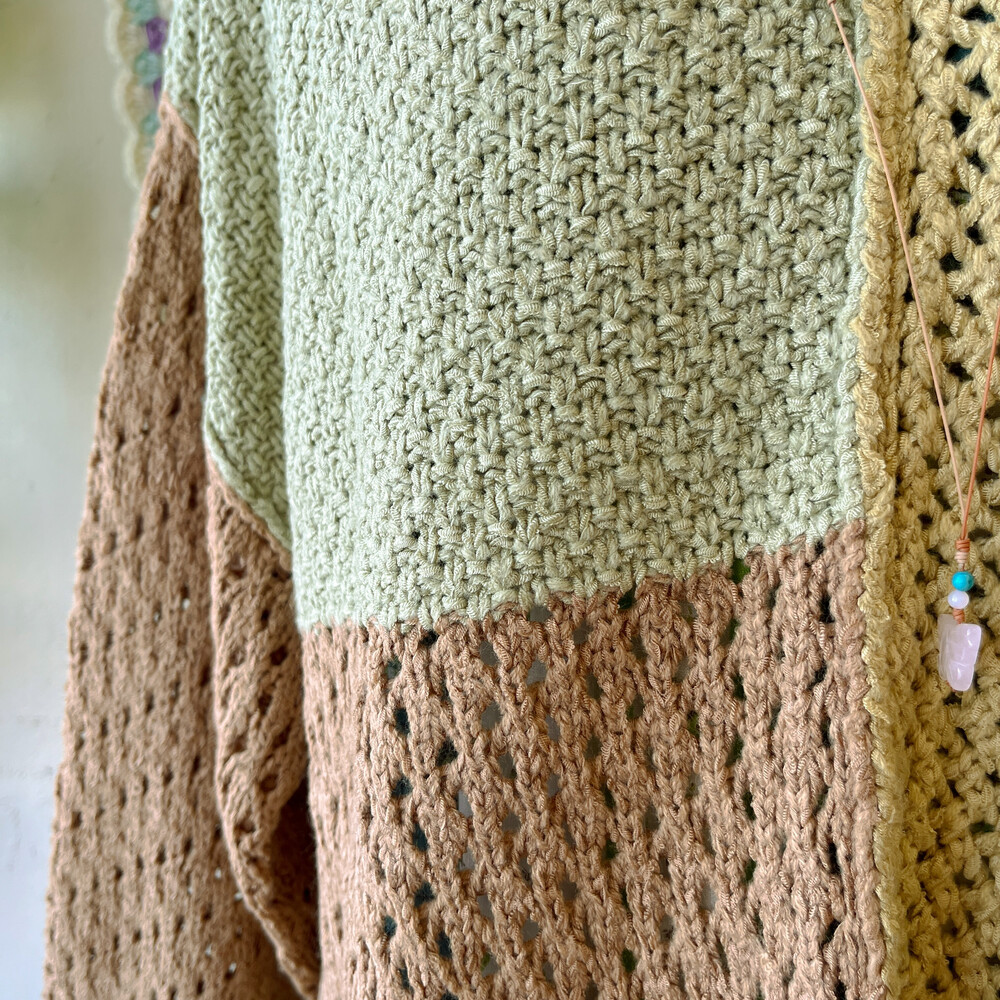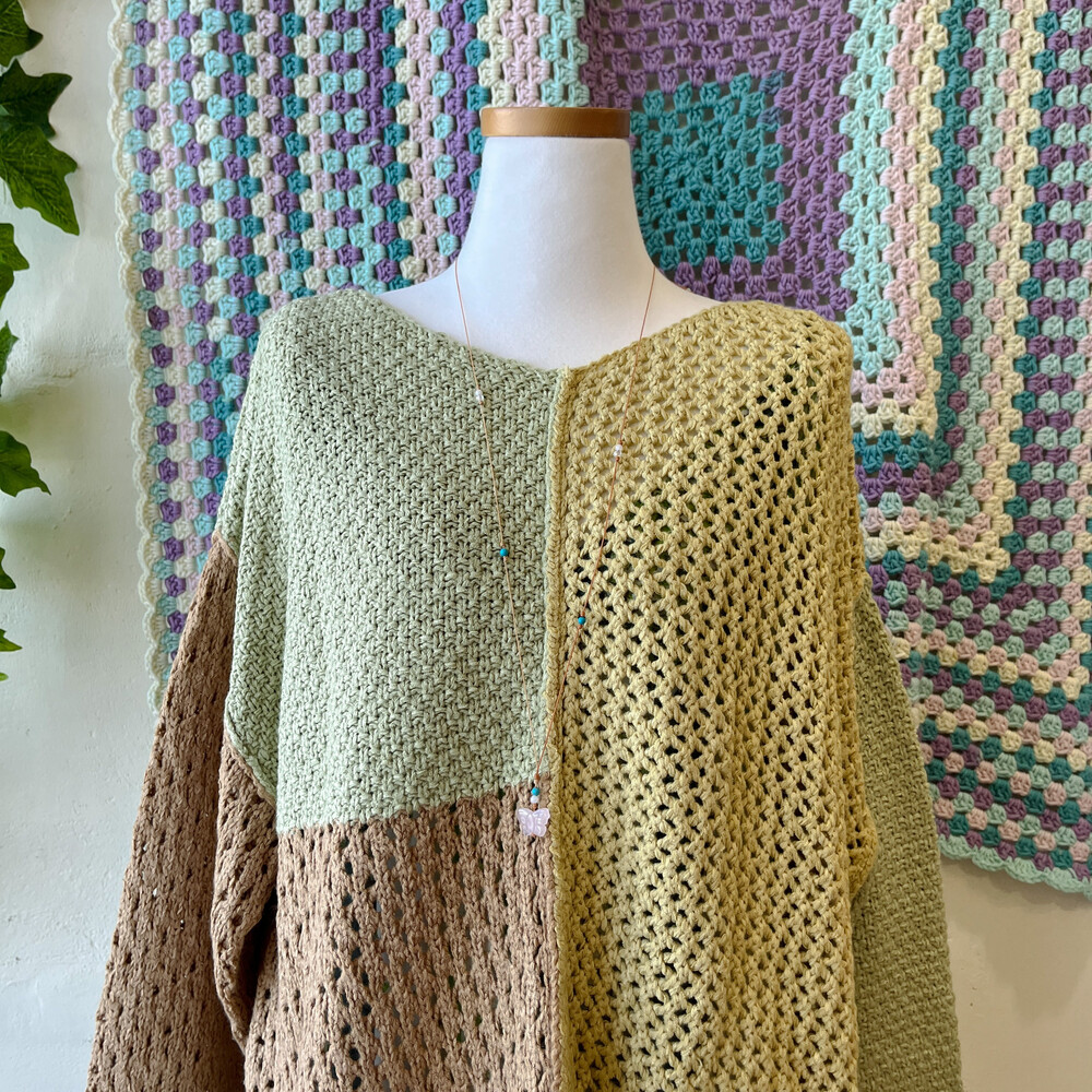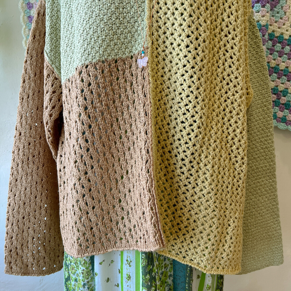 웜한 그린, 진베이지, 겨자색 조합의 패치워크 와플 니트예요