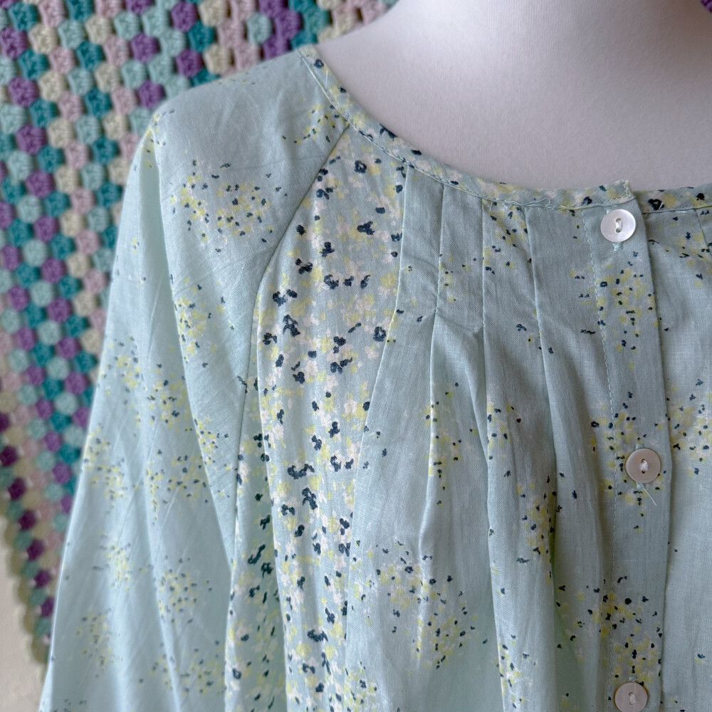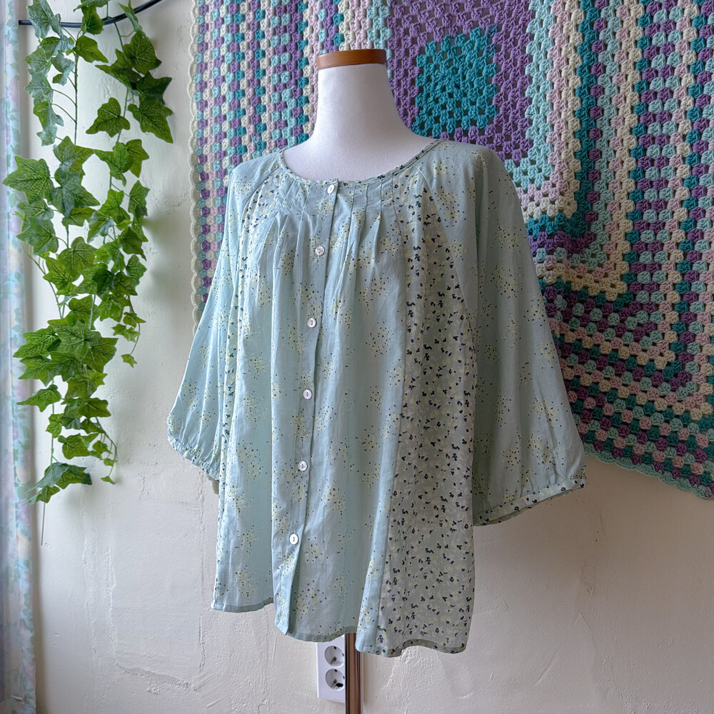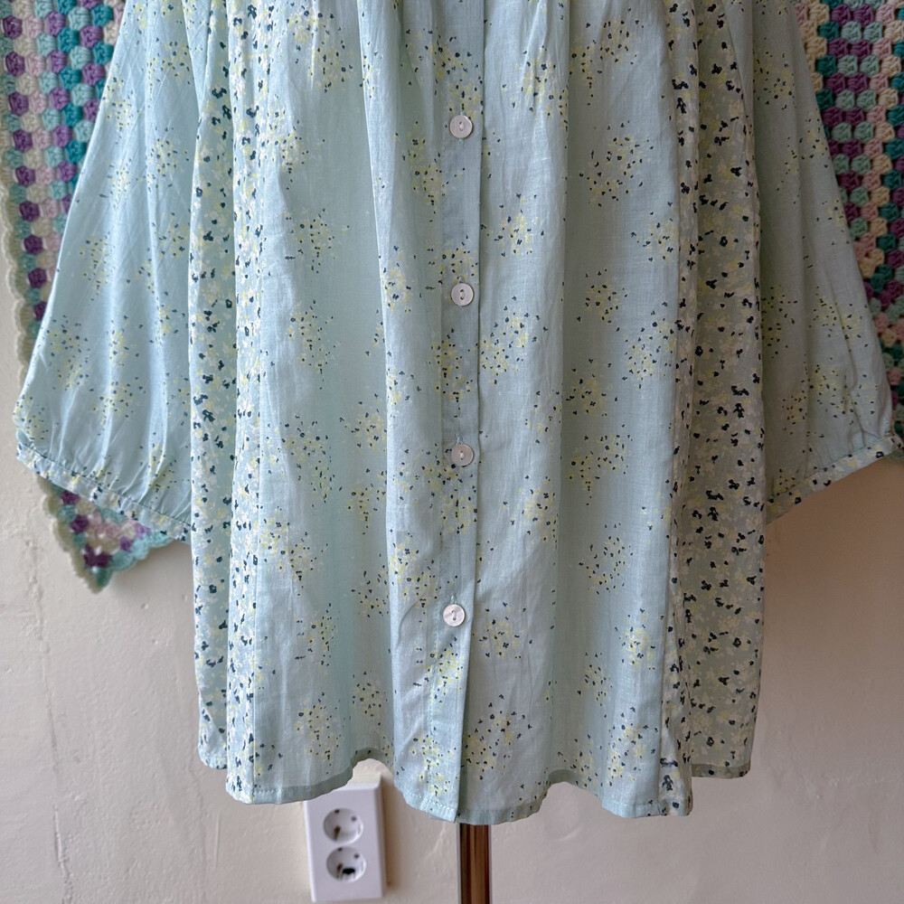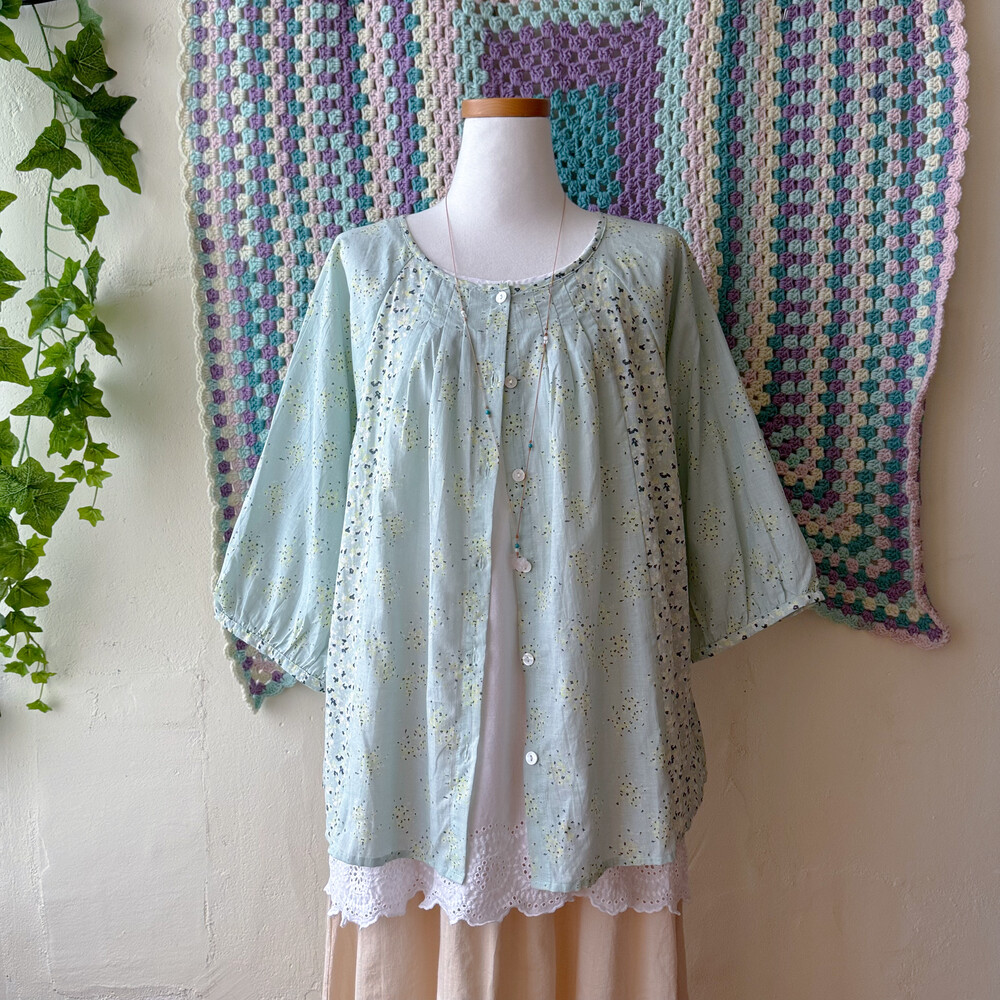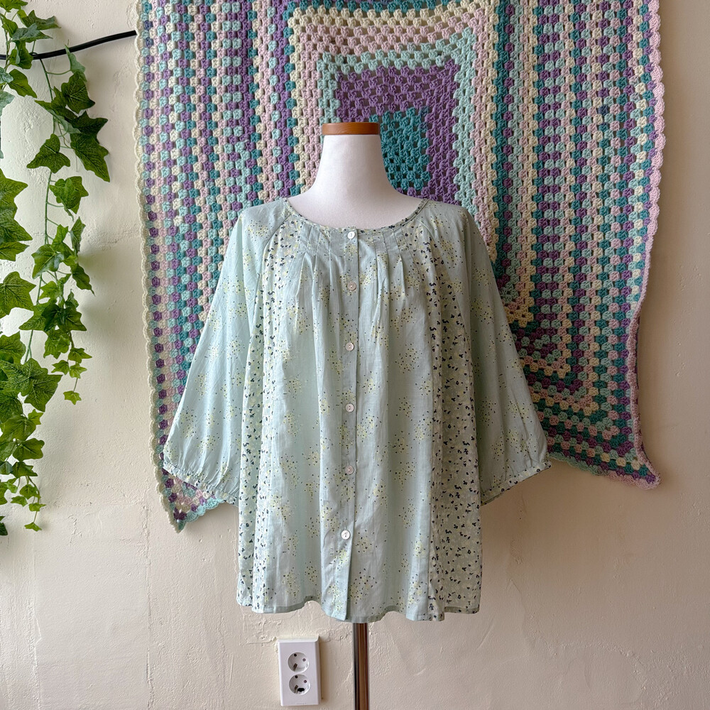 민트 색감 베이스의 세로패치 코튼 블라우스예요