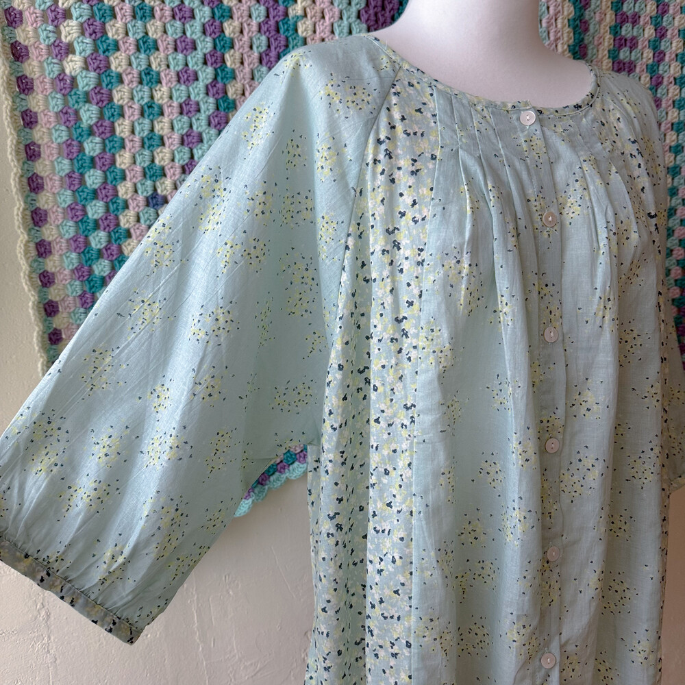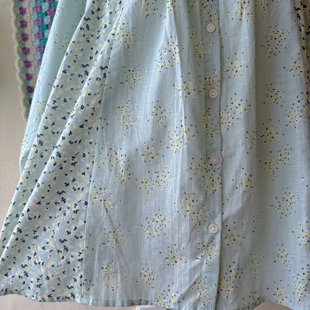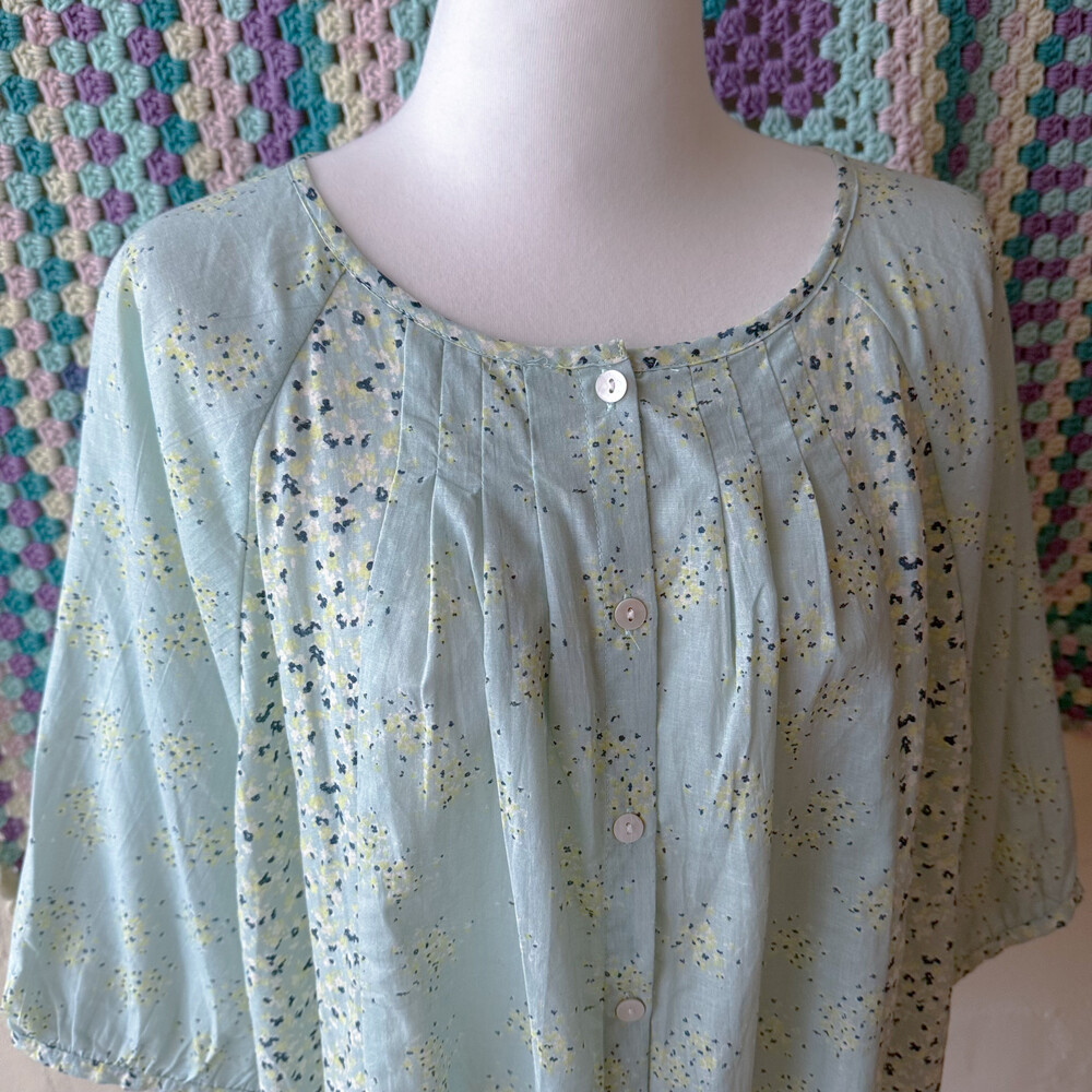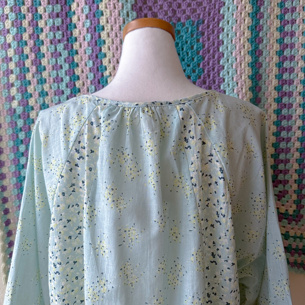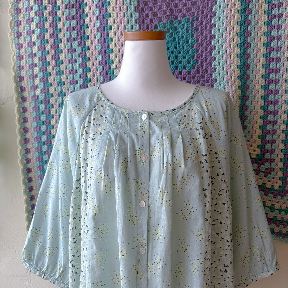 민트 색감 베이스의 세로패치 코튼 블라우스예요