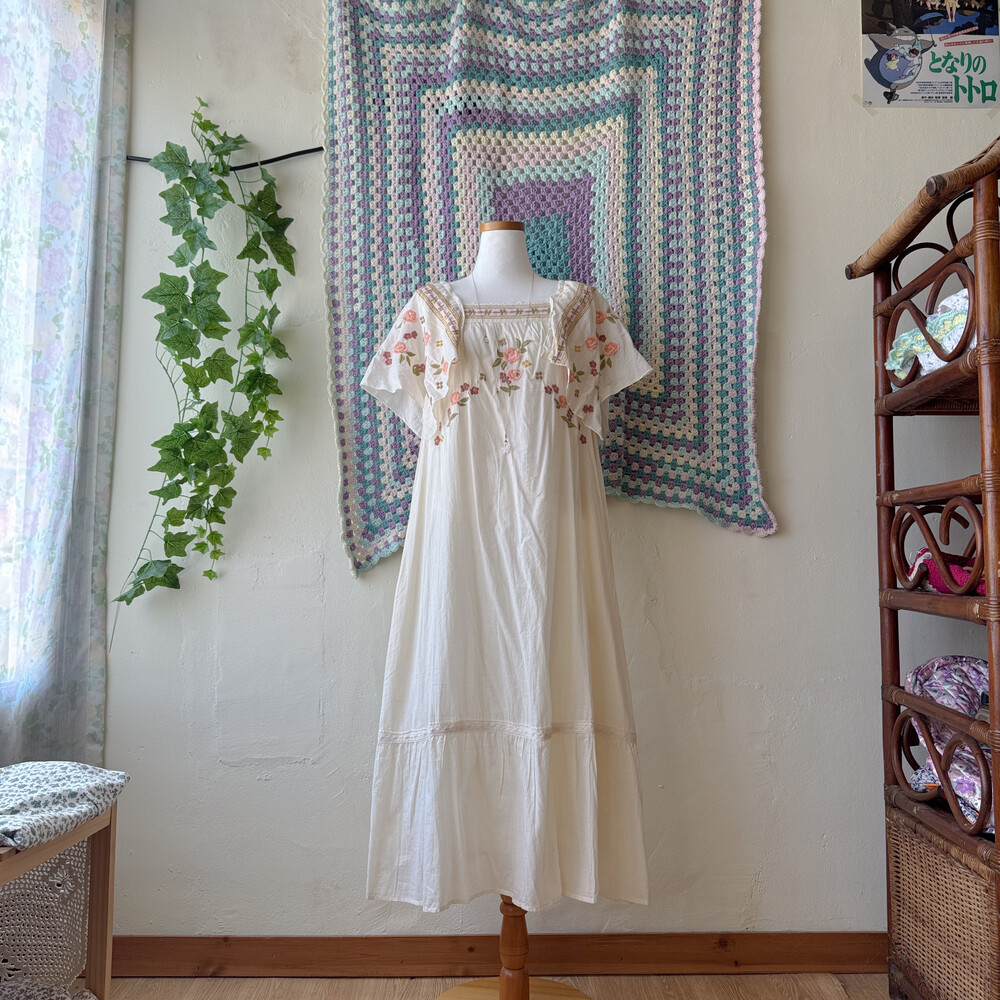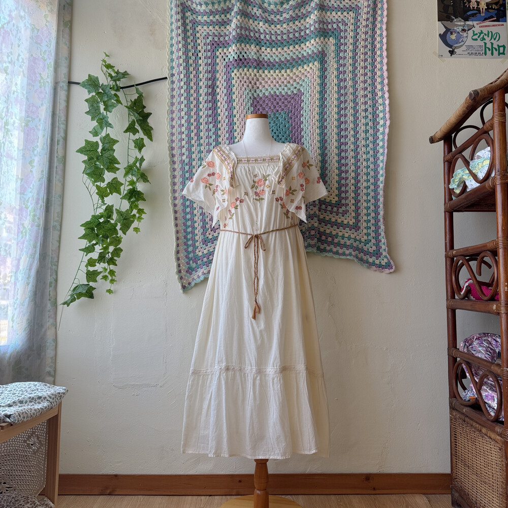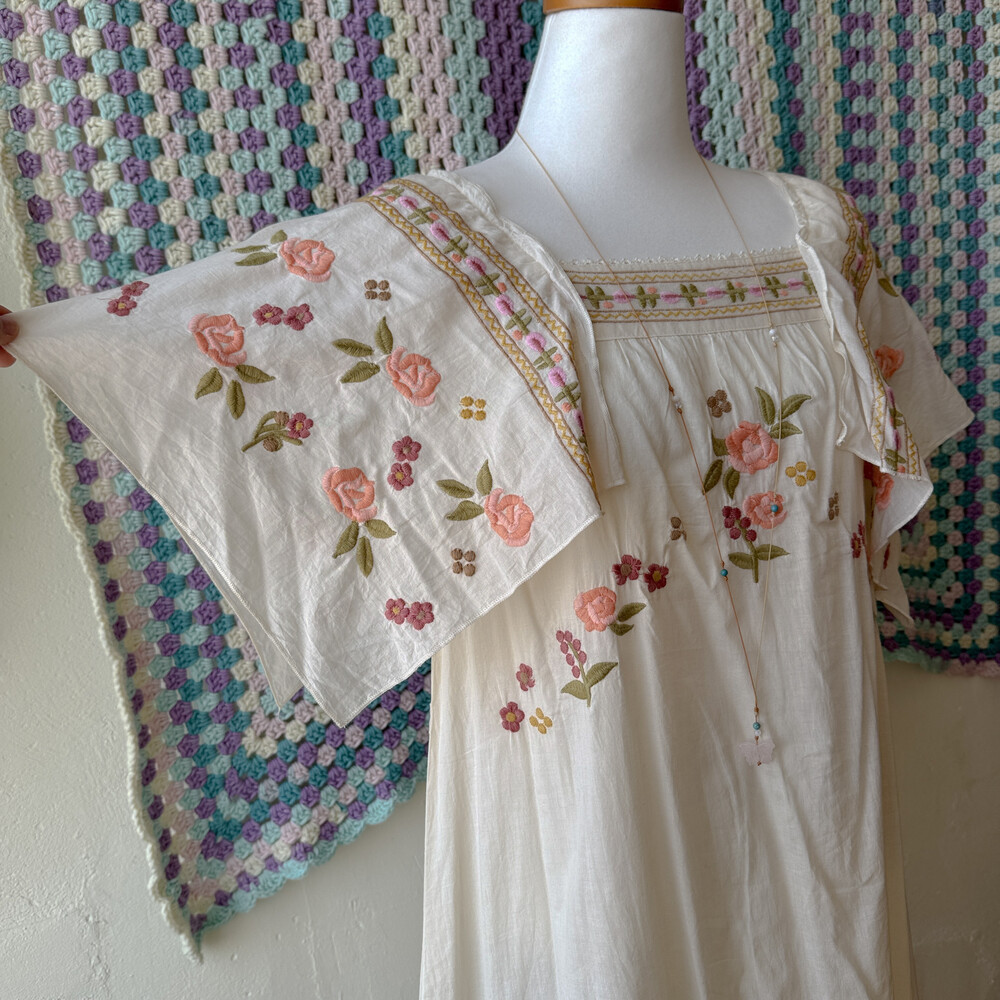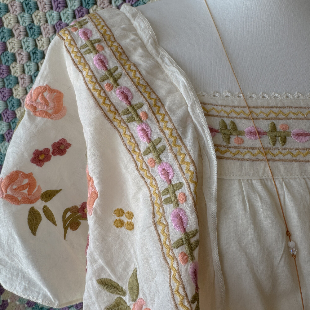 핑크, 살구 등 자수 포인트의 코튼 원피스예요