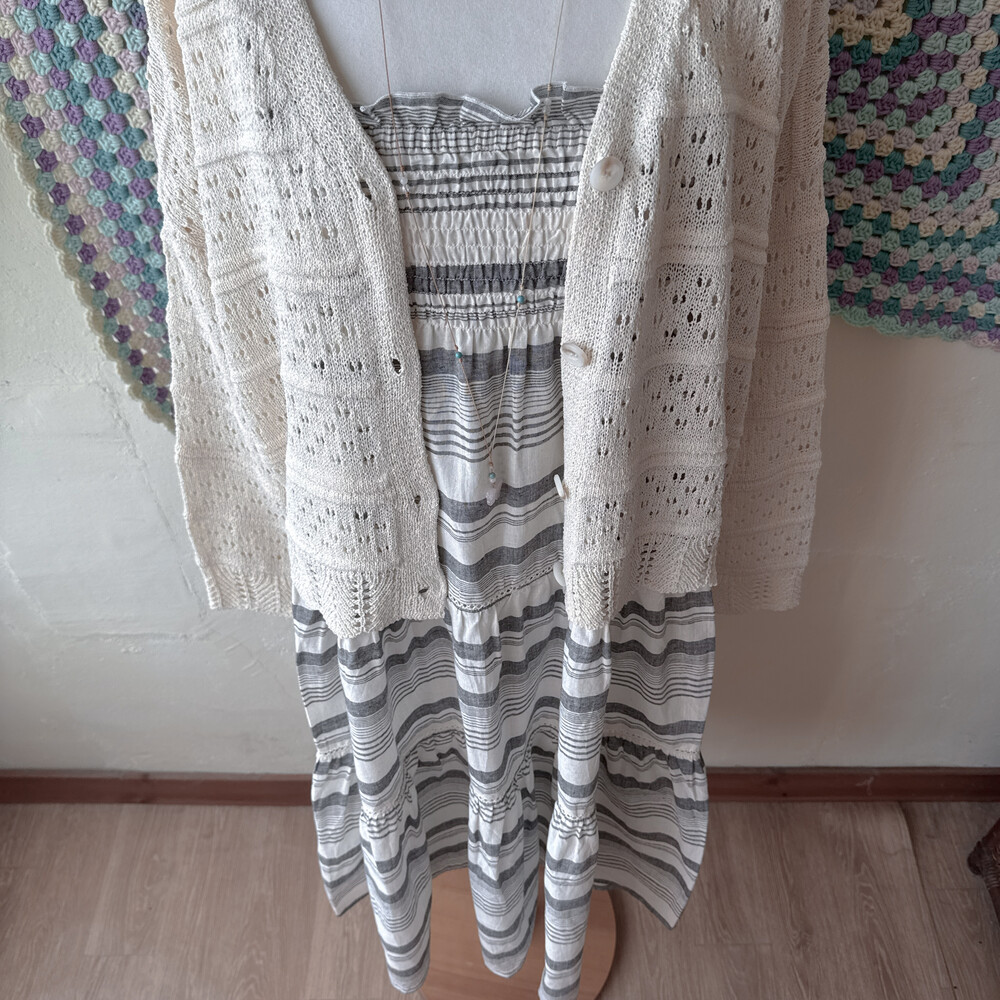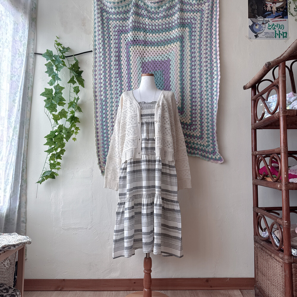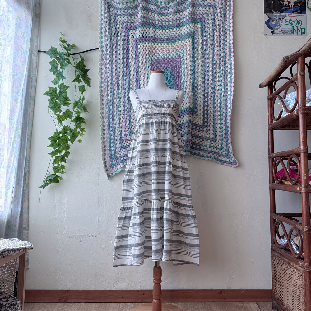 밀크와 그레이 색감의 스트라이프 끈원피스예요