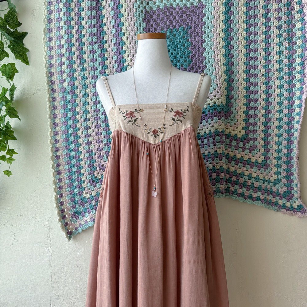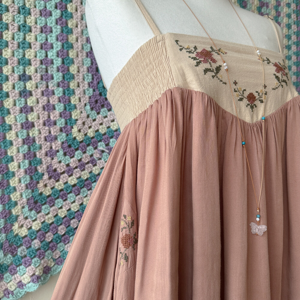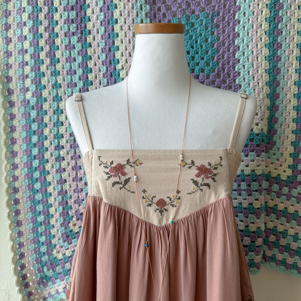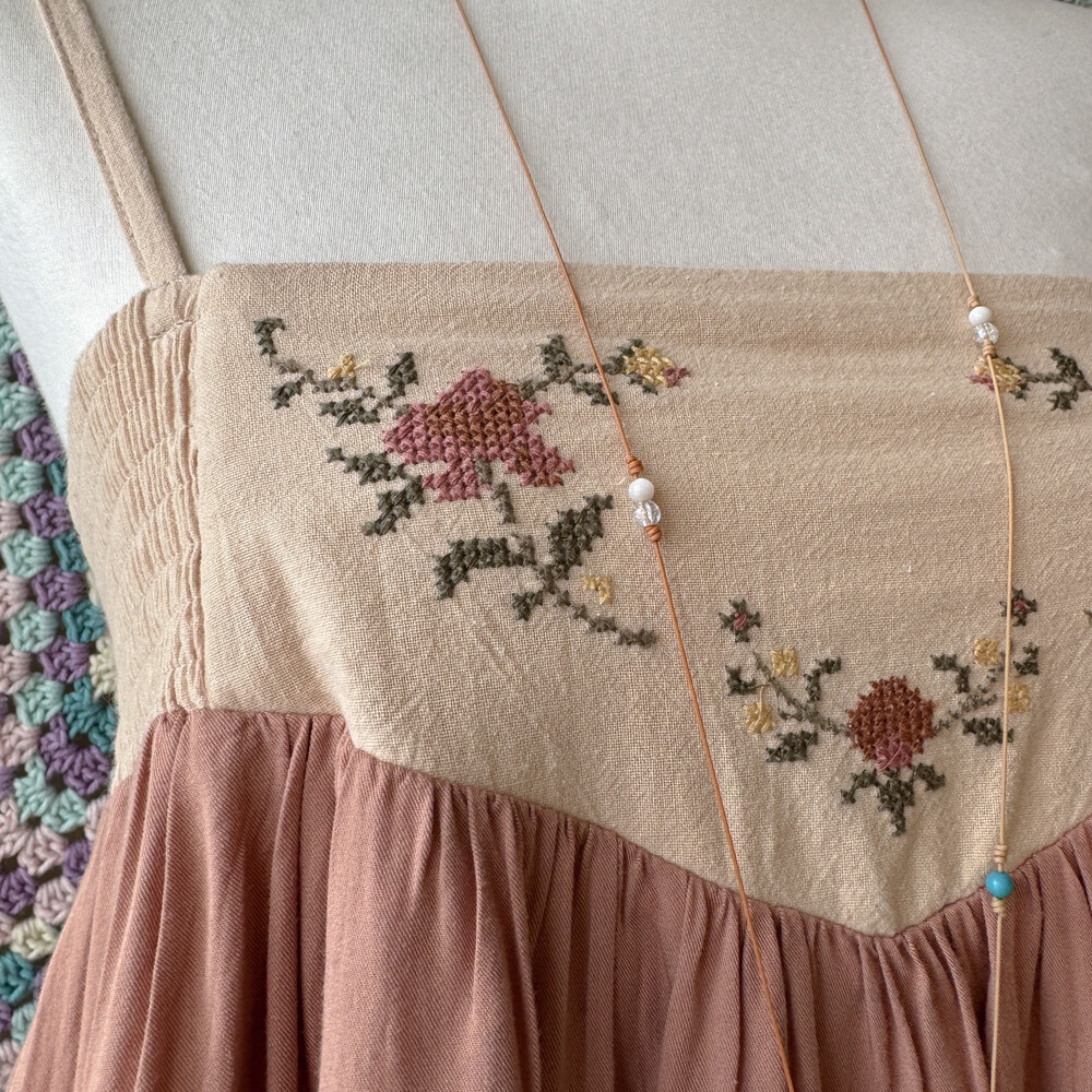 웜한 색감의 십자수 포인트 끈원피스예요