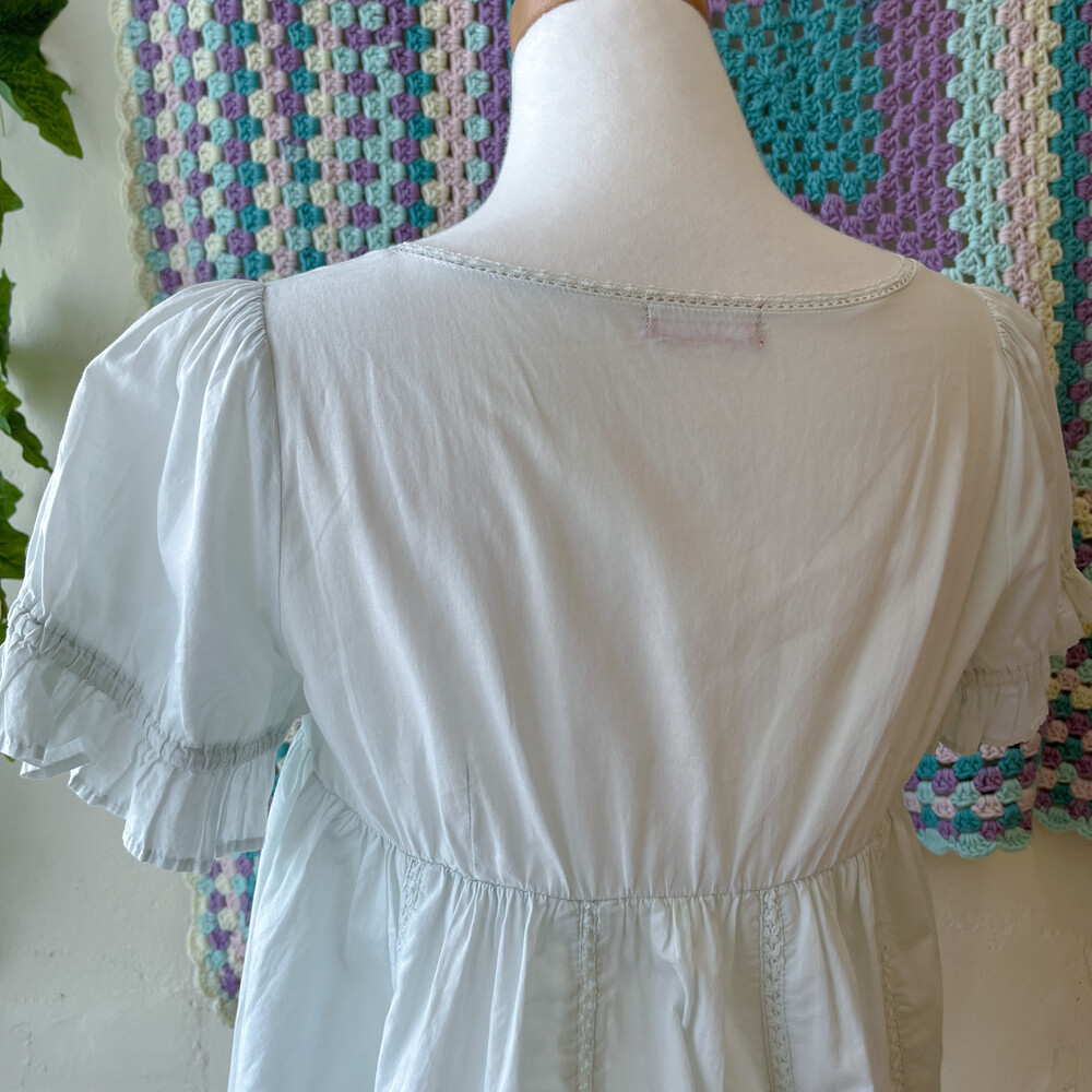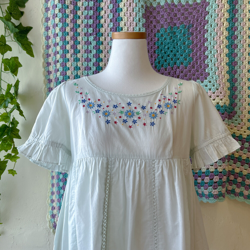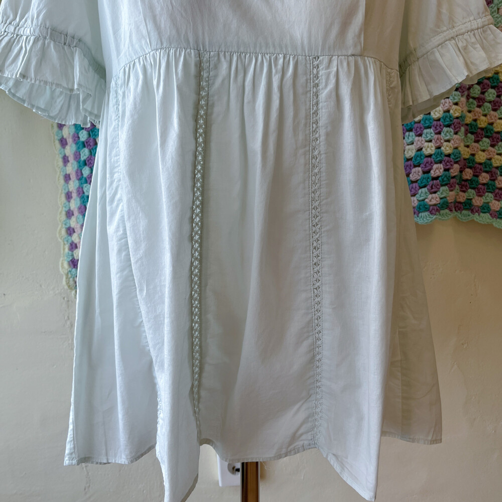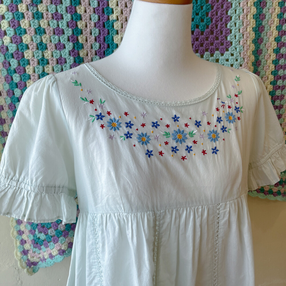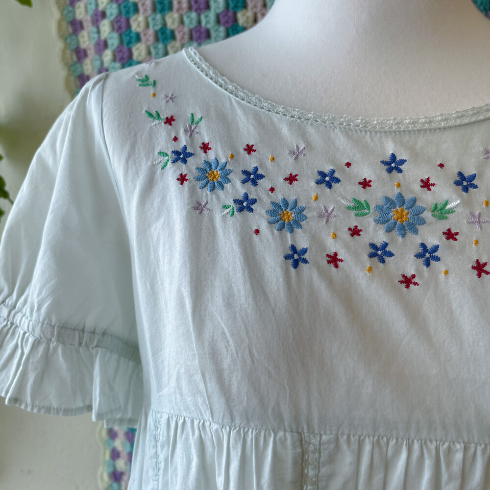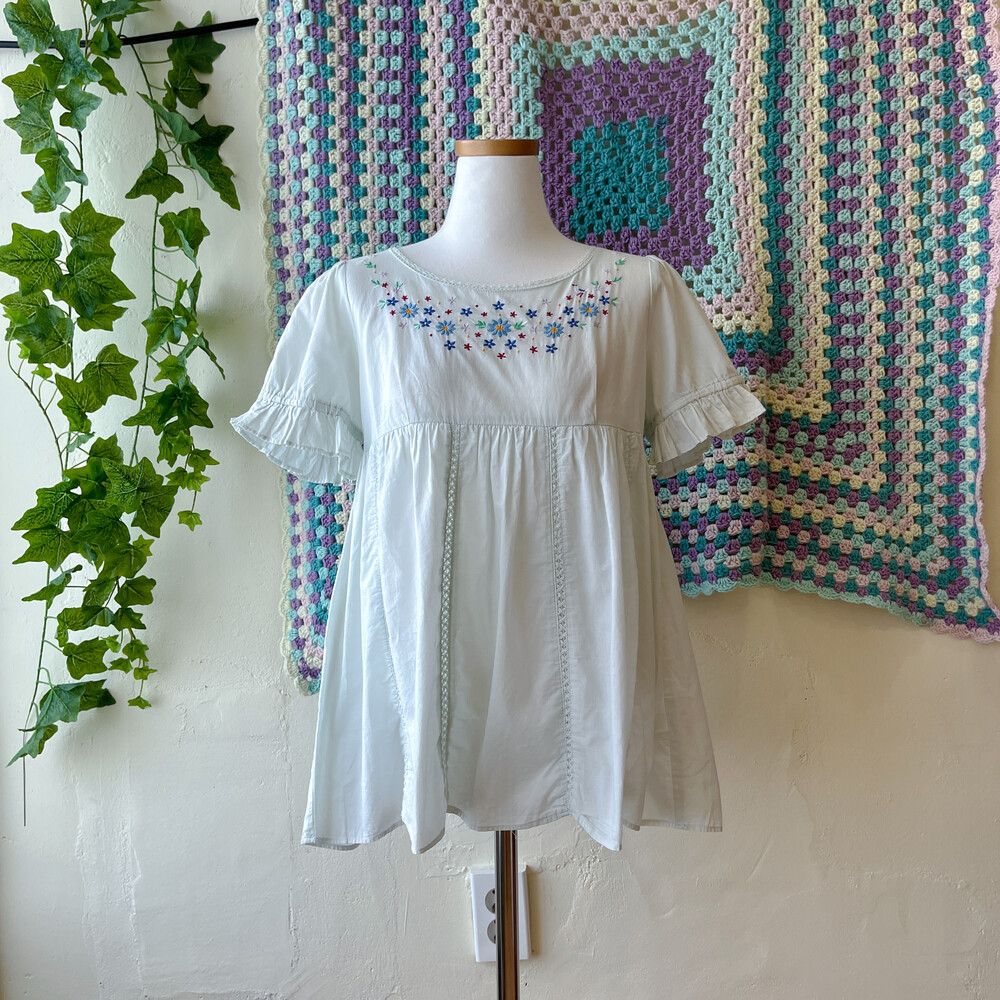 옅은 아쿠아블루 색감의 자수 블라우스예요