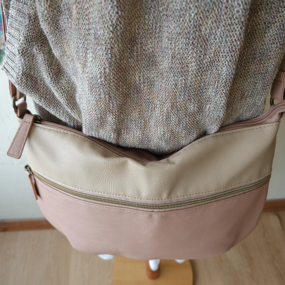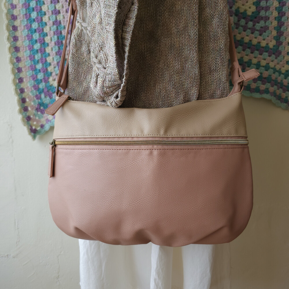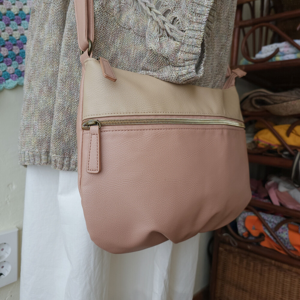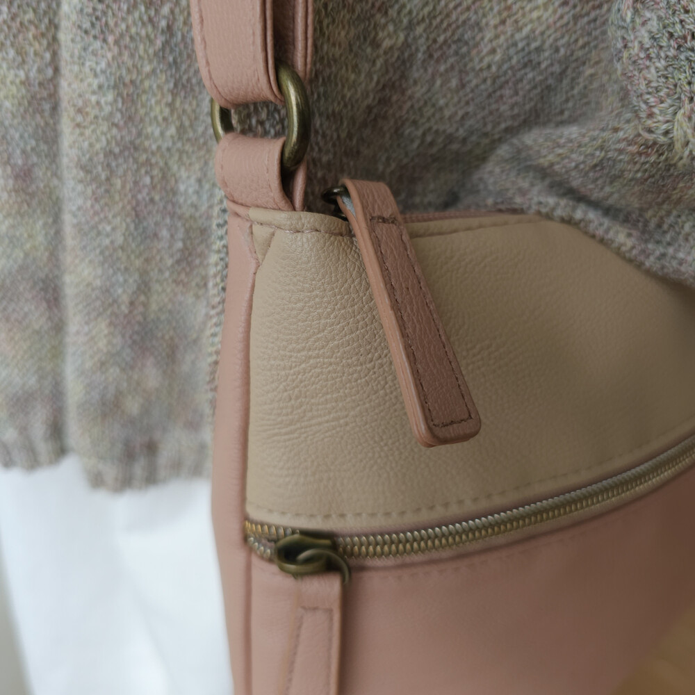 웜한 핑크색감과 베이지색이 조합된 크로스백이에요