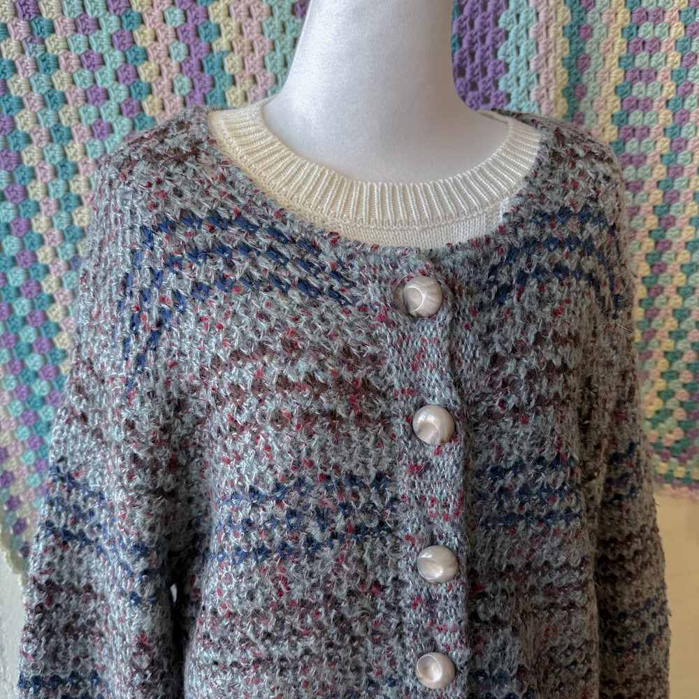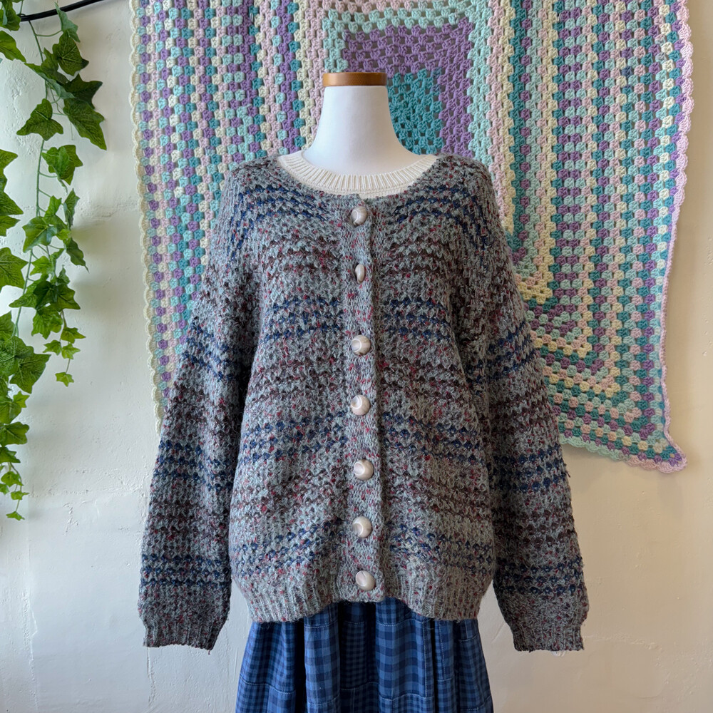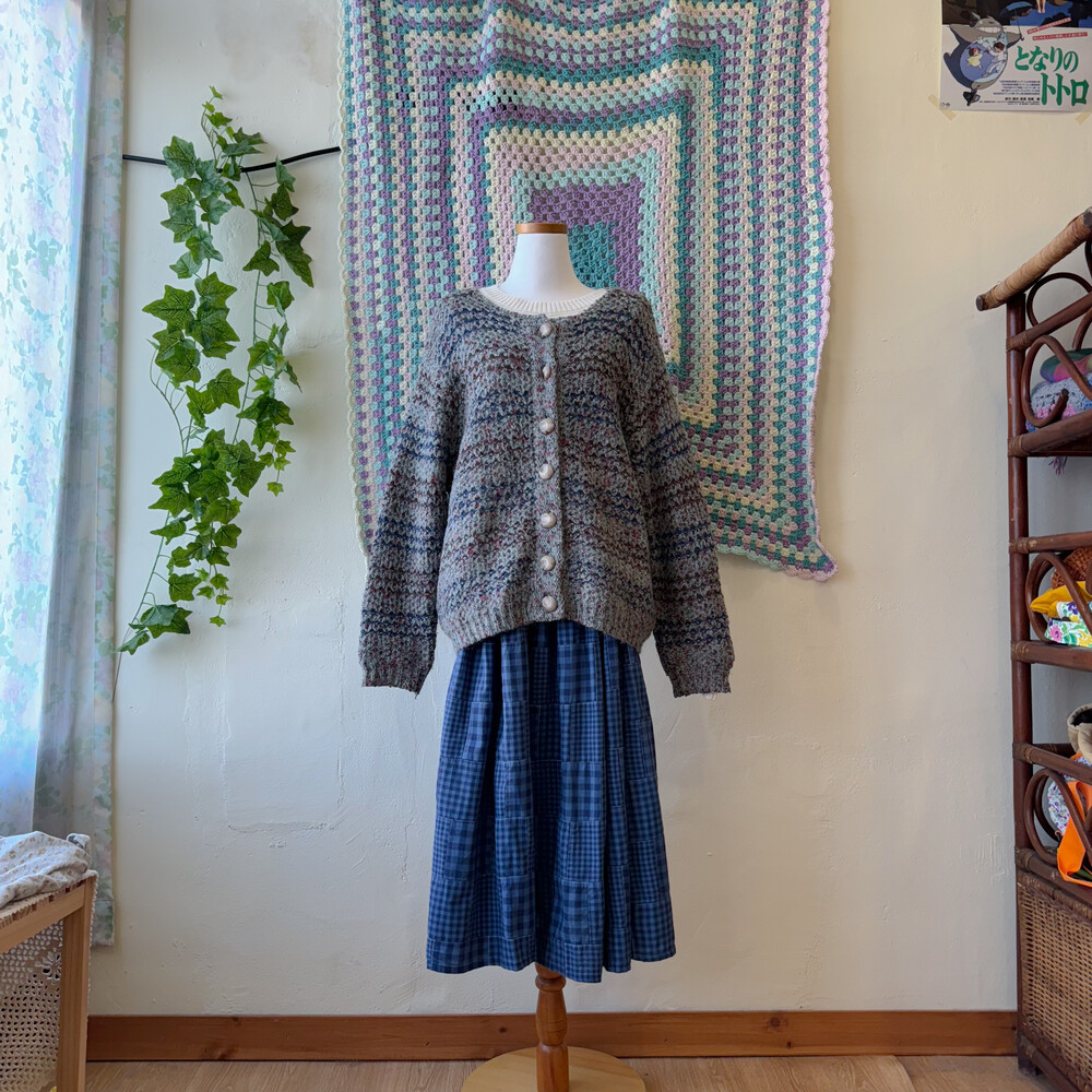 민트그레이 색감 바탕의 믹스 가디건이에요