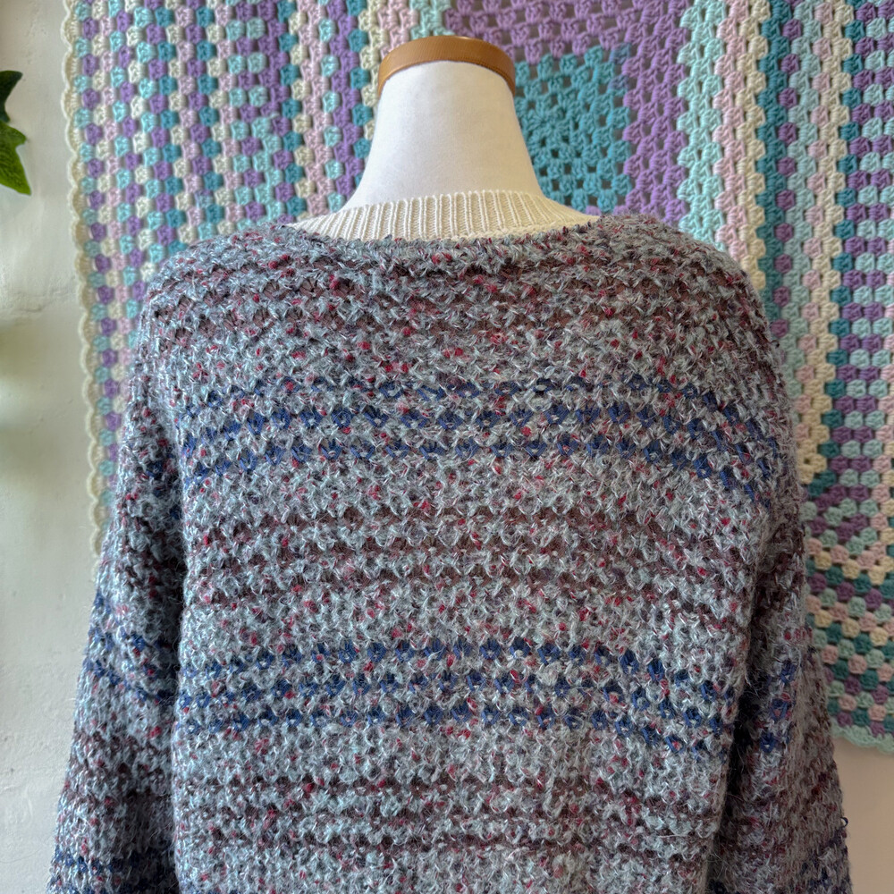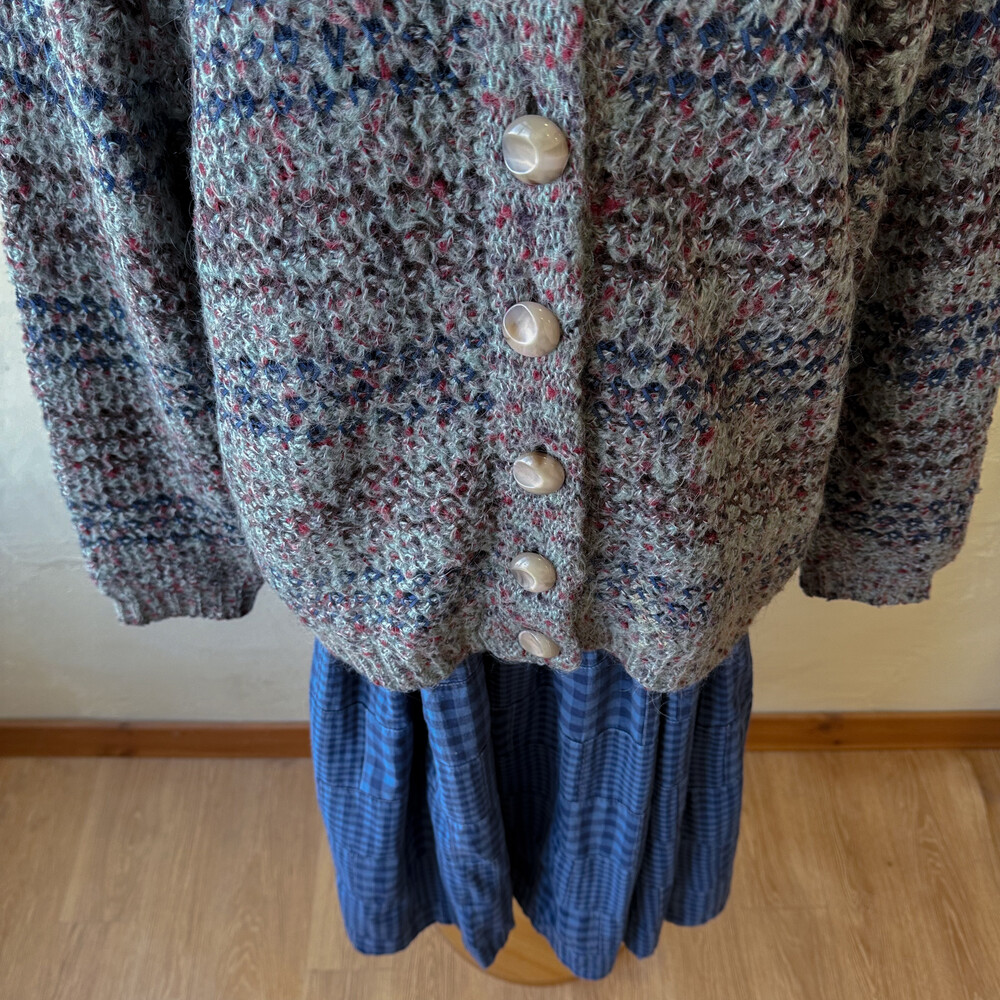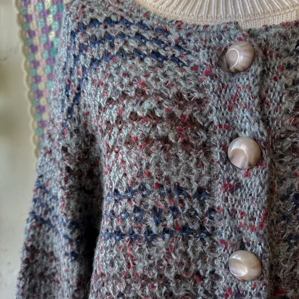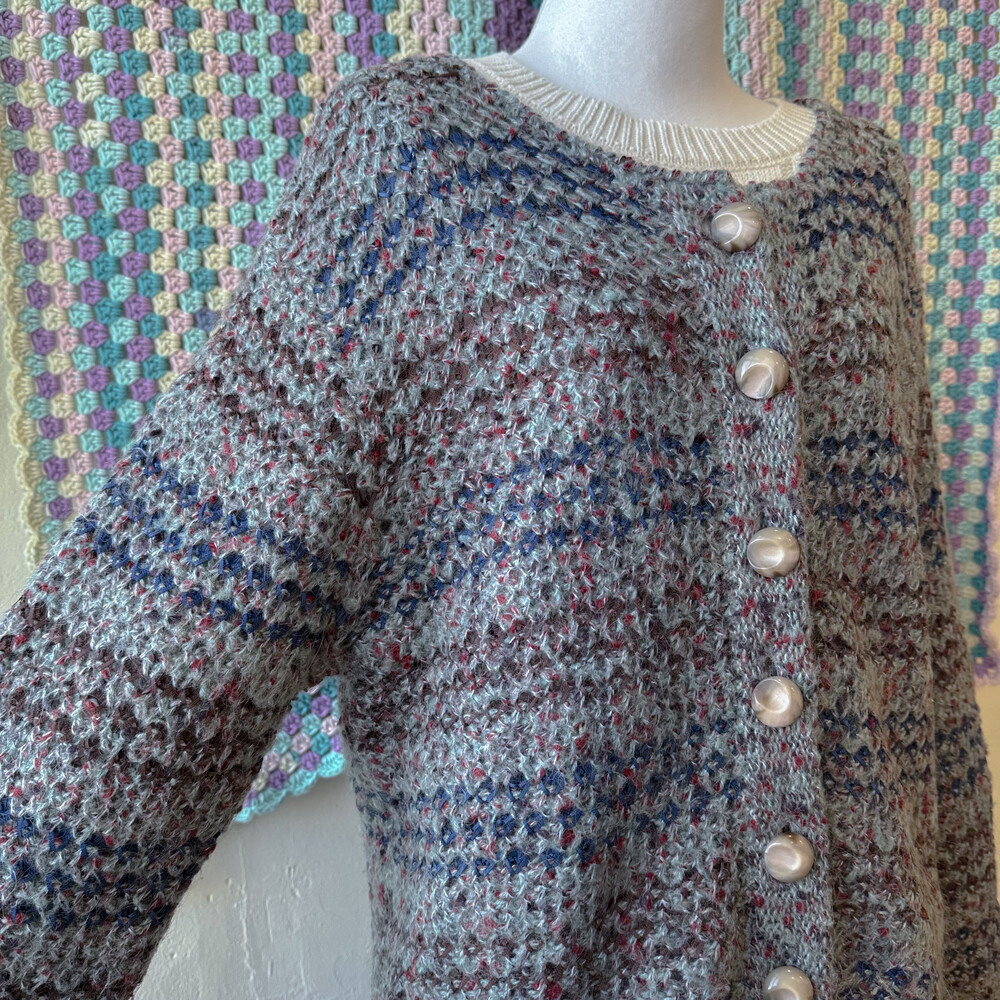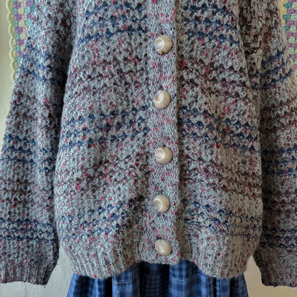 블루, 브라운 실들이 짜여있는 가디건이고