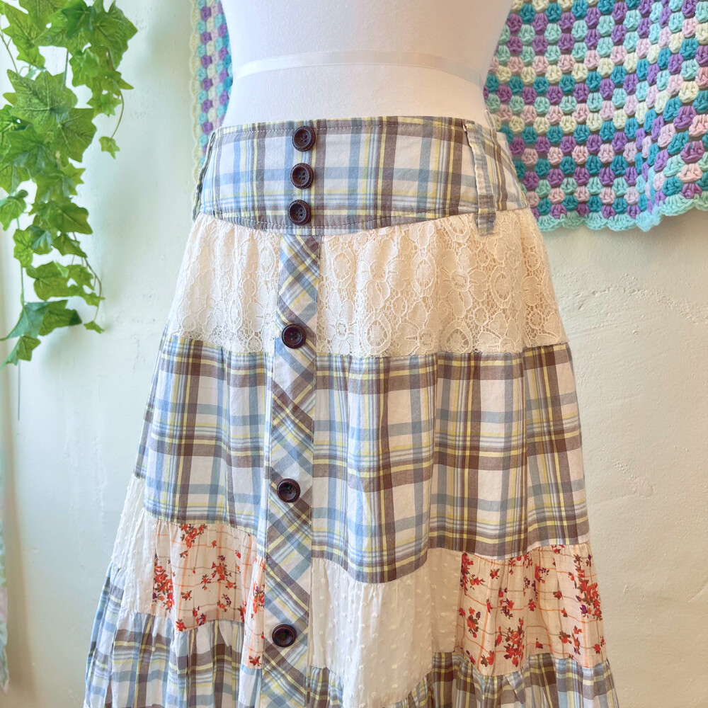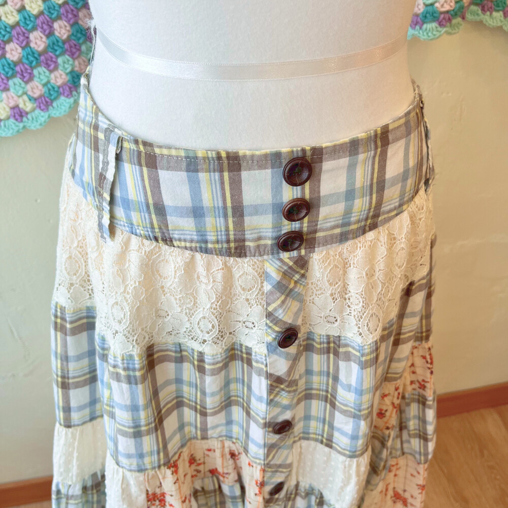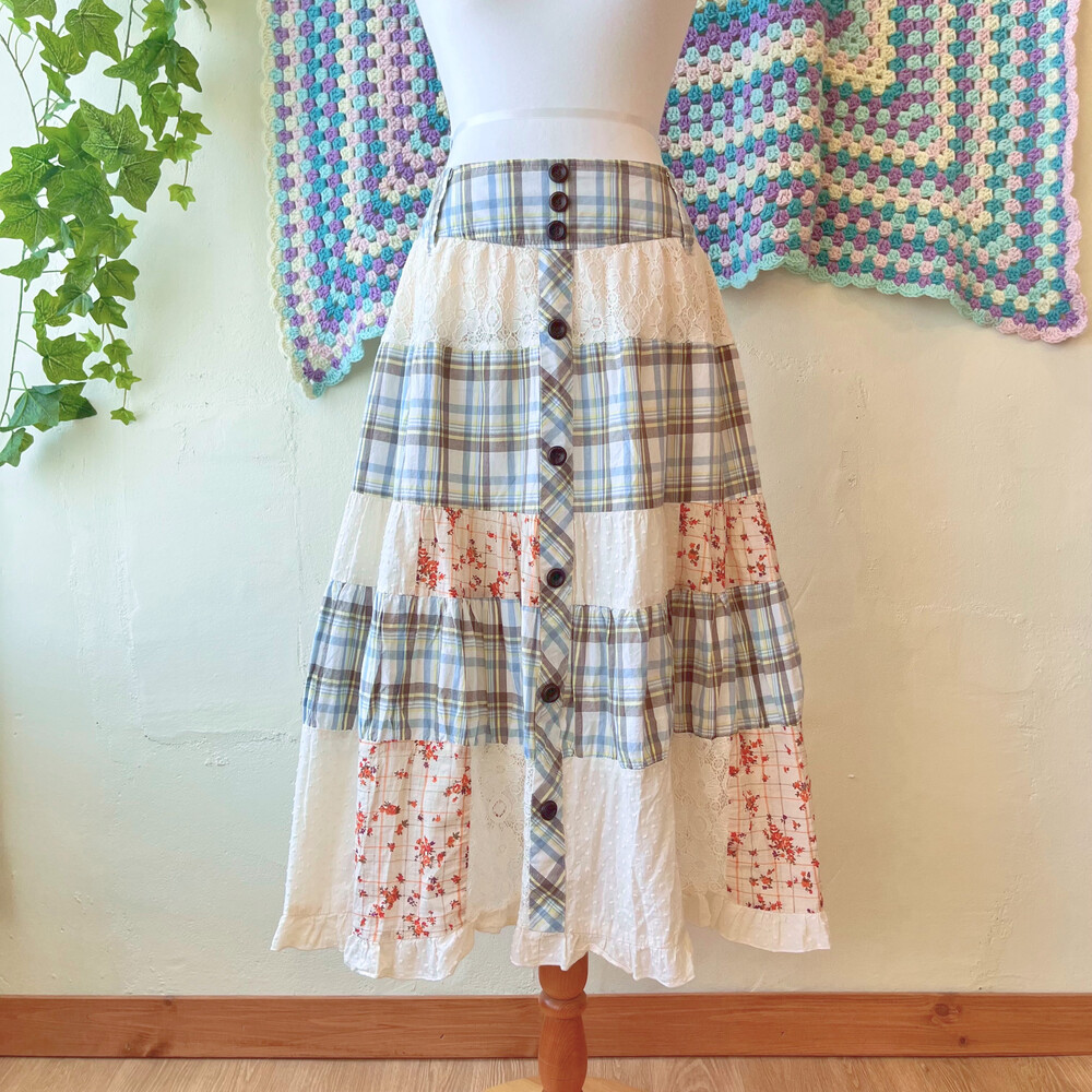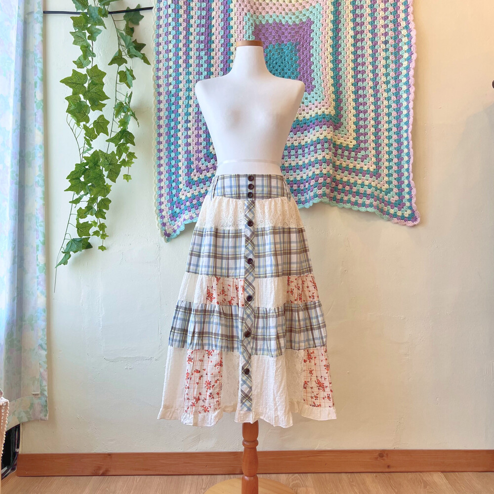 코지한 느낌의 체크 패치 스커트예요