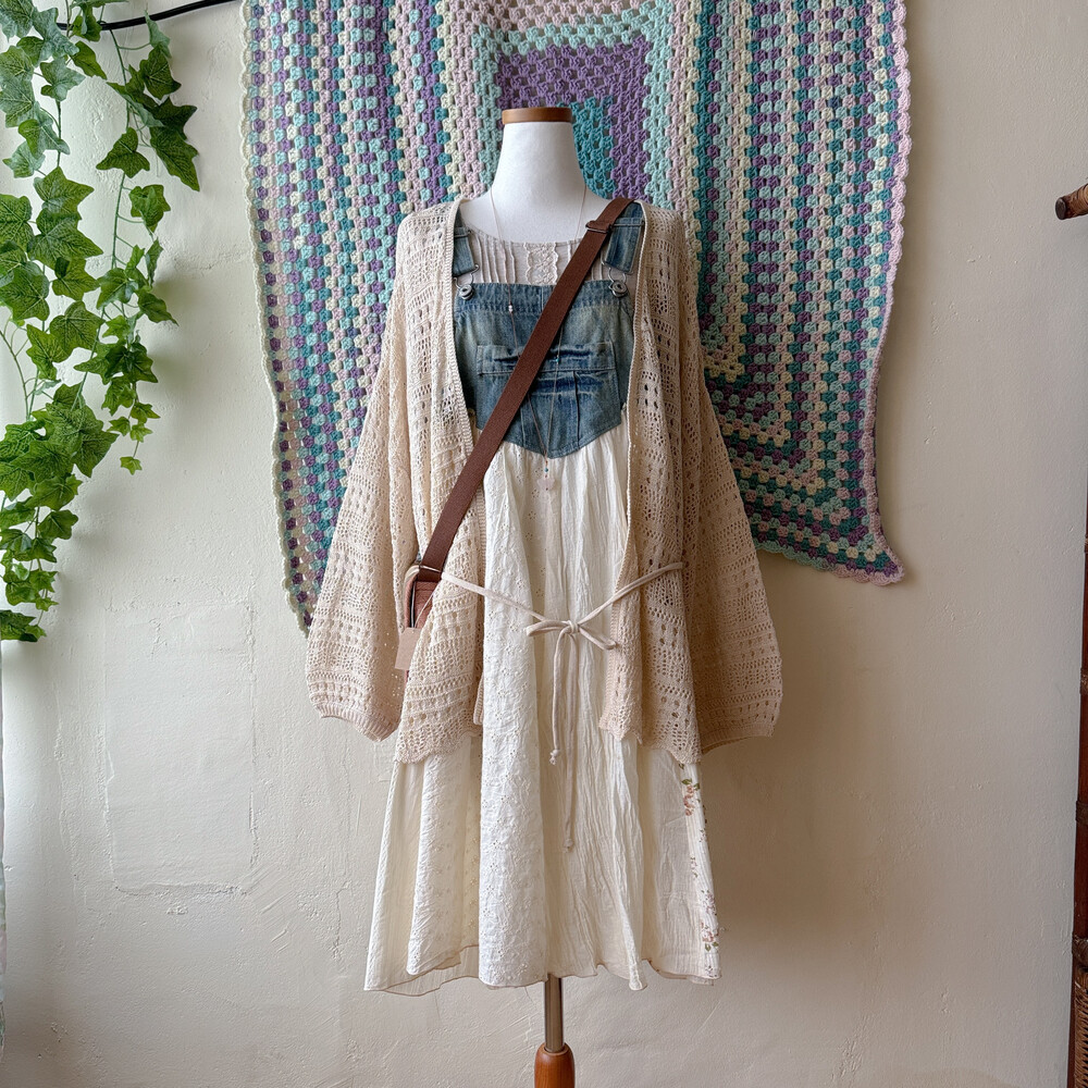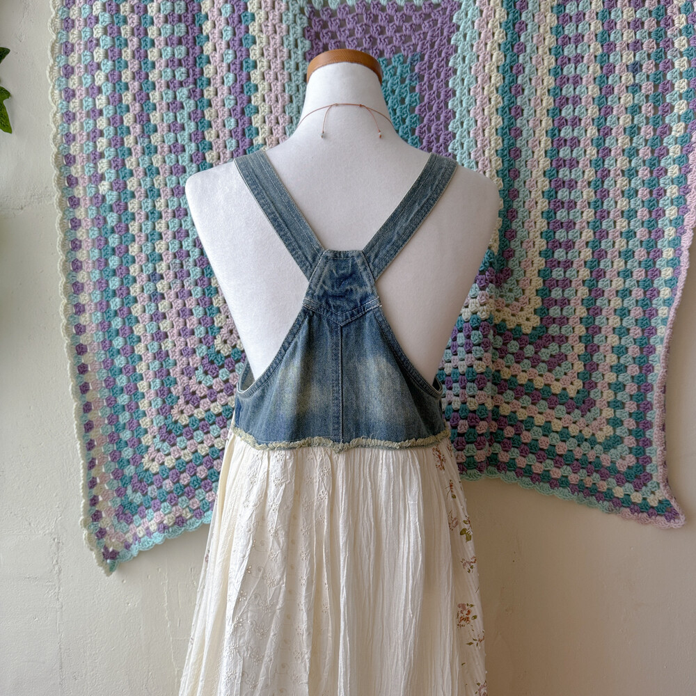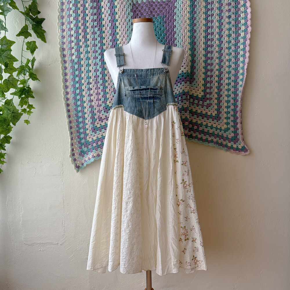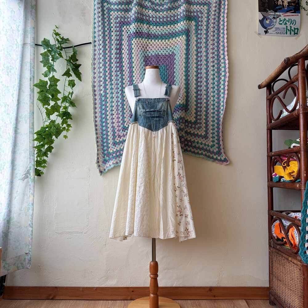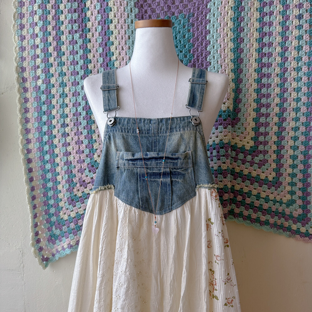 코지한 분위기의 데님 패치워크 오버롤 원피스예요