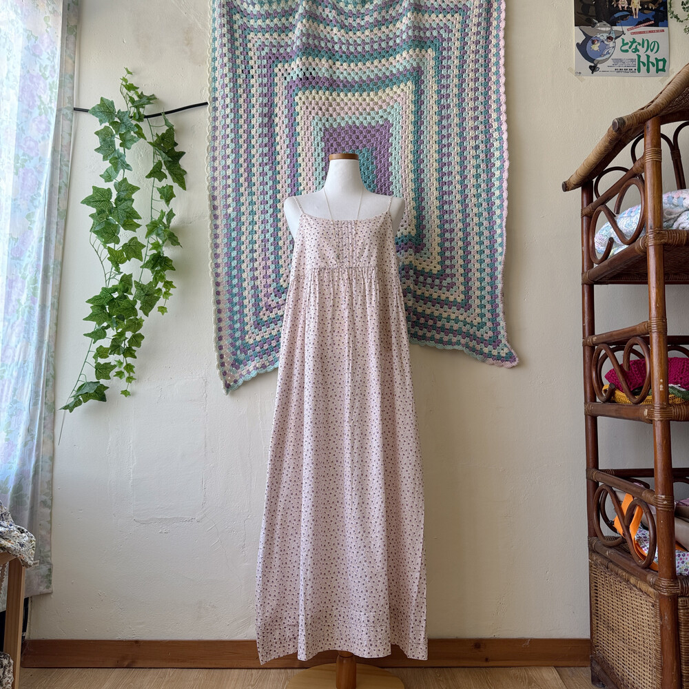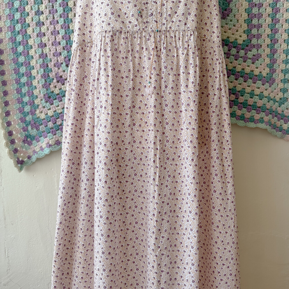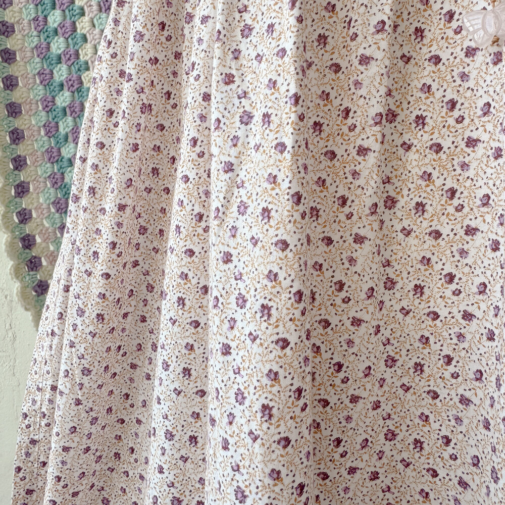 퍼플 잔꽃 패턴의 백버튼 끈원피스예요