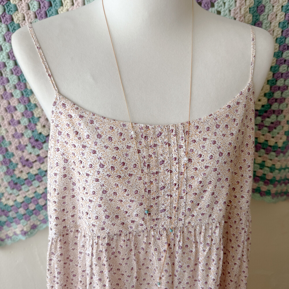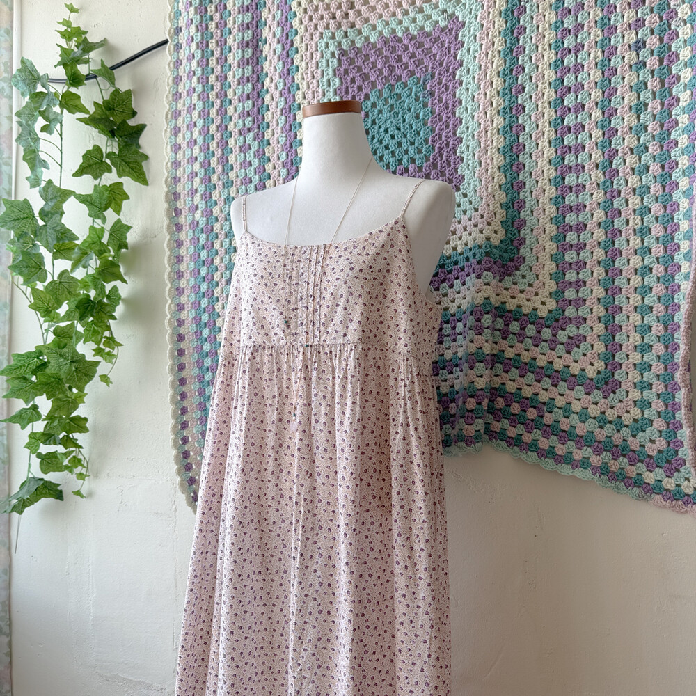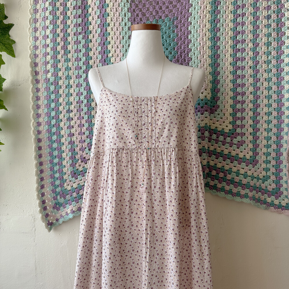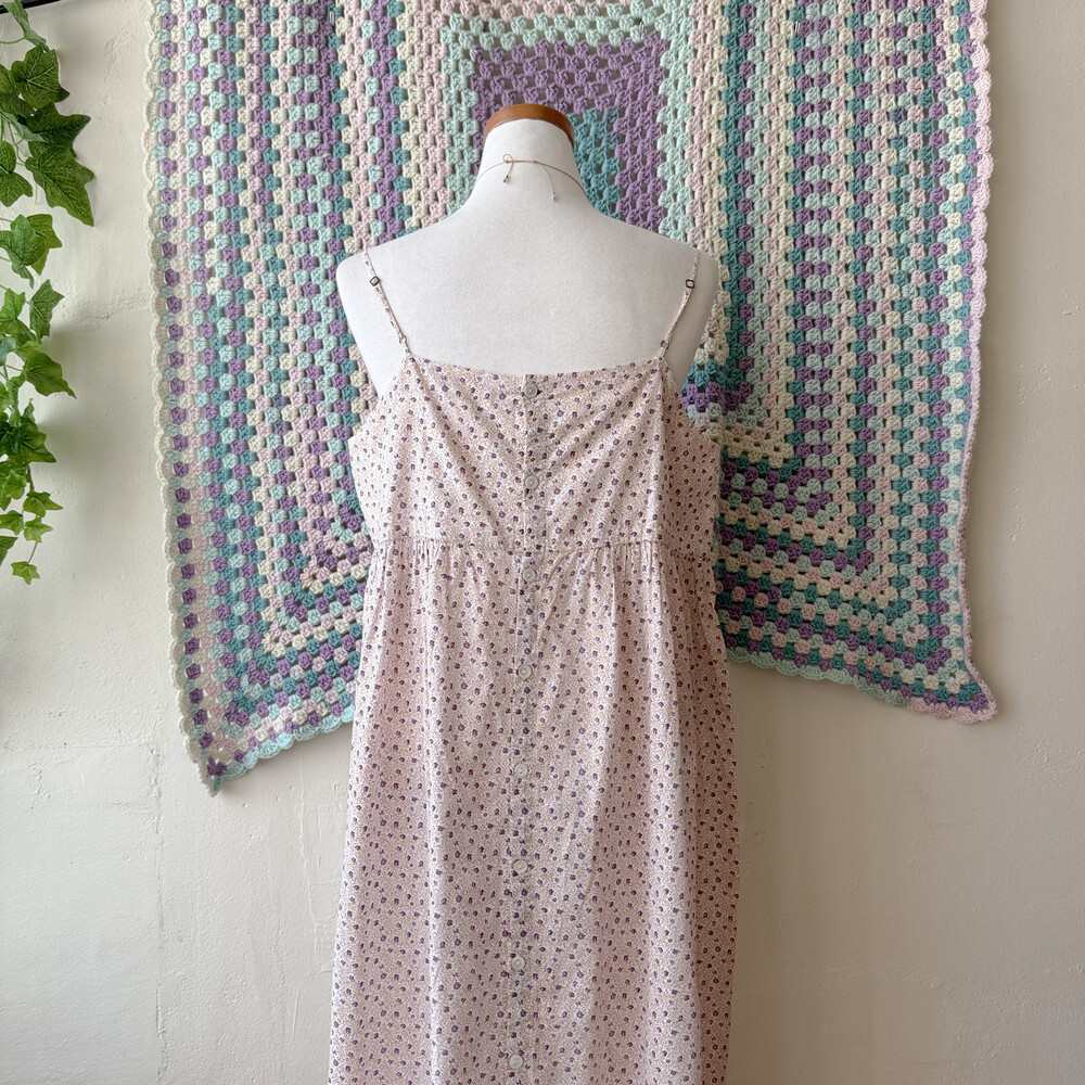퍼플 잔꽃 패턴의 백버튼 끈원피스예요