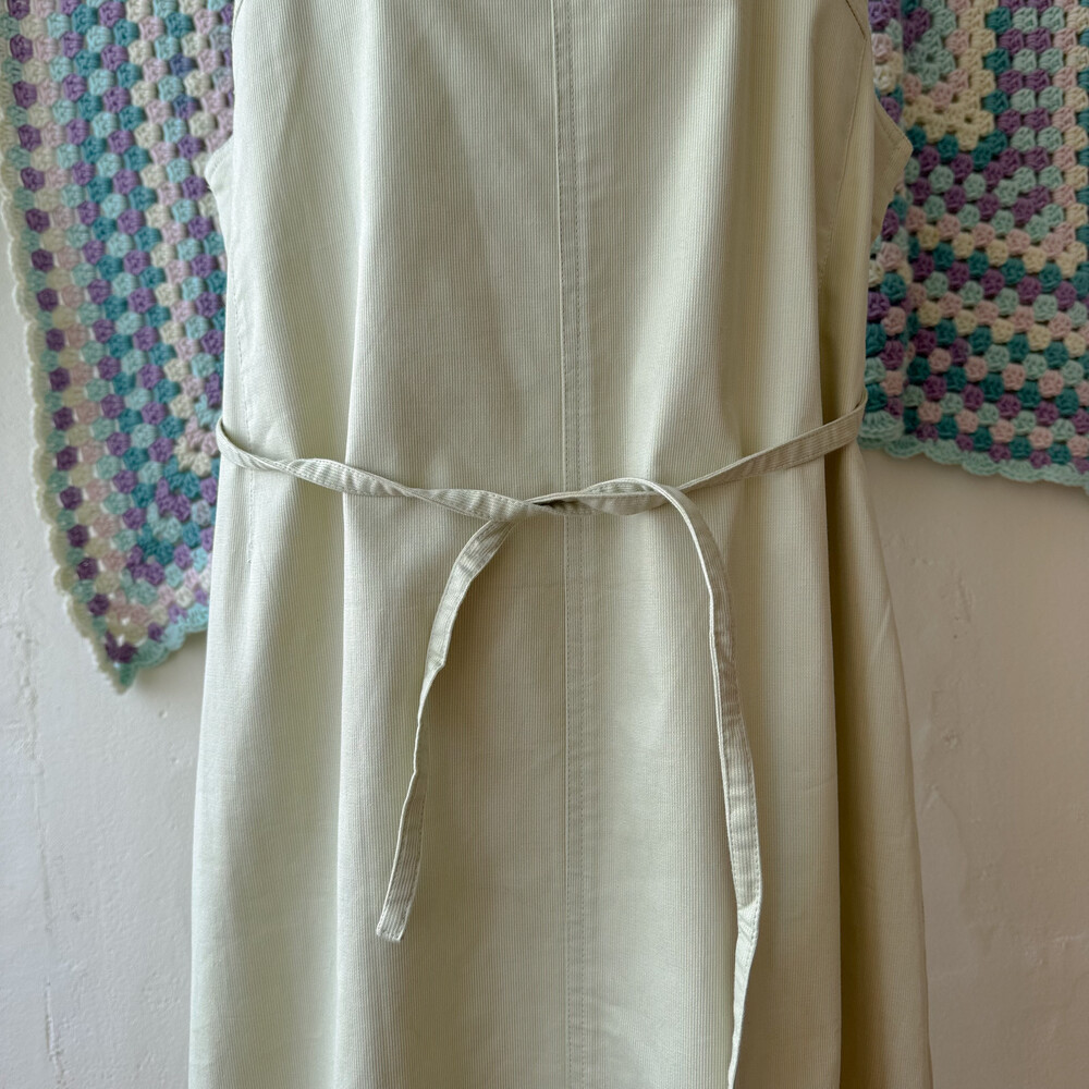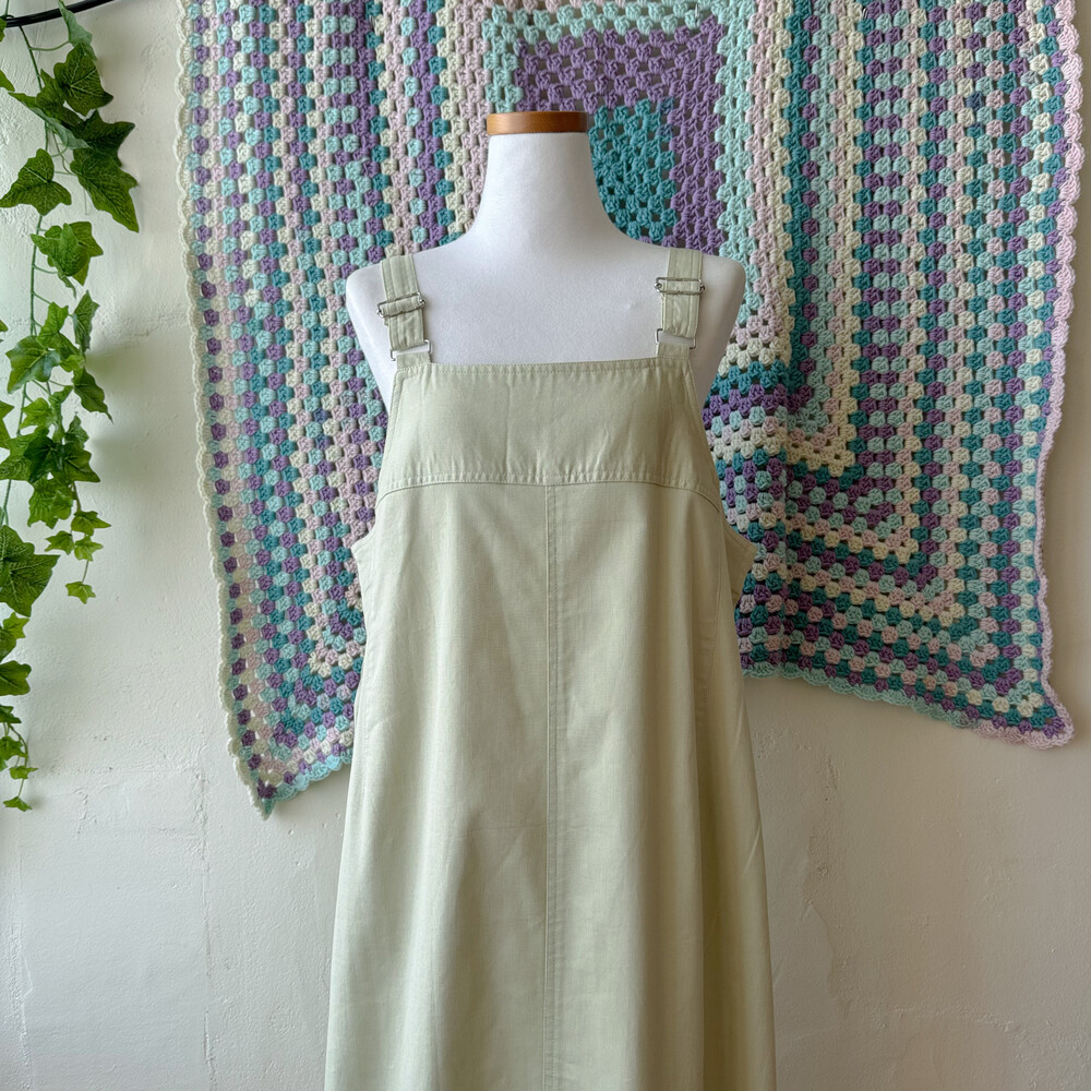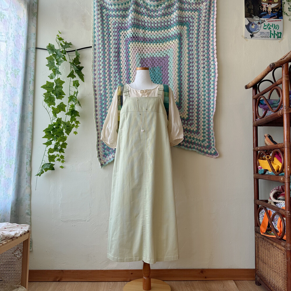 밝은 올리브그린 색감의 오버롤 원피스예요