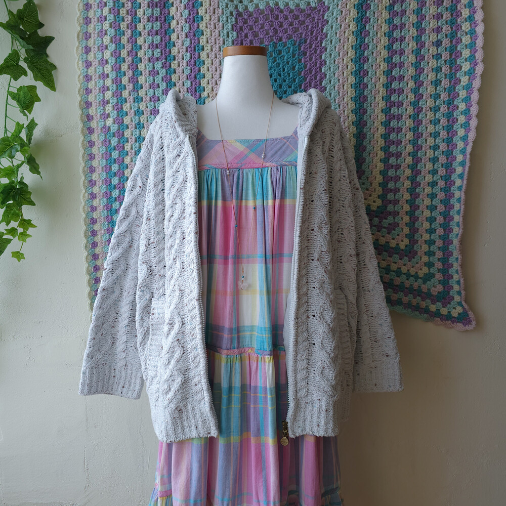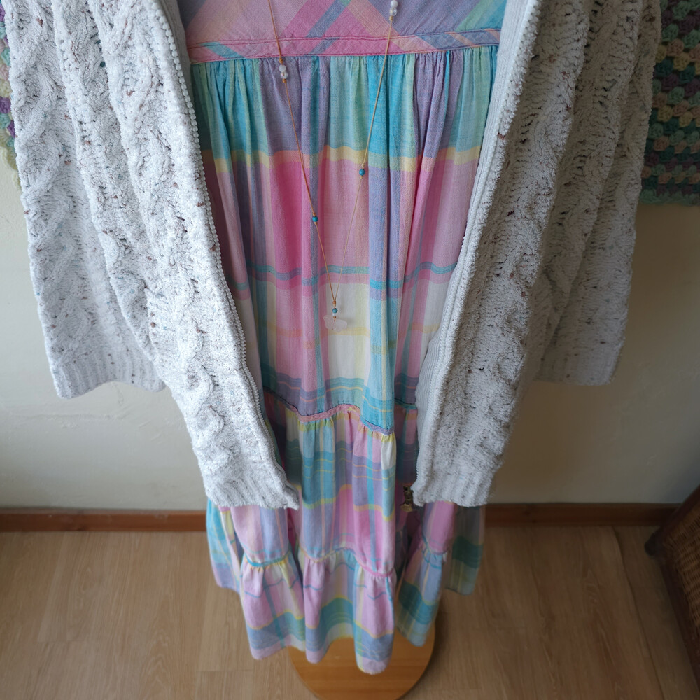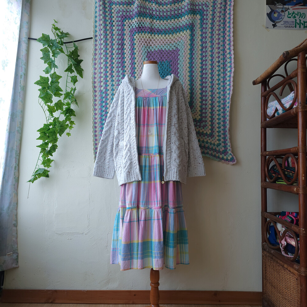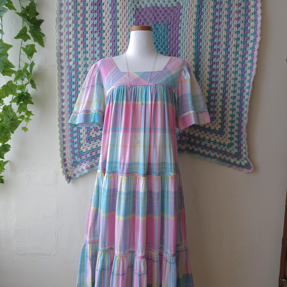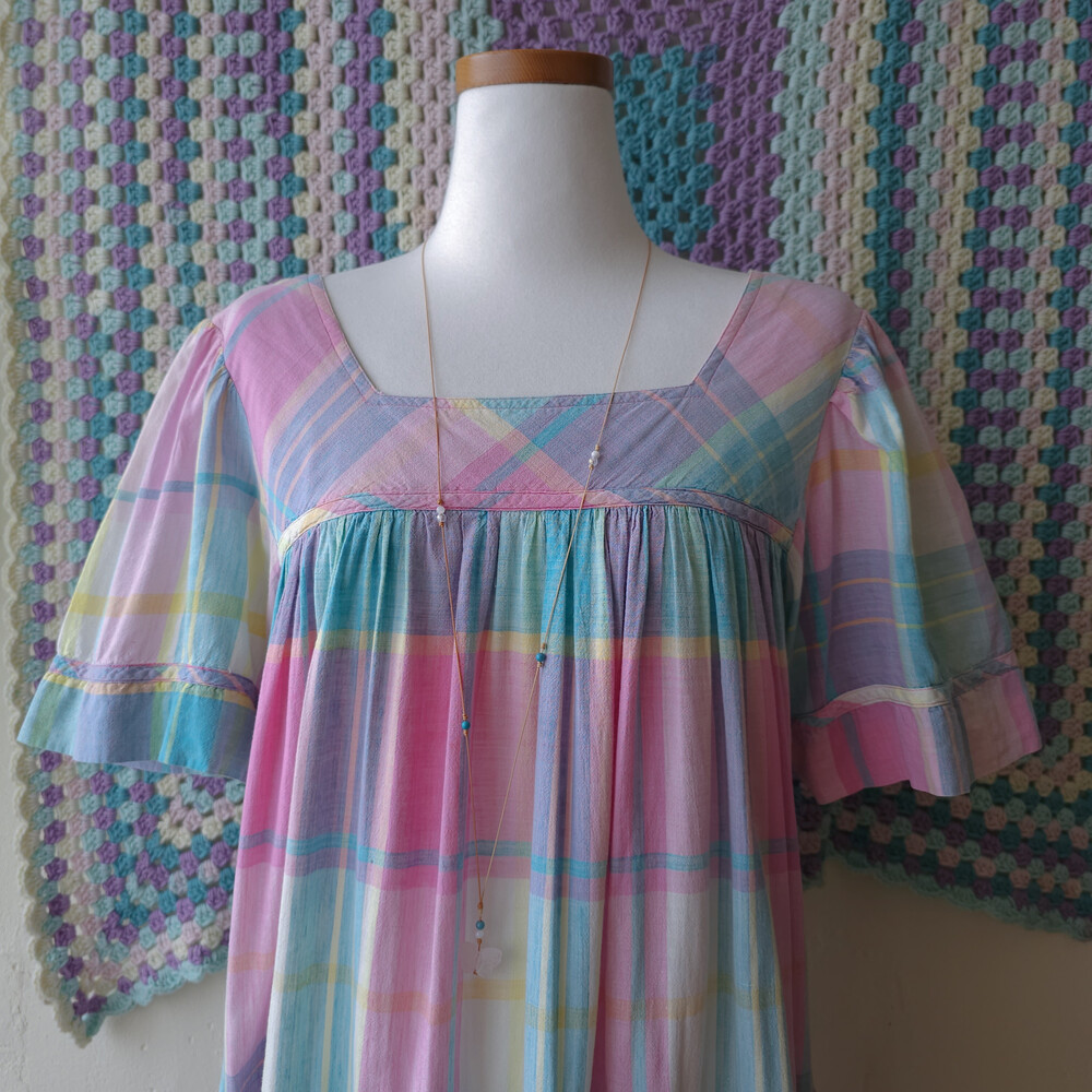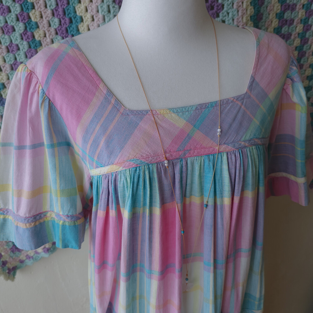 핑크와 아쿠아블루 색감 조합의 체크 원피스예요