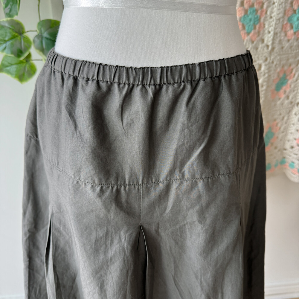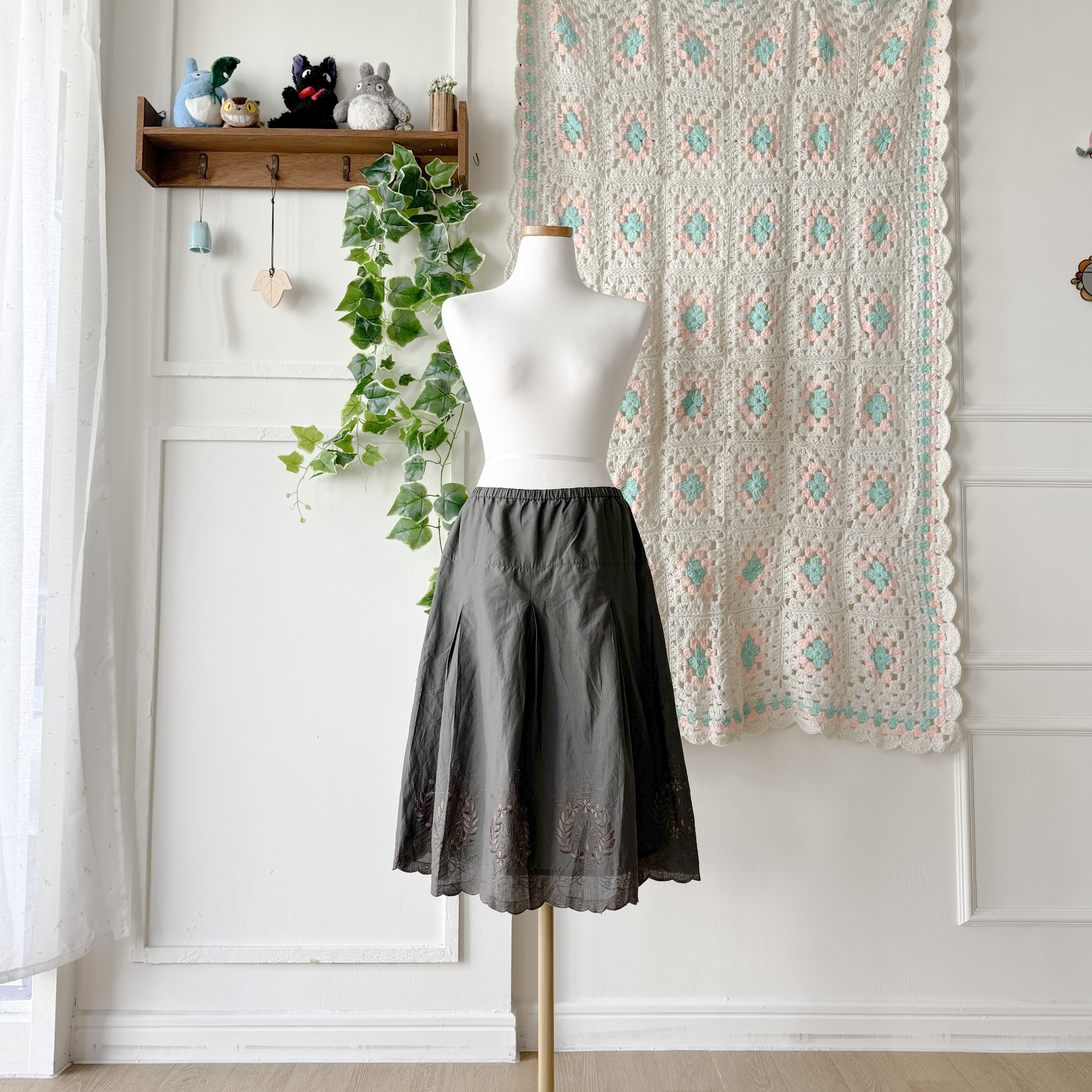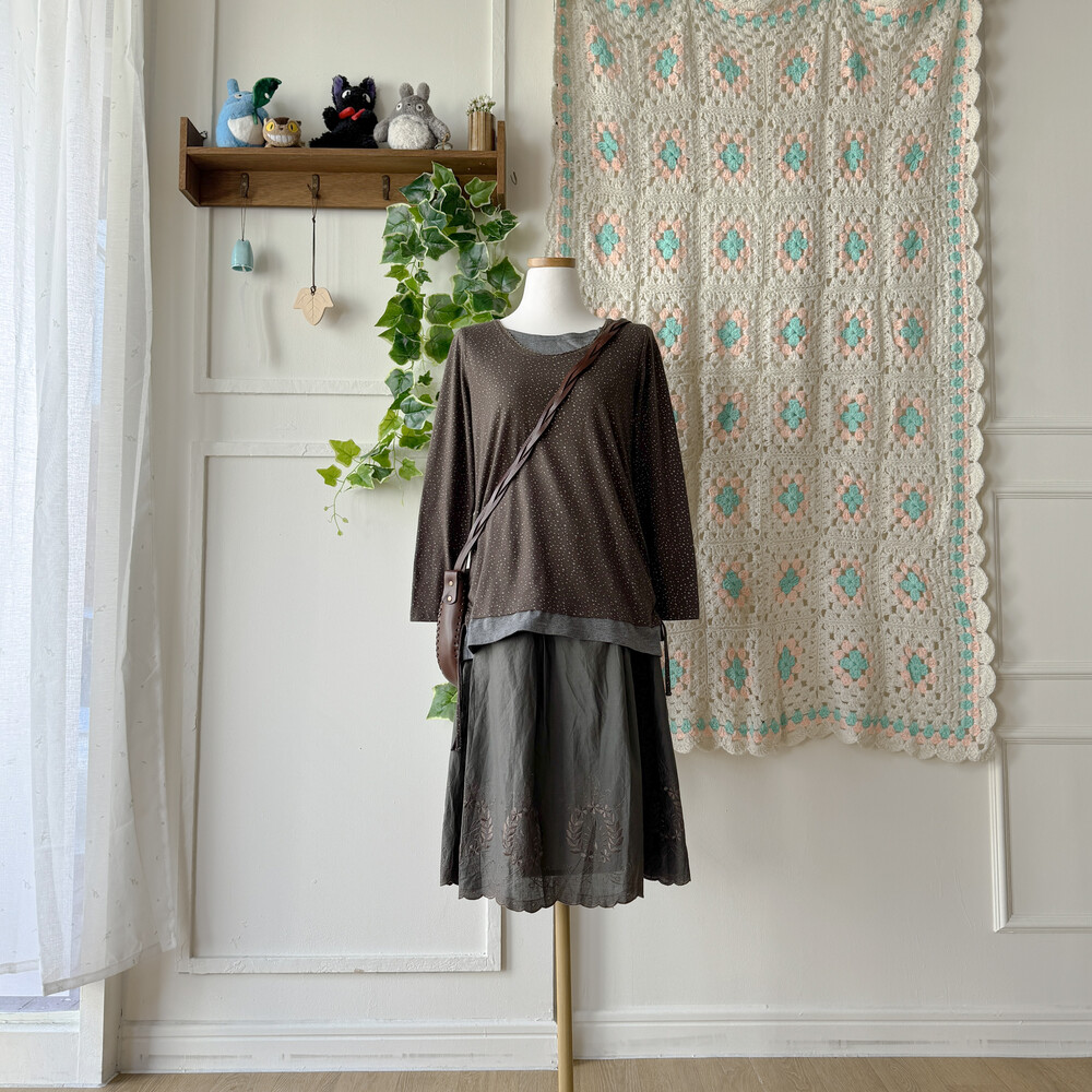 다크 카키 색감의 자수 미디 스커트예요