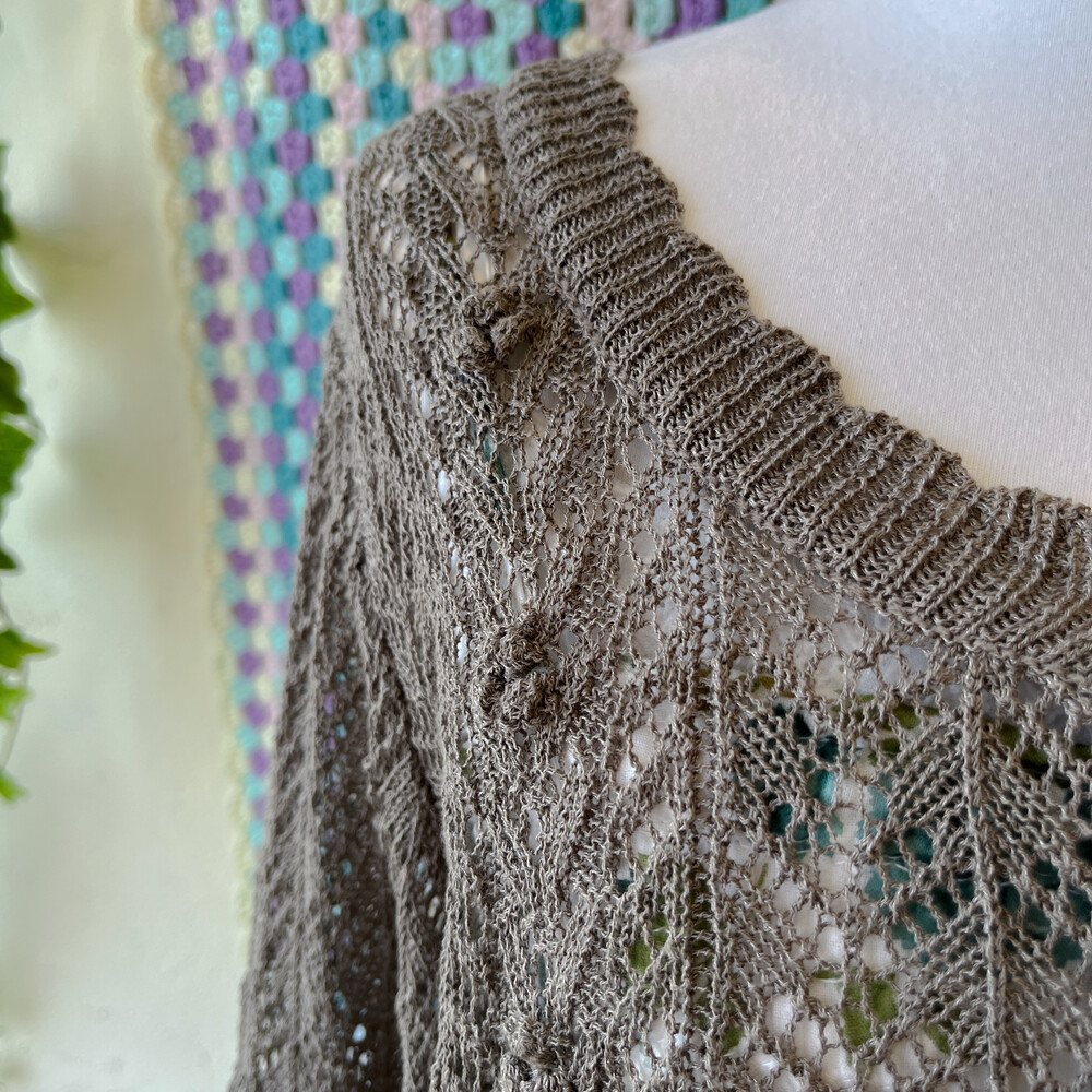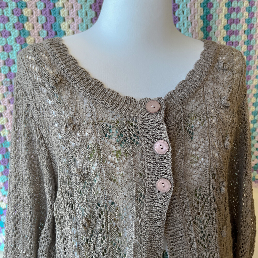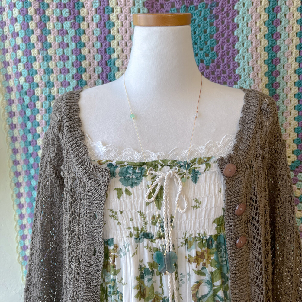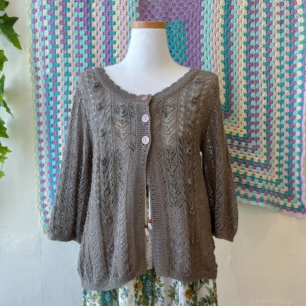 다크 카키 색감의 크로셰 가디건이에요