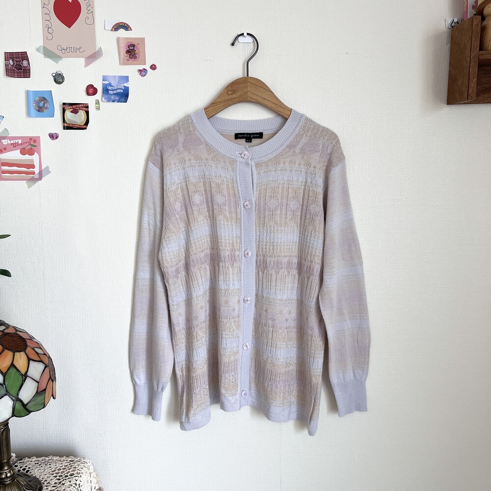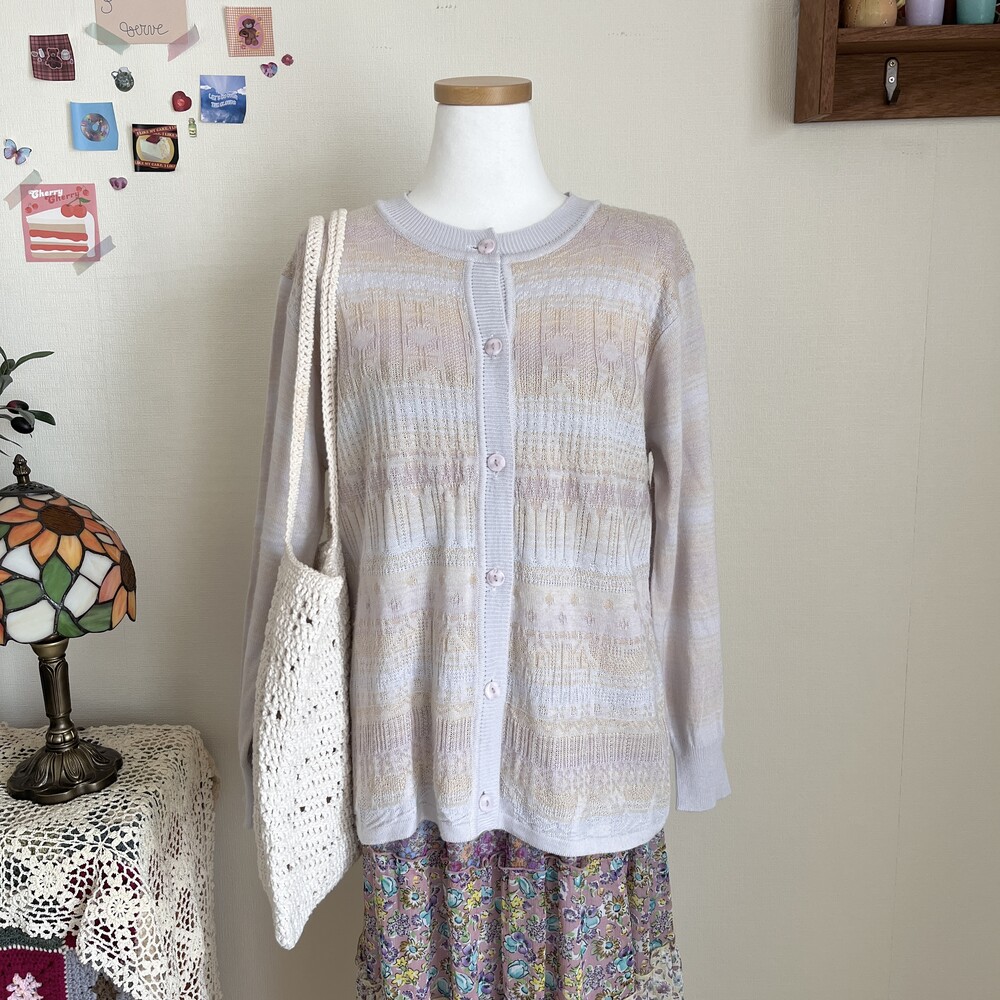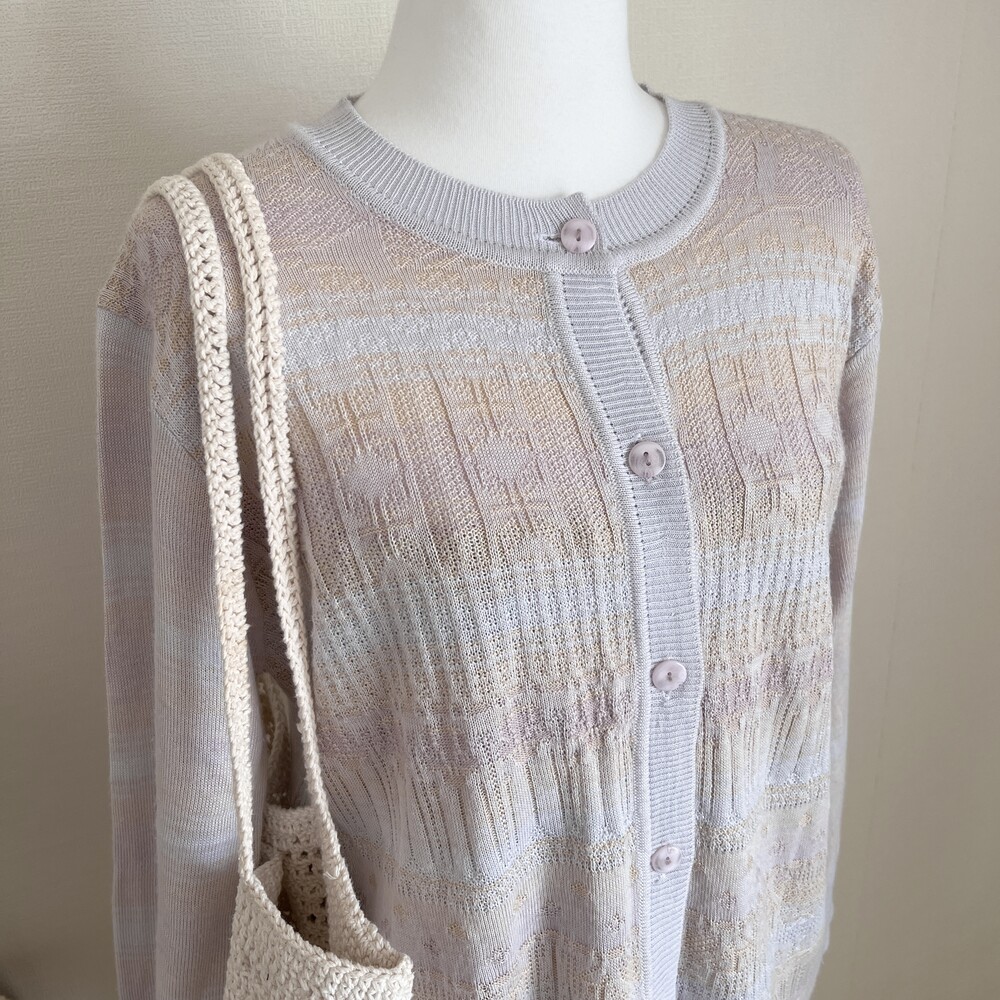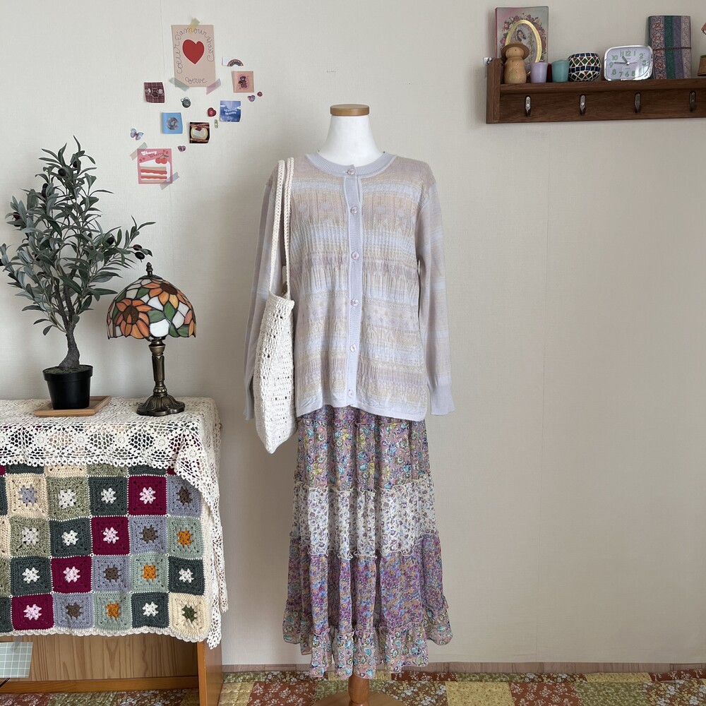 소라색, 연보라색, 분홍색, 살구색이 오묘하게 섞인 가디건으로