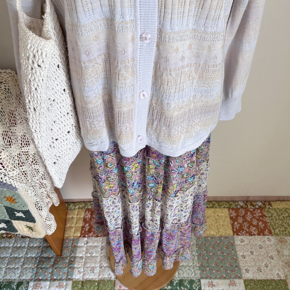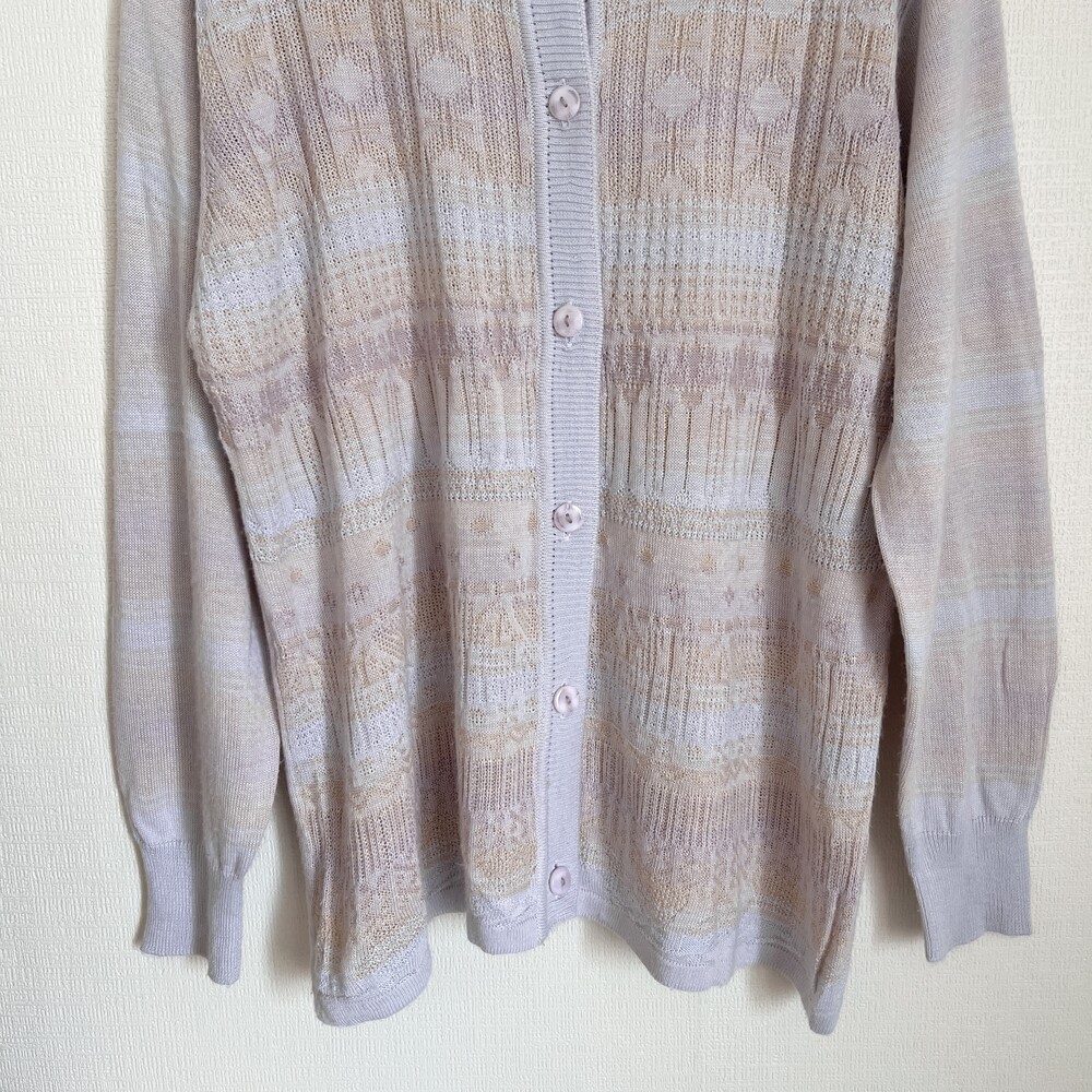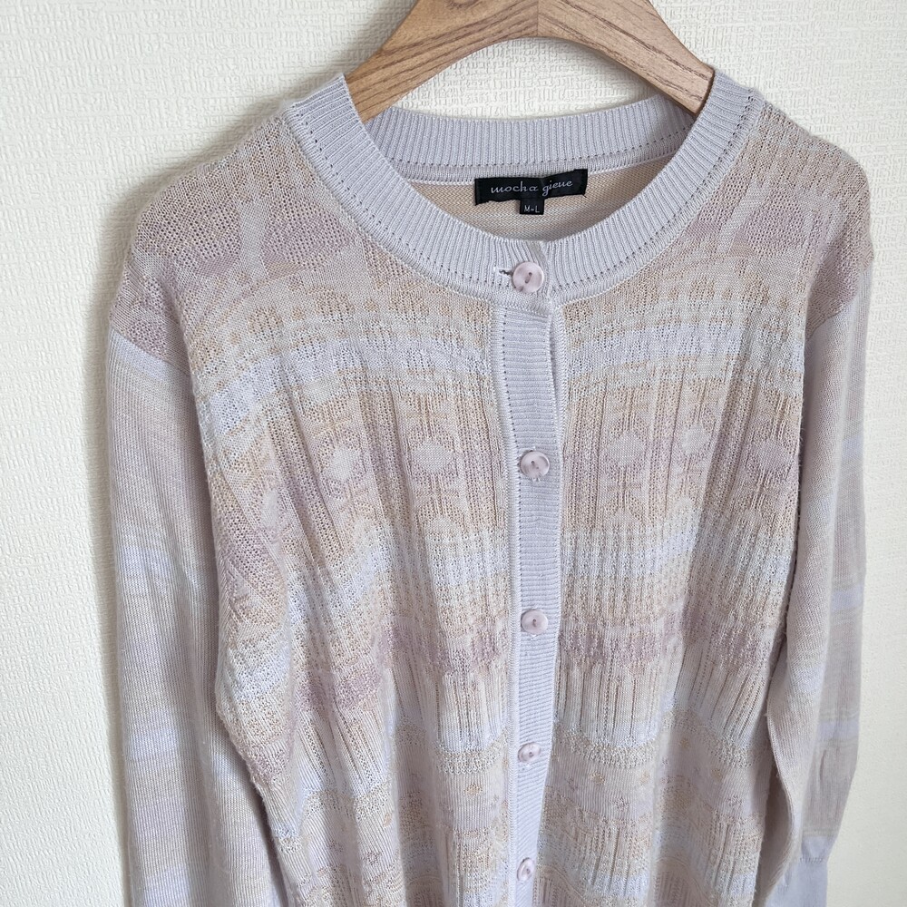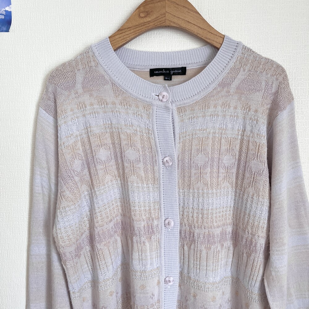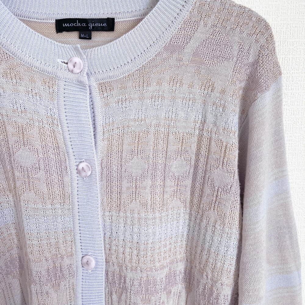 소라색, 연보라색, 분홍색, 살구색이 오묘하게 섞인 가디건으로