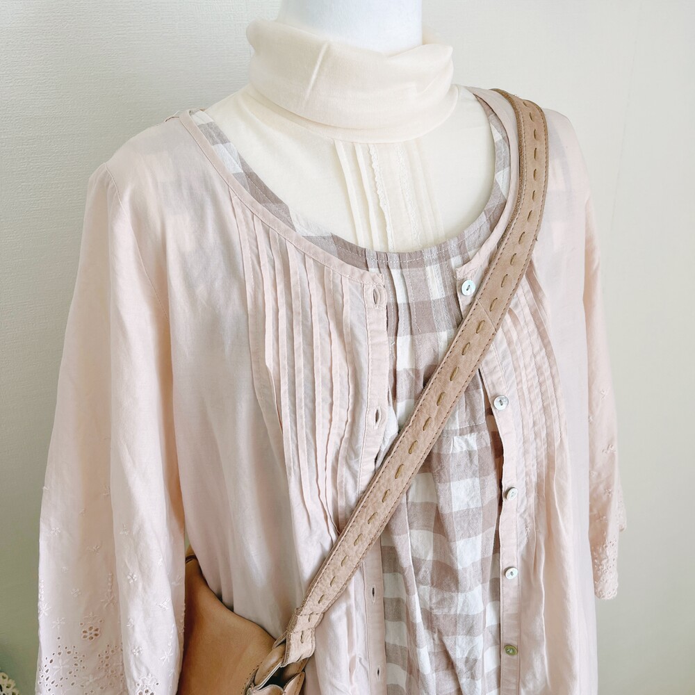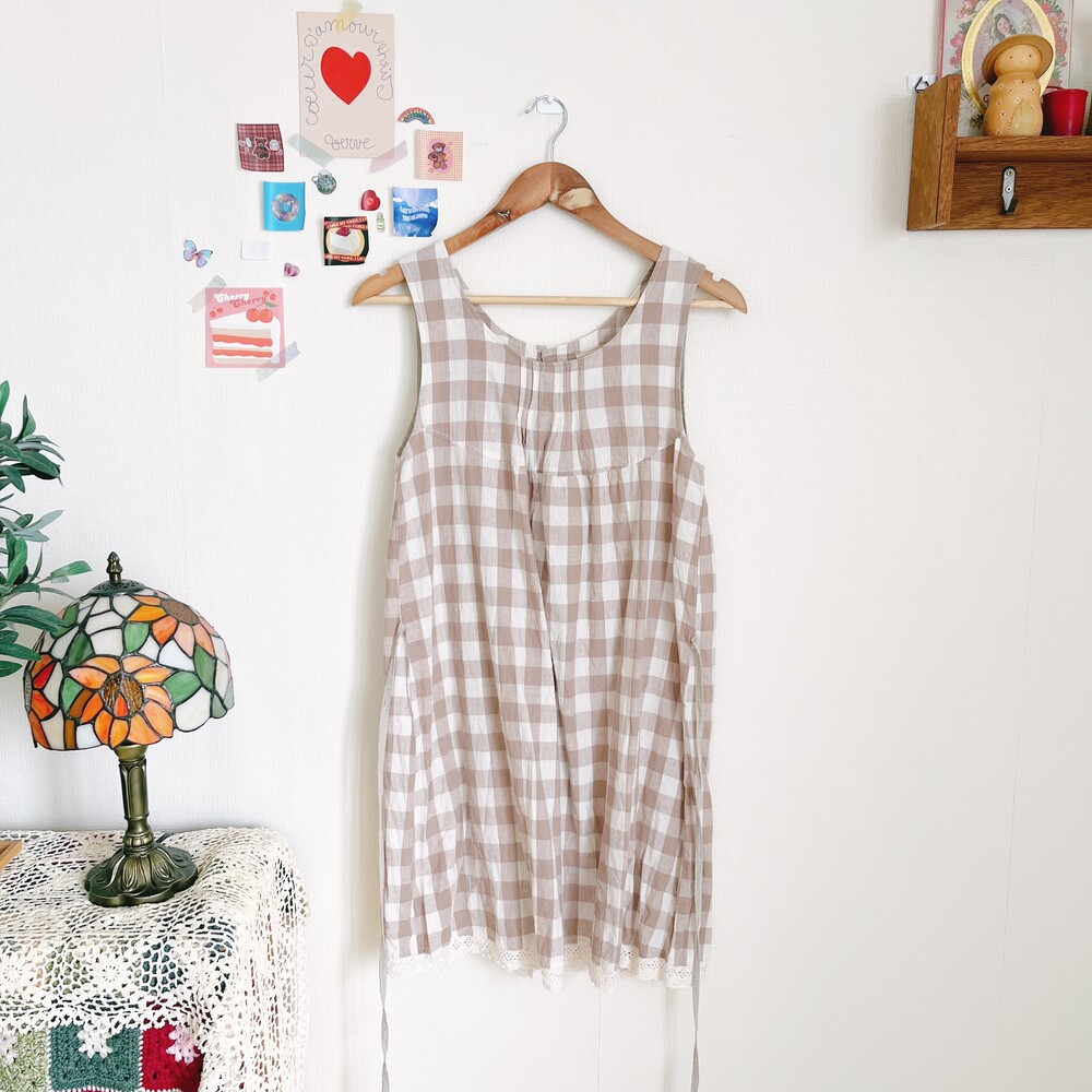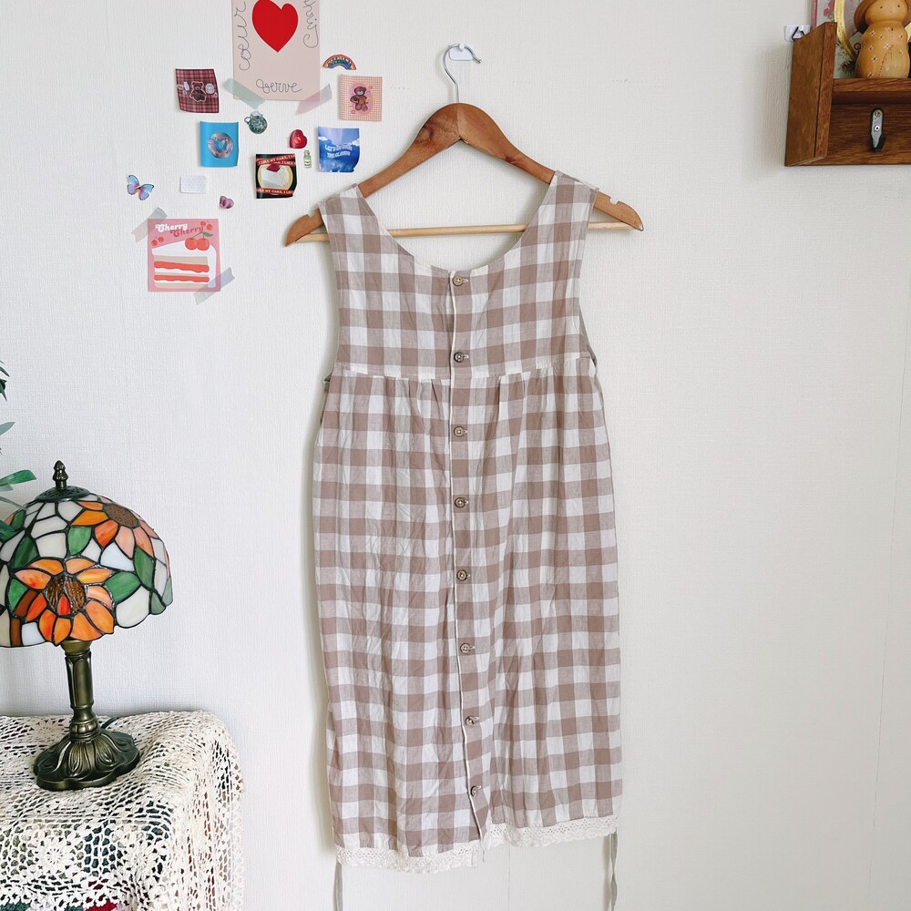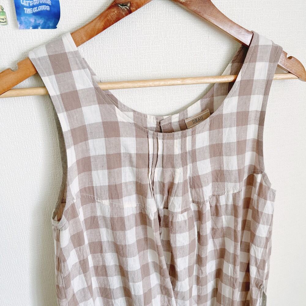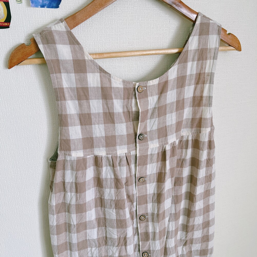 베이지 색감의 체크 백버튼 린넨 코튼 혼방 원피스예요