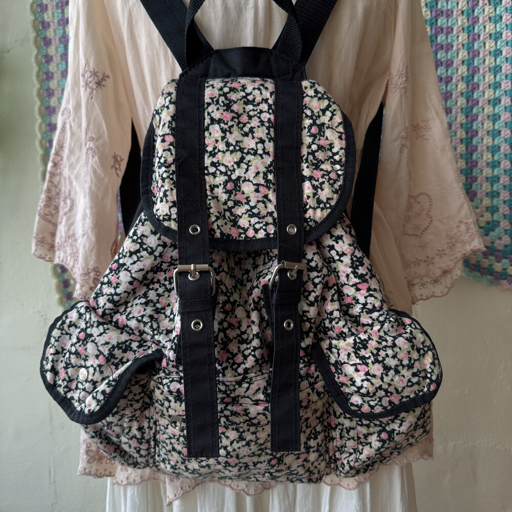 블랙 색감의 꽃무늬 3포켓 백팩이에요