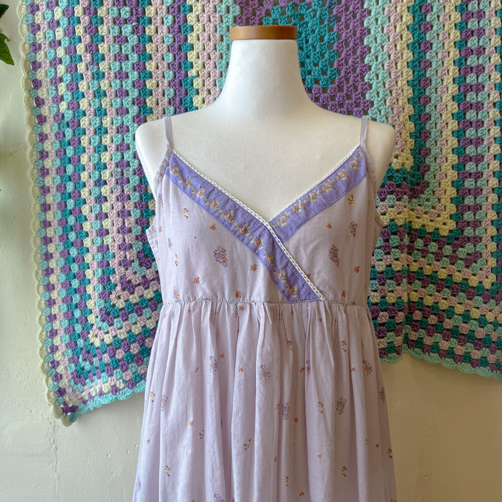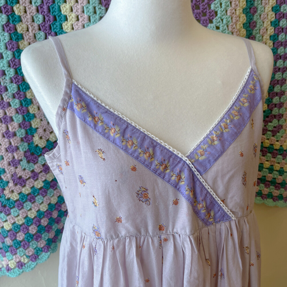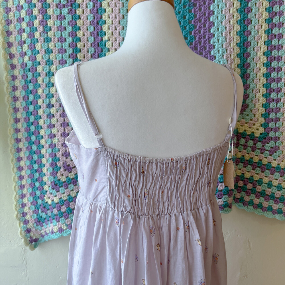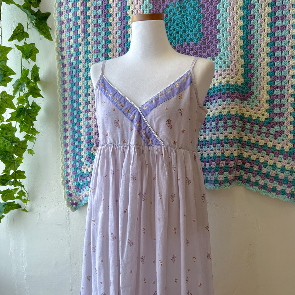연보라색감의 꽃무늬 브이넥 코튼 끈원피스예요