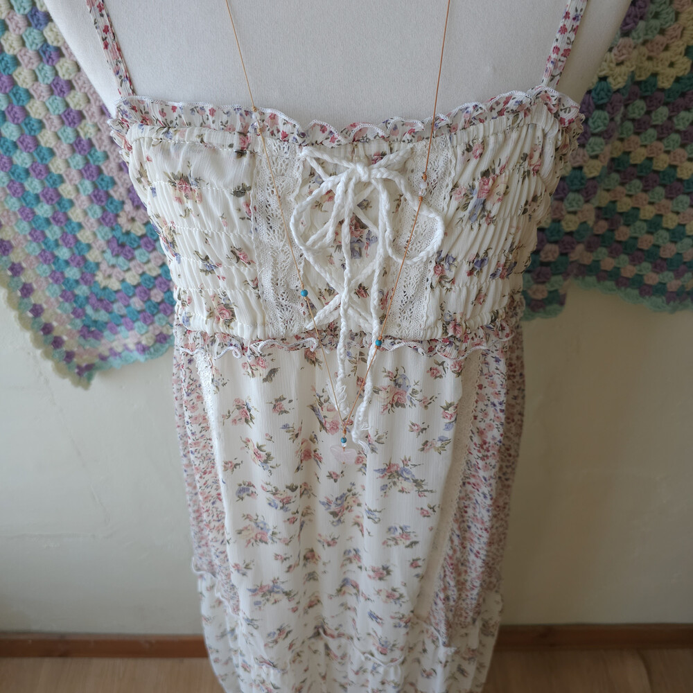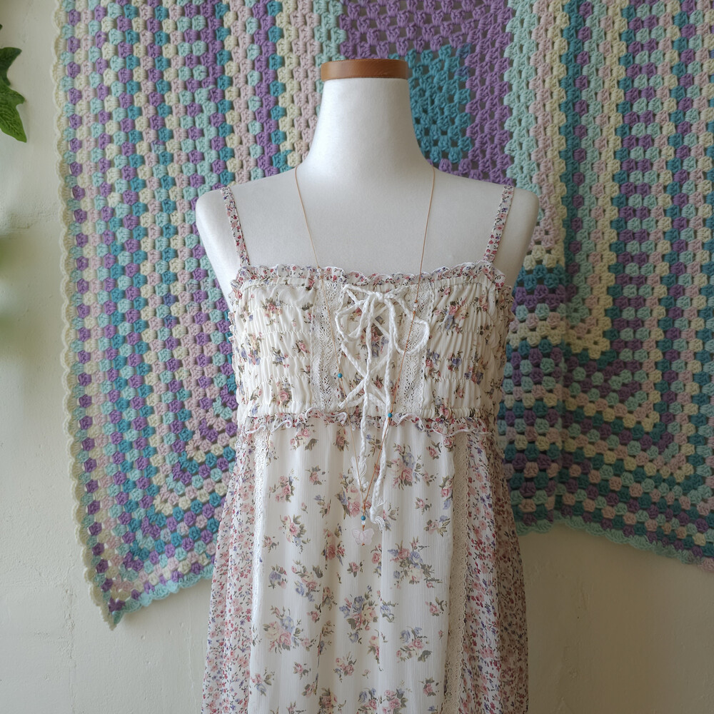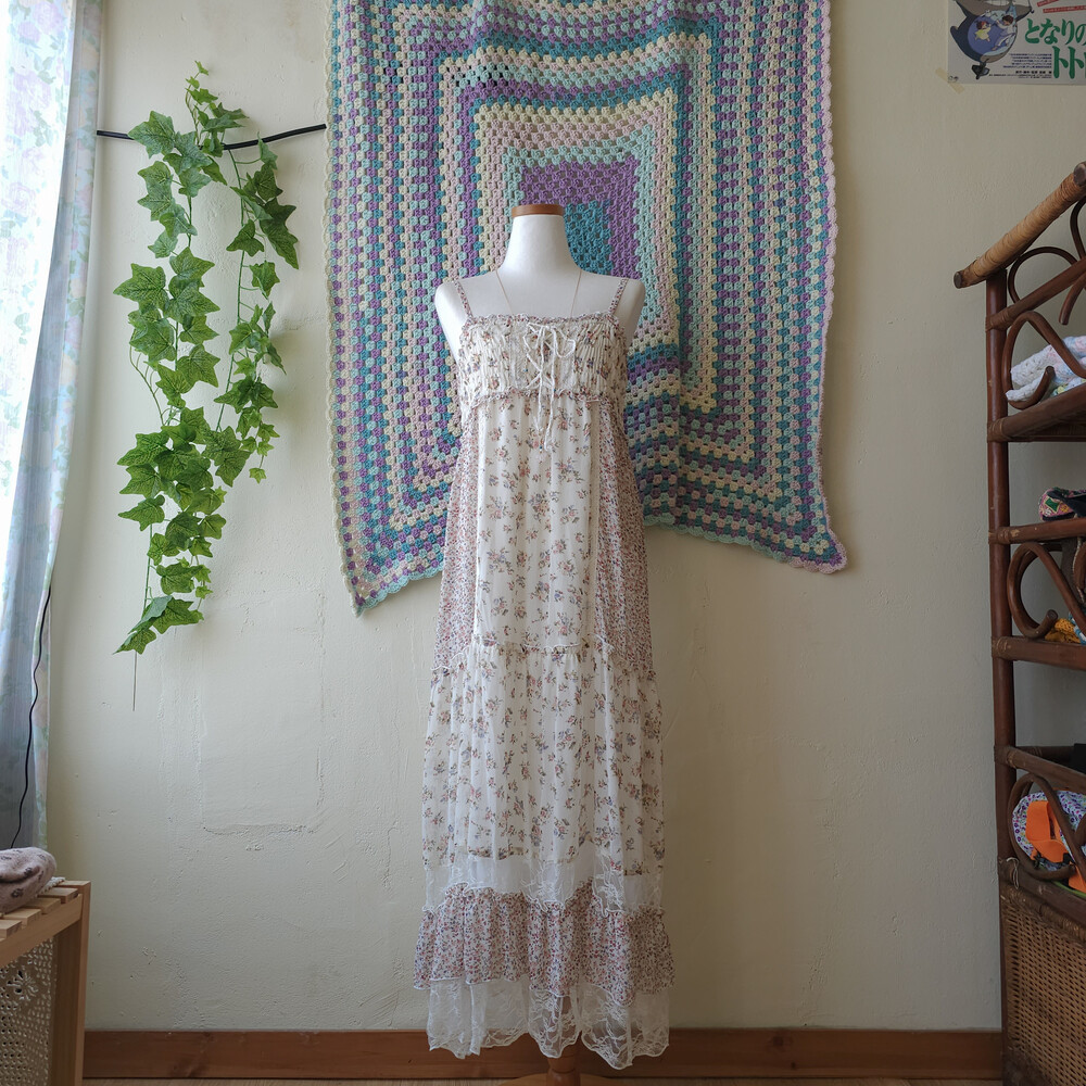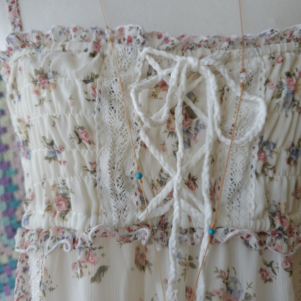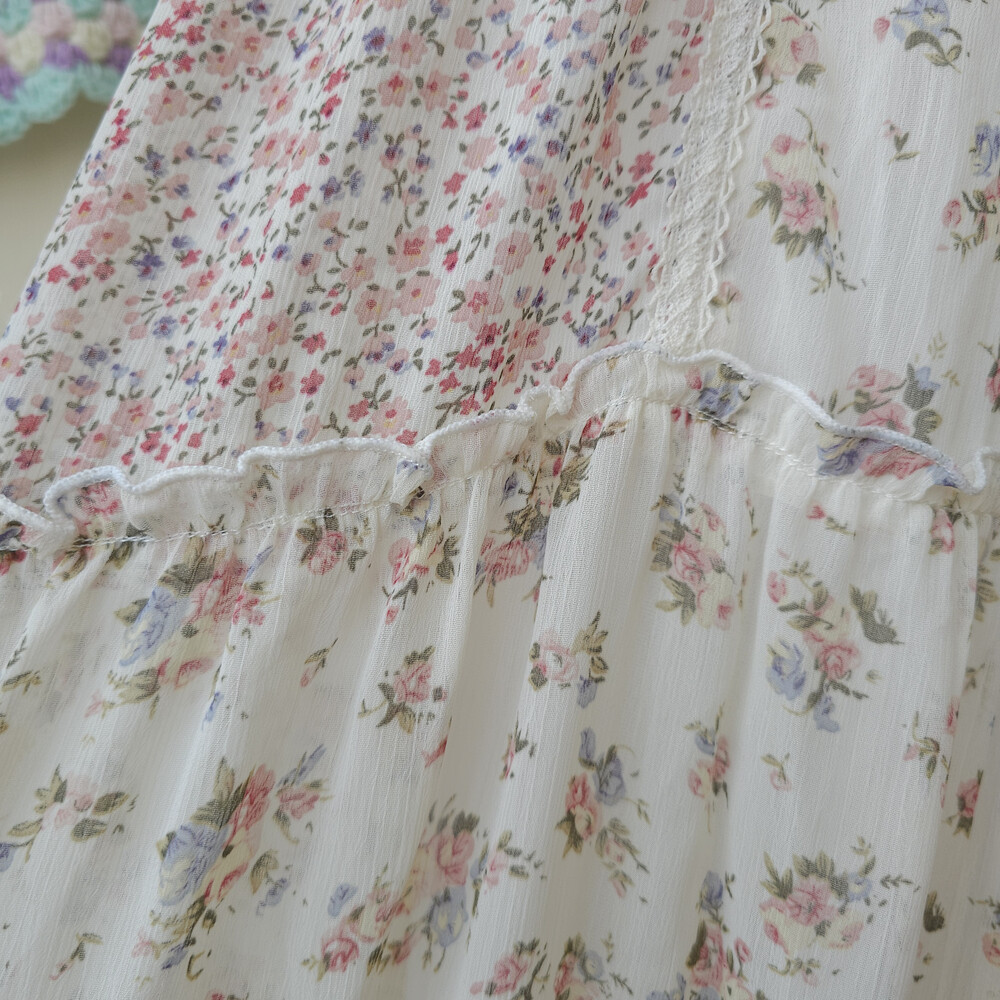 분홍 색감의 잔꽃 패치 쉬폰 끈원피스예요