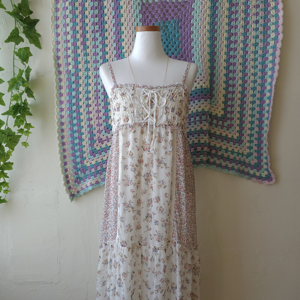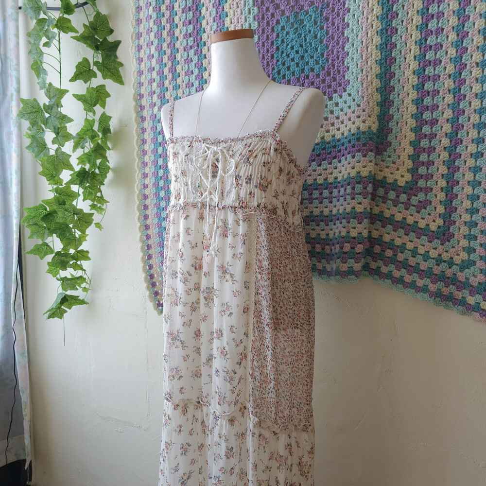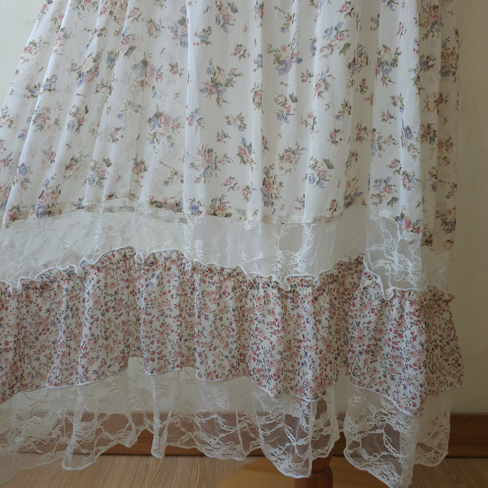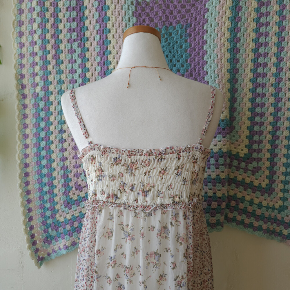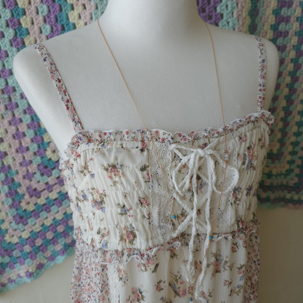 분홍 색감의 잔꽃 패치 쉬폰 끈원피스예요