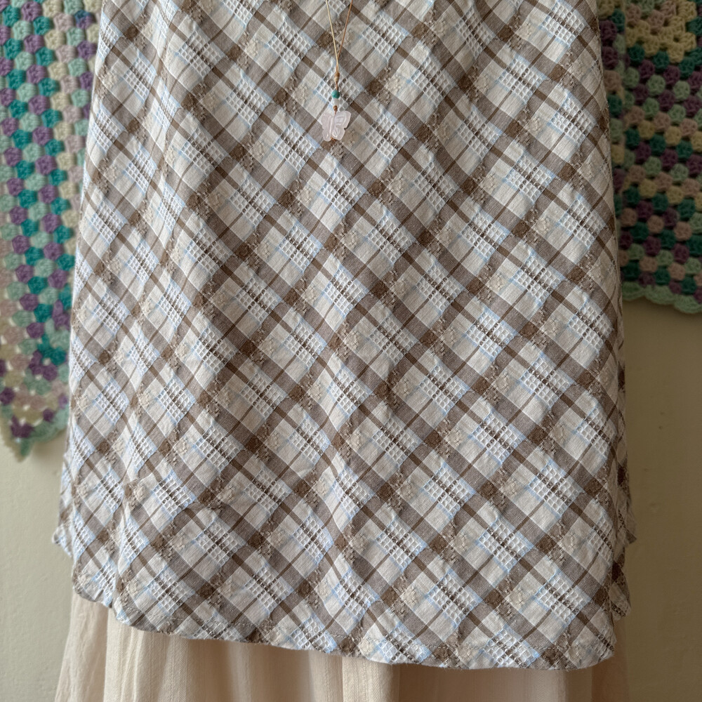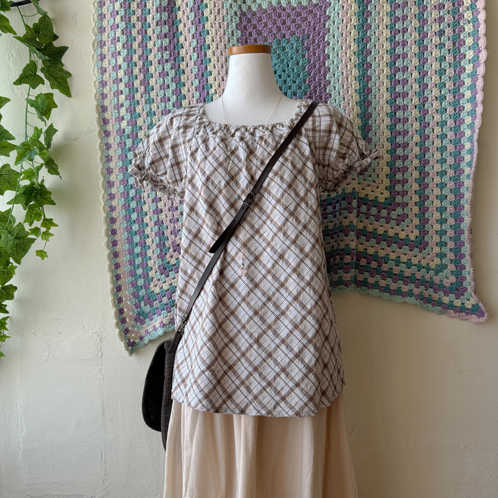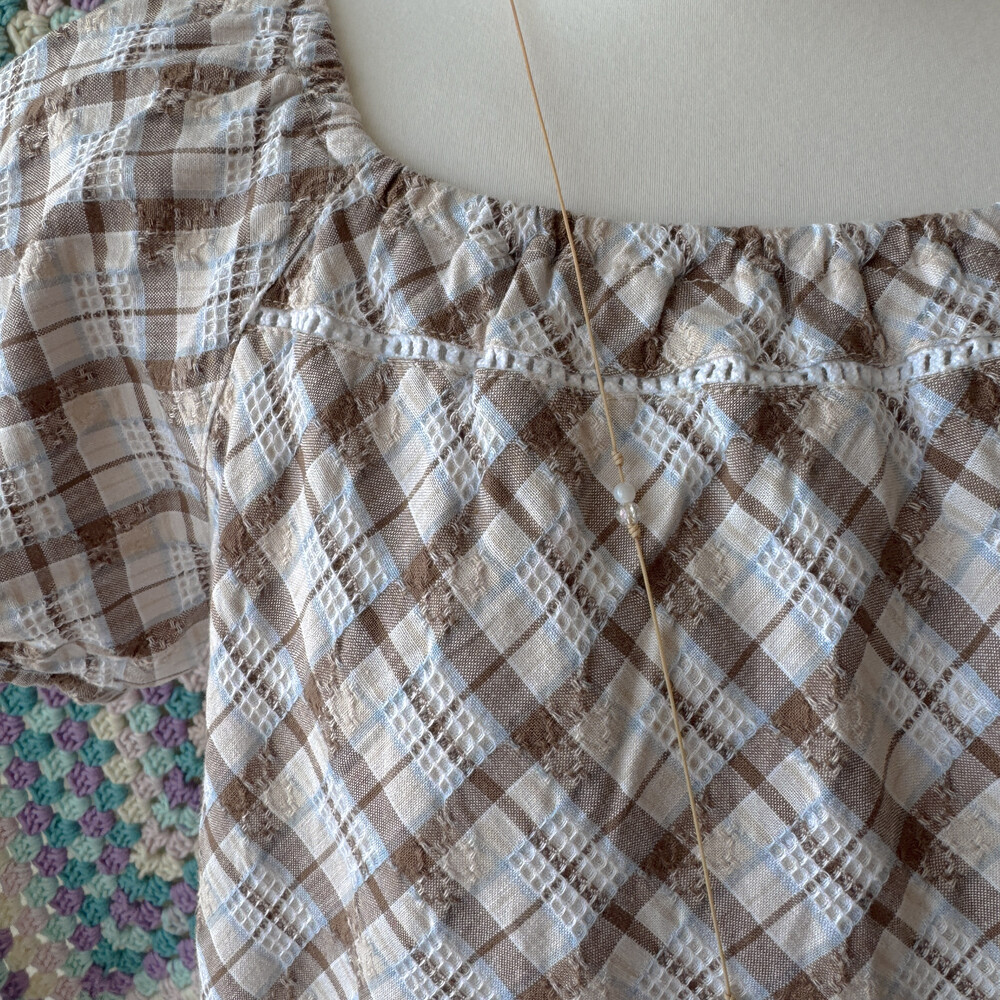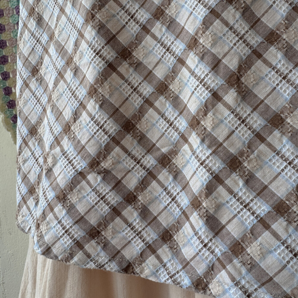 브라운, 블루, 베이지 색감 조합의 체크 블라우스예요